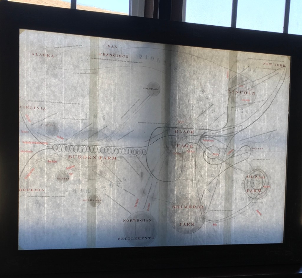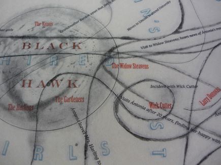 Image of map of My Ántonia reproduced in A Close Read: The Cather Projects (2012) Barbara Tetenbaum and Jennifer Viviano Photos: Books On Books Collection, displayed with permission of the artist.