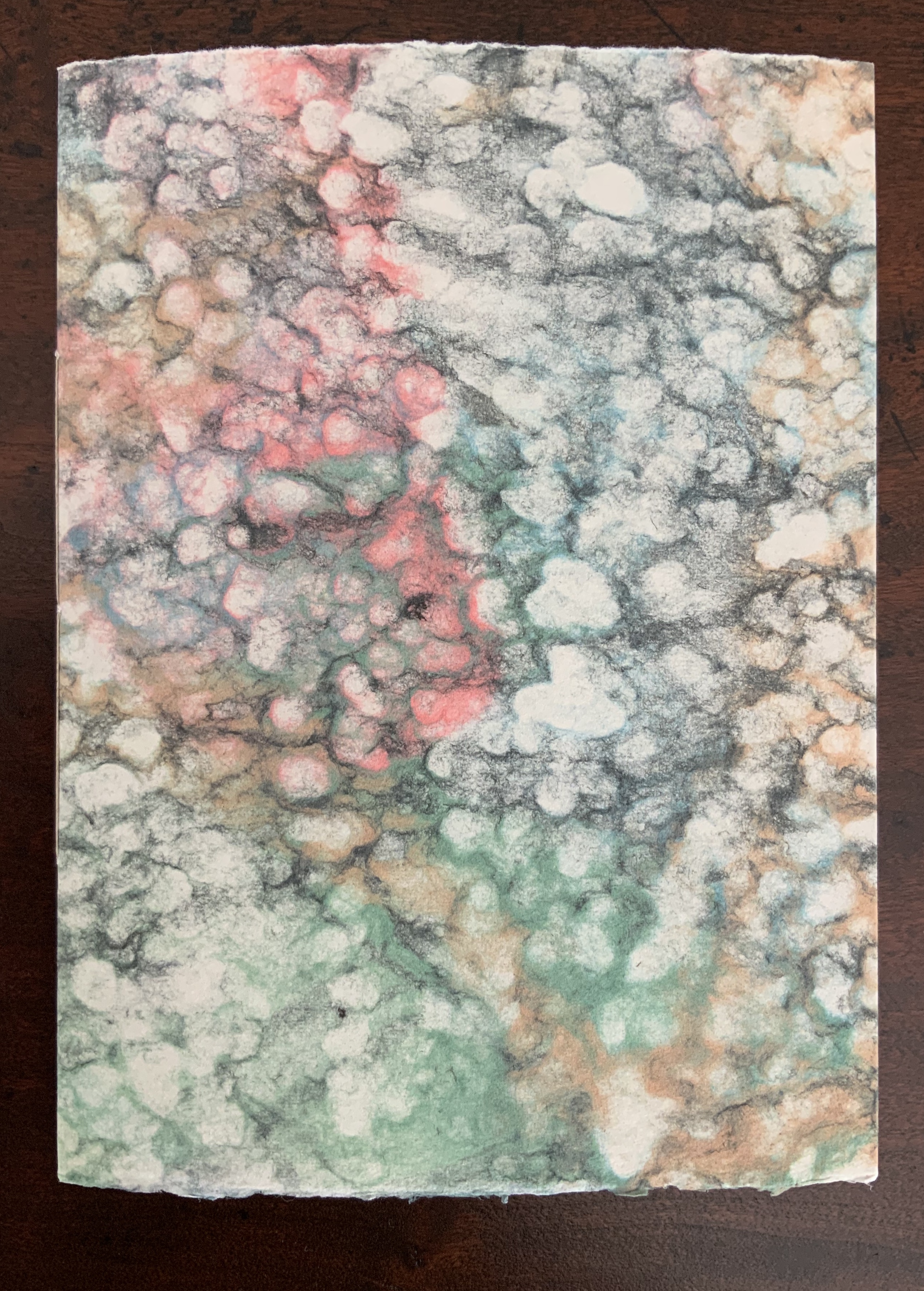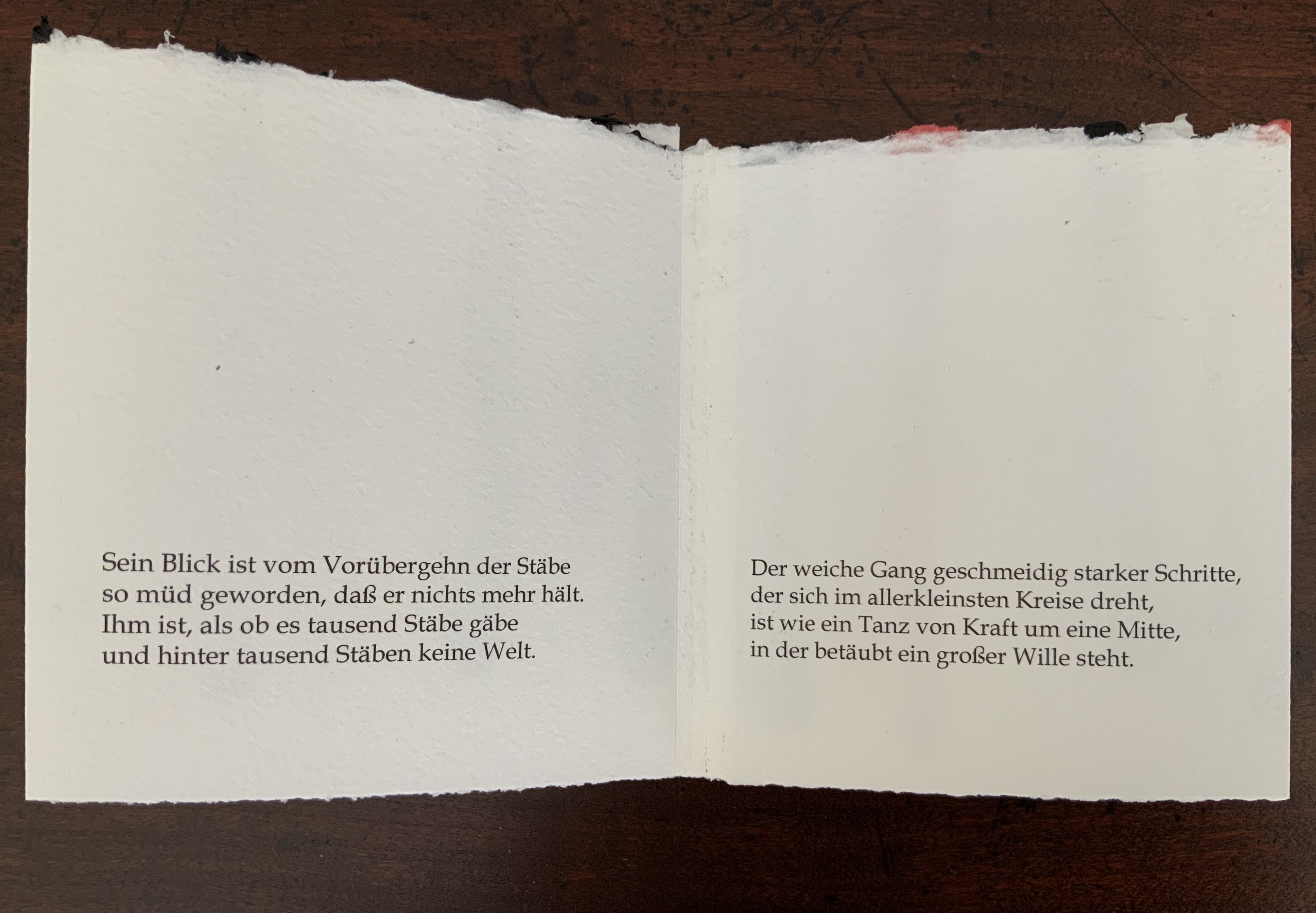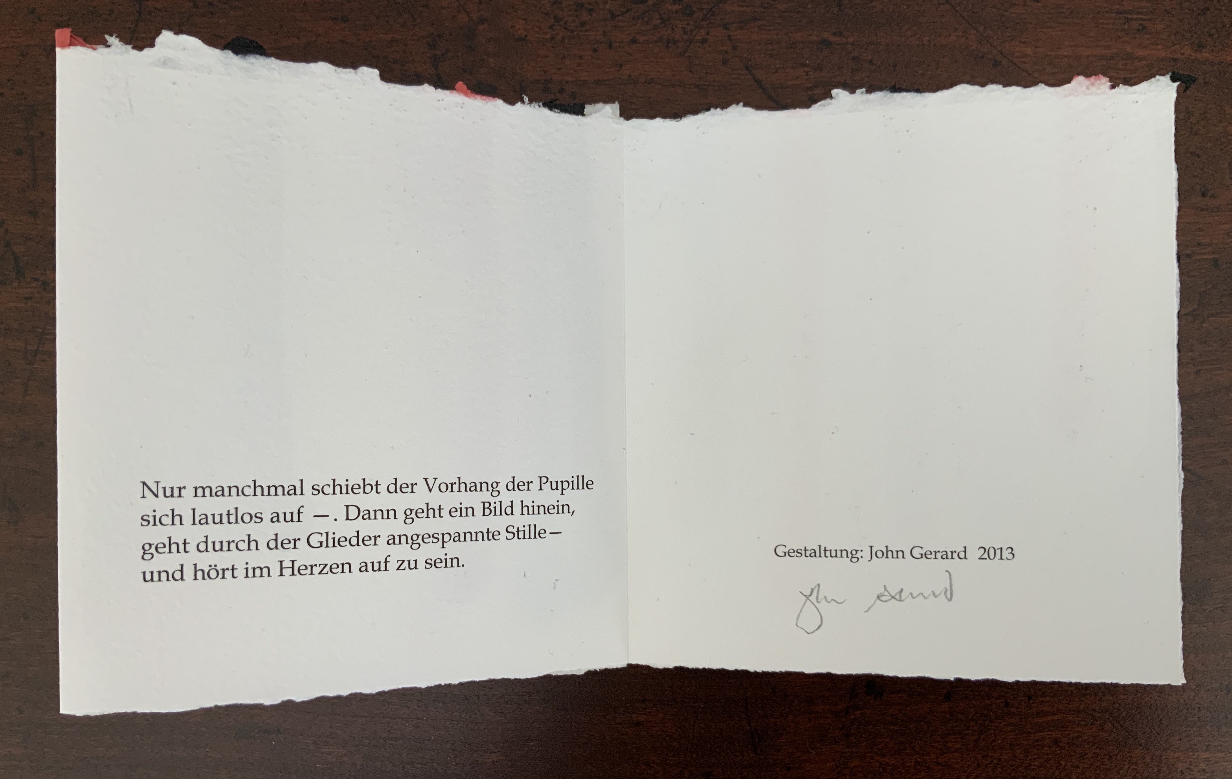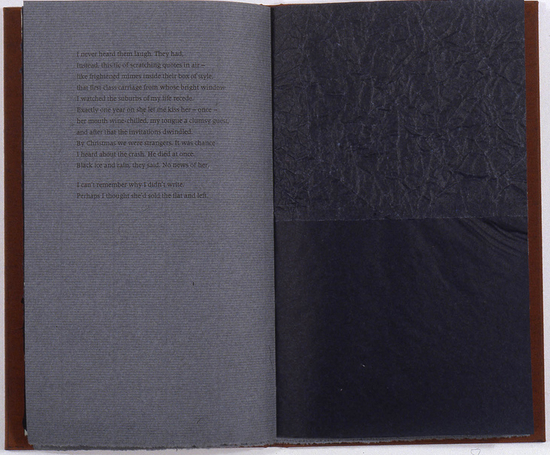 Black Ice and Rain, 2002. Designed, letterpress printed & bound in a limited edition of 50 by Barbara Tetenbaum with assistance from Maki Yamashita and Clare Carpenter. The type is handset Meridien; the paper, Hahnemühle Ingres; the interleaved collages were made using an abaca paper handmade by Katie MacGregor of Whiting, Maine.