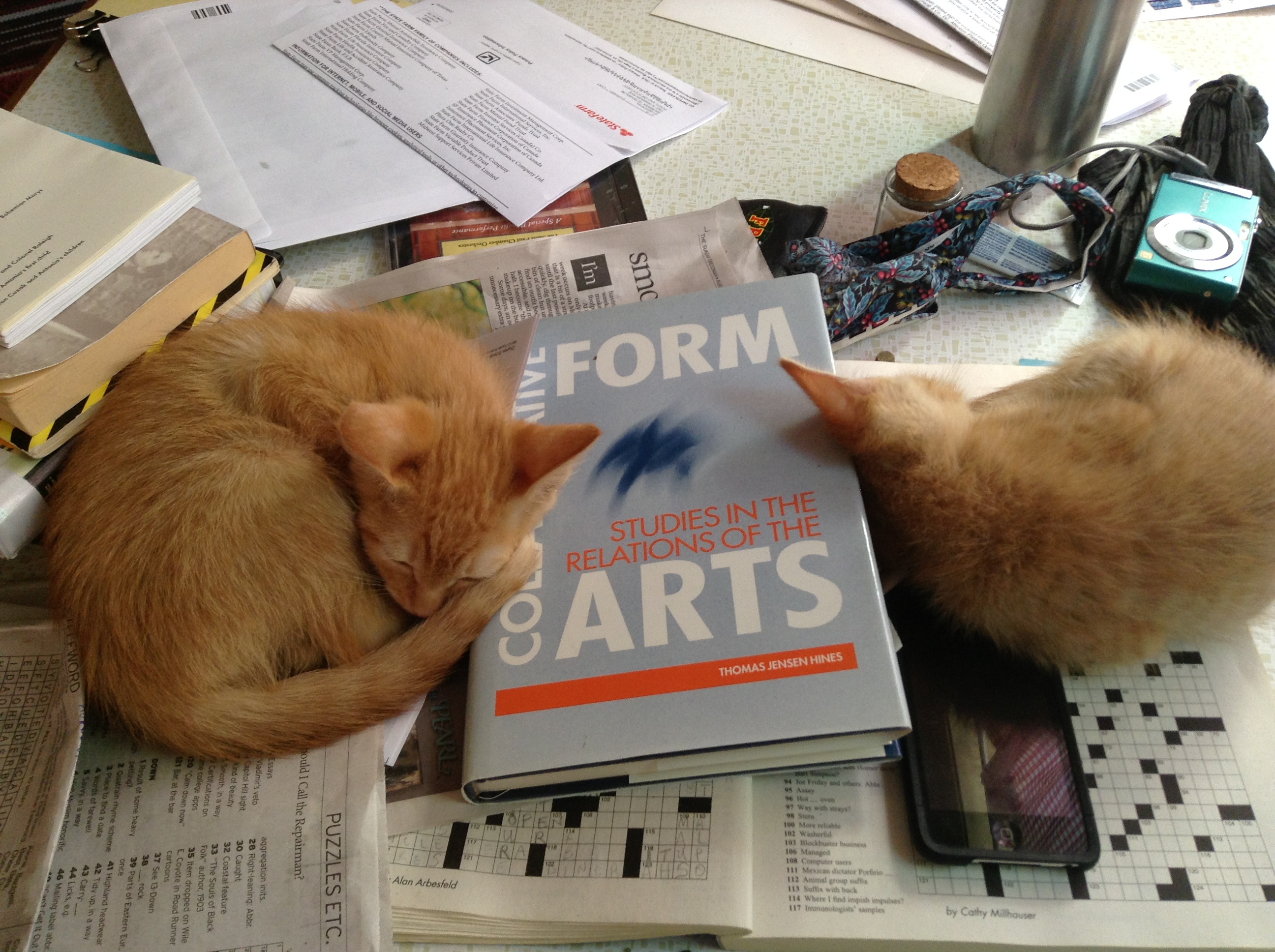 BT: When I’m working on a project, books are everywhere, on all surfaces. [In the] photo of my new kittens hanging out on my kitchen table [you can] see all the books that I was referencing as I worked this week on a new quick Cather project (creating a visual score for My Ántonia). Books are either direct source material, or they are reminders of a standard of design, or palette of colors, or format, or mix of materials, etc., that I want to influence this particular project. Buzz Spector gave an interesting talk a year or so ago on the artist’s library relationship to their studio practice. I like this image of the fluid interaction between the studio and the library.