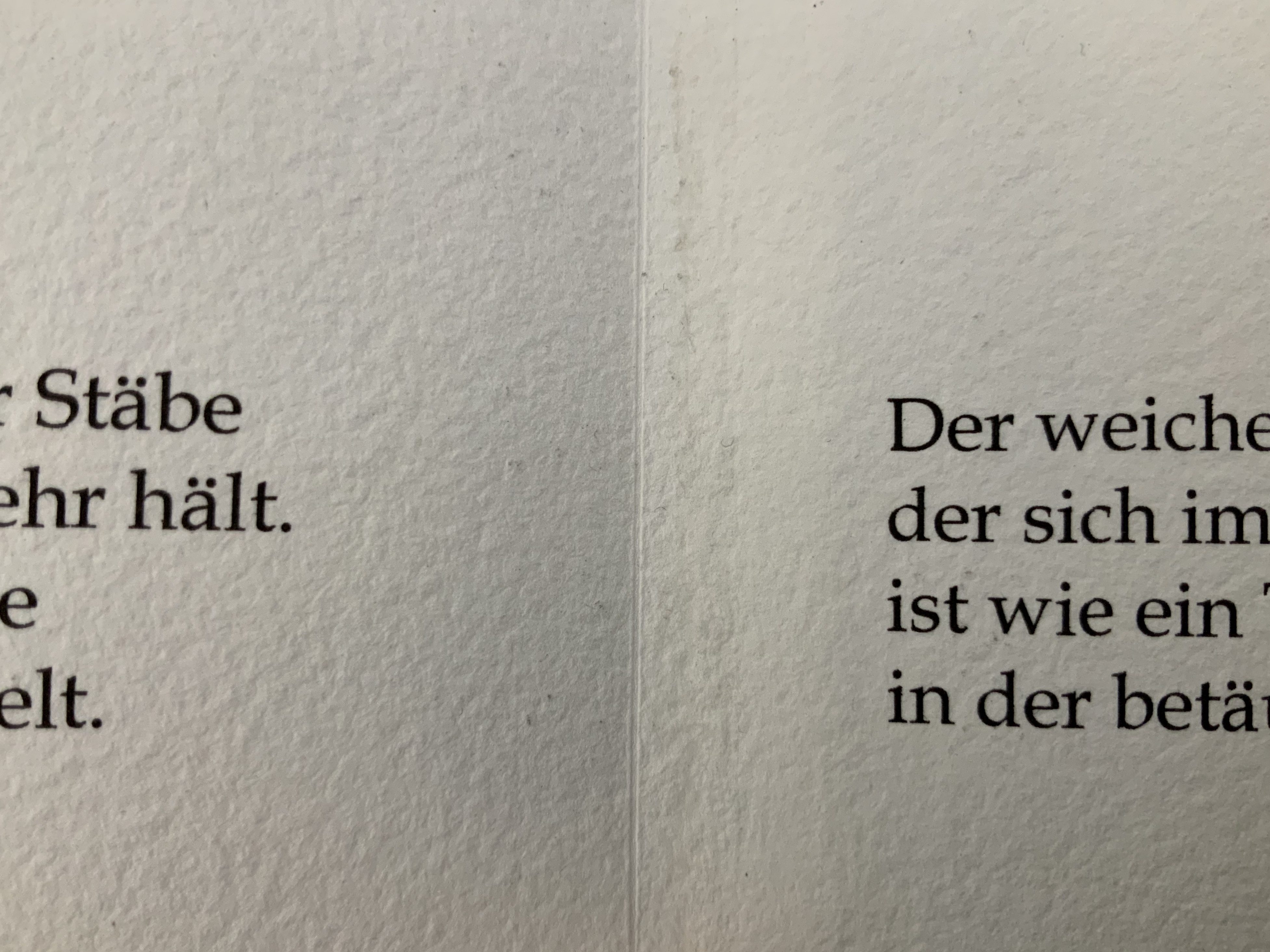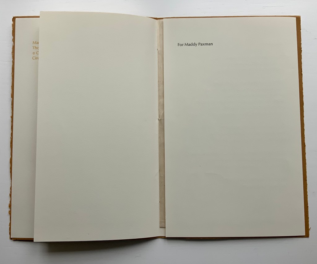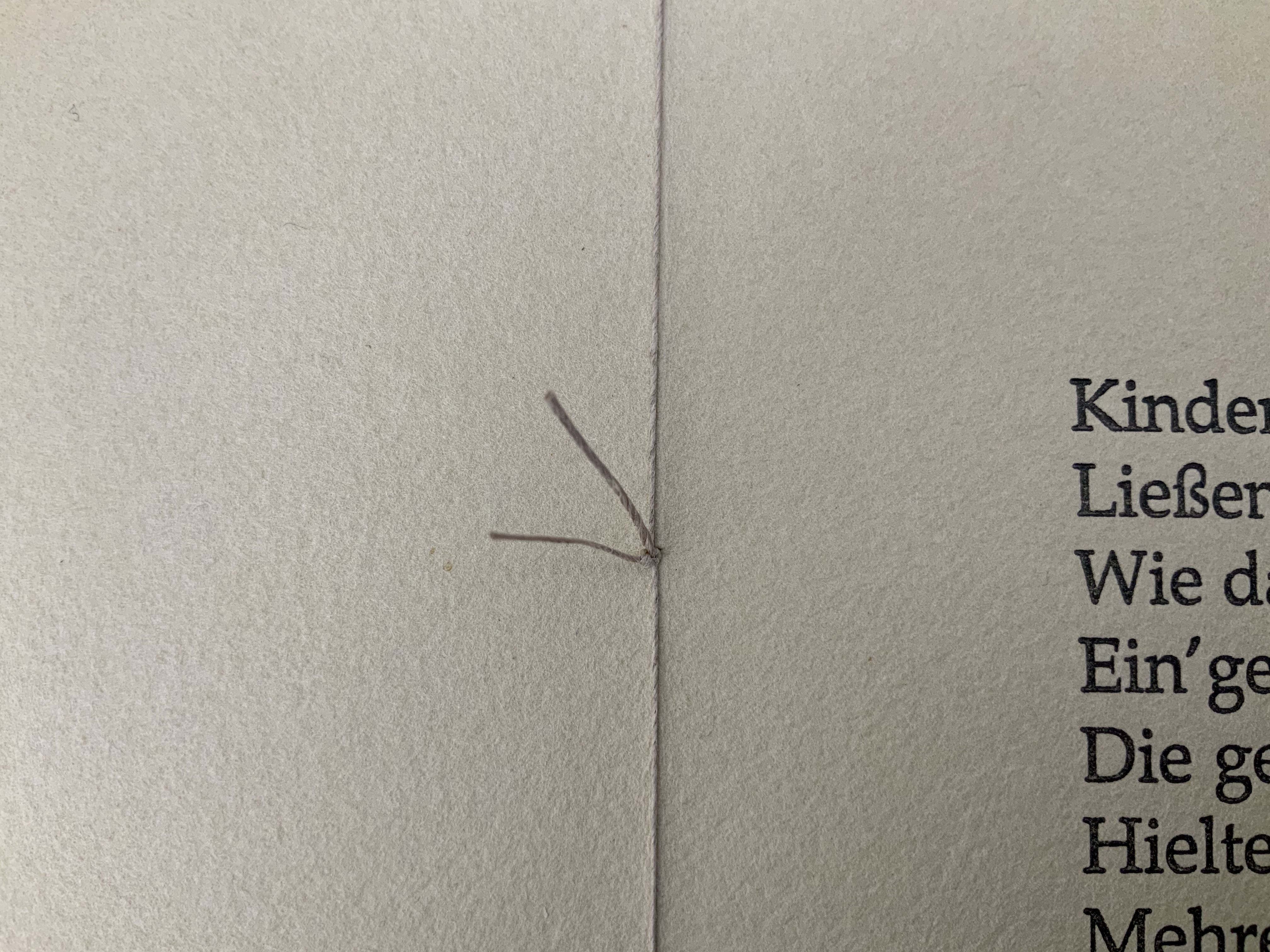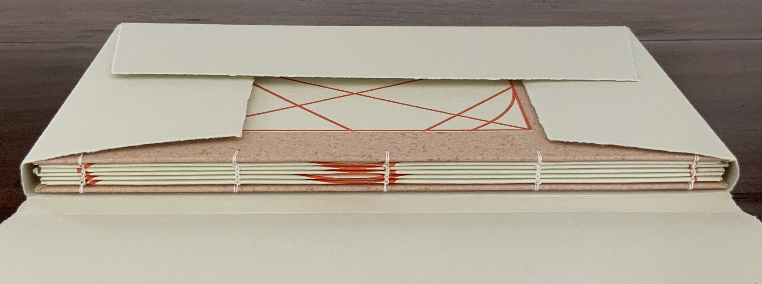 The booklet’s structure recalls that of O’Ryan’s Belt: Eleven Poems: 1990-1991 by Michael Donaghy (see above). The spine consists of inward folds of the front and back covers. Internally (see below) two sets of signatures are sewn together through the inward-folded tabs.