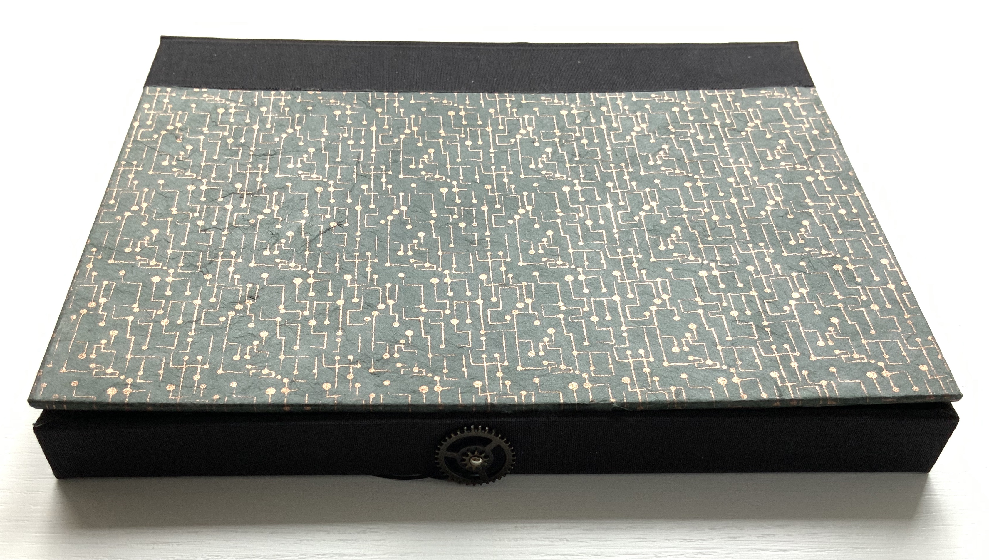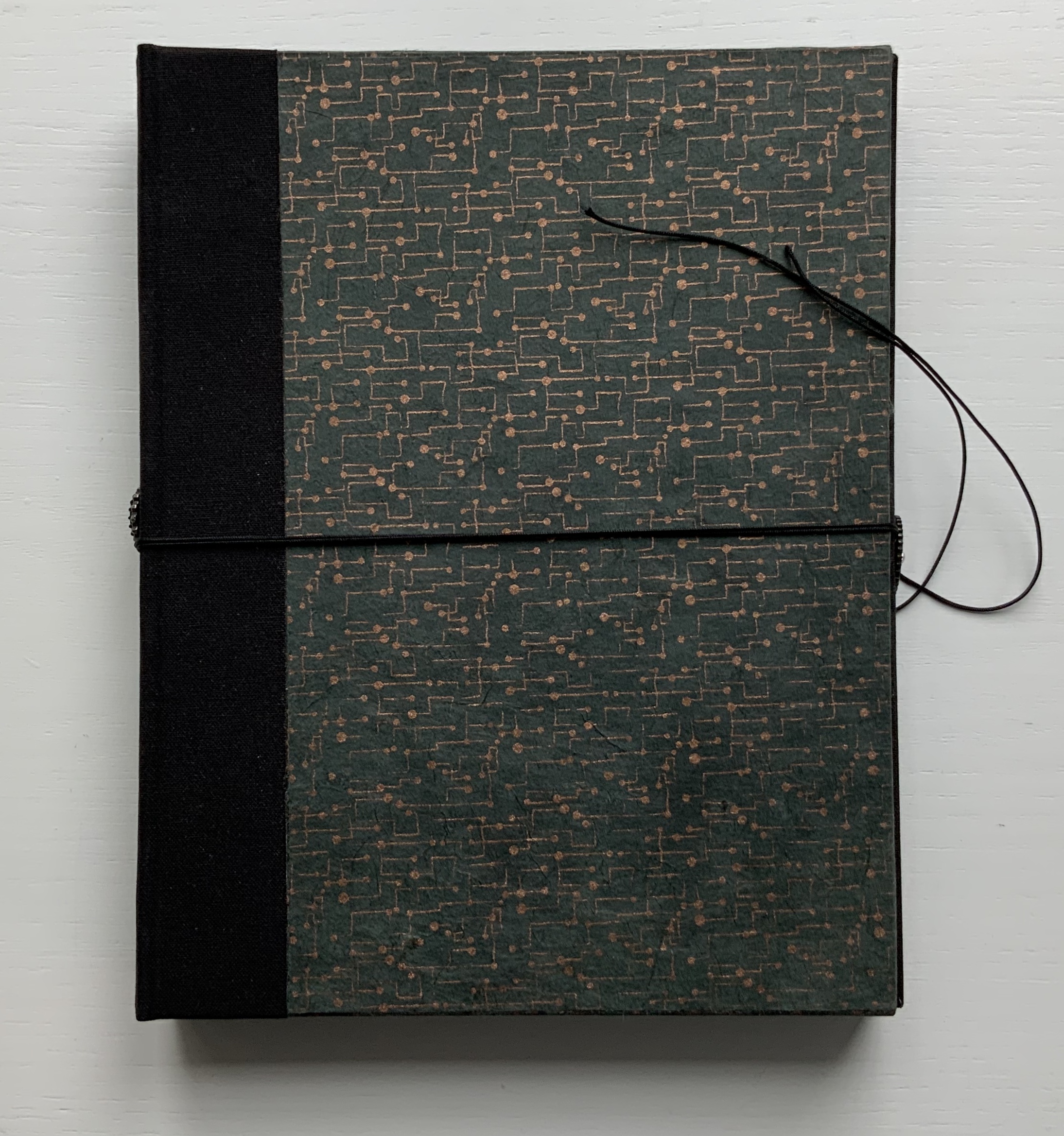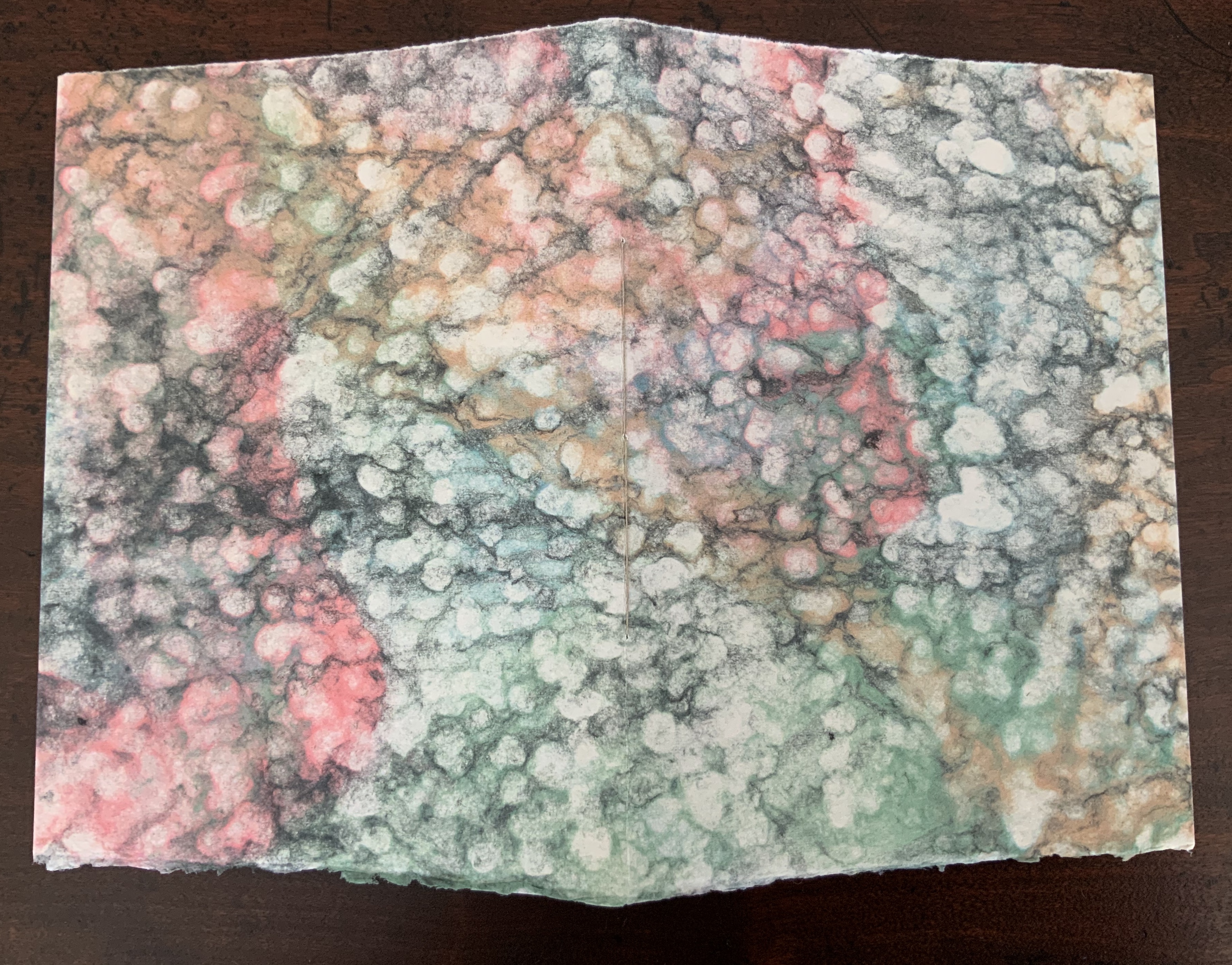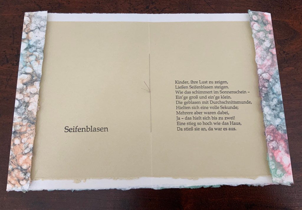 There are seven “pages” to this work, each sewn to green book cloth panelled with wooden slats and backed with gampi. The first page carries Donaghy’s sestina, each line letterpress printed on a strip of paper pasted to gampi paper. Less wide than the sestina page and shorter than the third, the second page shows an etching image of waterspouts rising from a body of water with mountains in the background. Less wide than the second page and shorter than the fourth, the third page consists of narrow, evenly sized white strips of paper pasted on gampi. The fourth page, slightly wider than the preceding page but still shorter than the following, offers the school-book-like statements:
