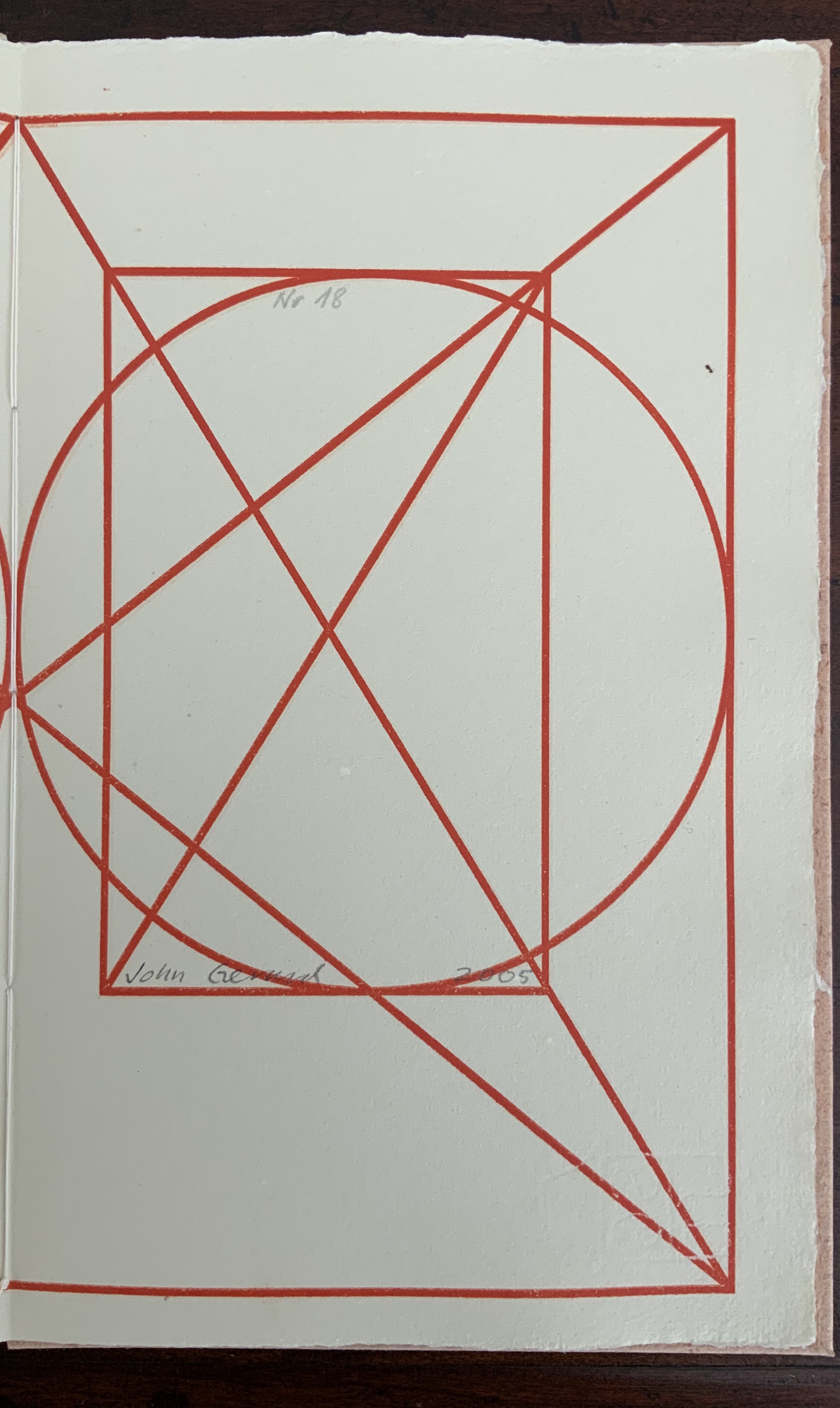 Half-Life (2005) is the collection’s representative codex by Tetenbaum. A catalogue raisonné for works between 1978 and 2005, with a chronology of the artist’s life and an appreciation of her work from Uta Schneider, the book reveals several of the influences on Tetenbaum’s development, including Ron King (as noted above) and Walter Hamady (evident particularly in the Co-Pilot broadside). Tetenbaum is generous in her collaborations and acknowledgments. Although closer to a fine press edition than anything produced by Dick Higgins, Half-Life notes in its colophon the influence of his FOEW&OMBWHNW (New York: Something Else Press, 1969).