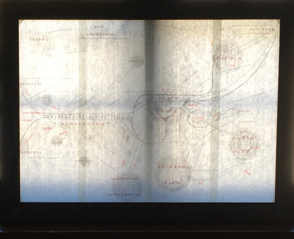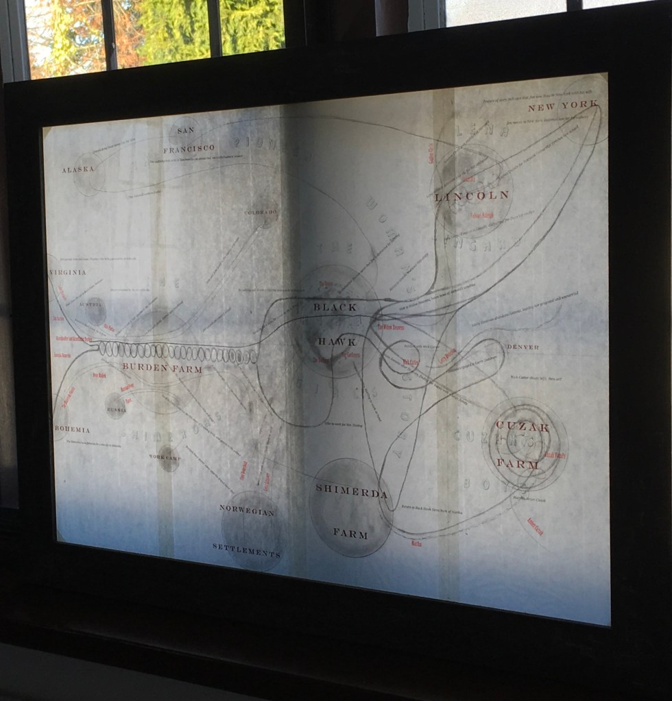 For a body of work realized after Half-Life, Tetenbaum spent a month in a gallery listening to a recording of Willa Cather’s 1918 novel, My Ántonia. The result was two installations and two publications: a catalogue called A Close Read: My Ántonia (2010) and an “artist’s book” or “bookwork” called Mining My Ántonia: Excerpts, Drawings, and a Map (2012). The collection currently includes only the map and the catalogue. Some work in this category of “response to literary material” can be primarily craftwork — as in those well-known narrative scenes sculpted from the pages of the book in question. Other responses to books — including altered books — stand as works of art yielding depths of meaning and aesthetic response on their own.