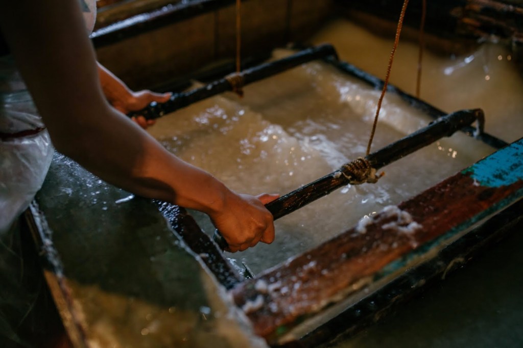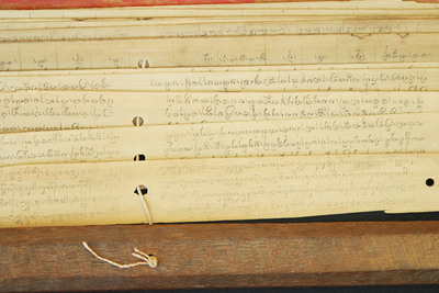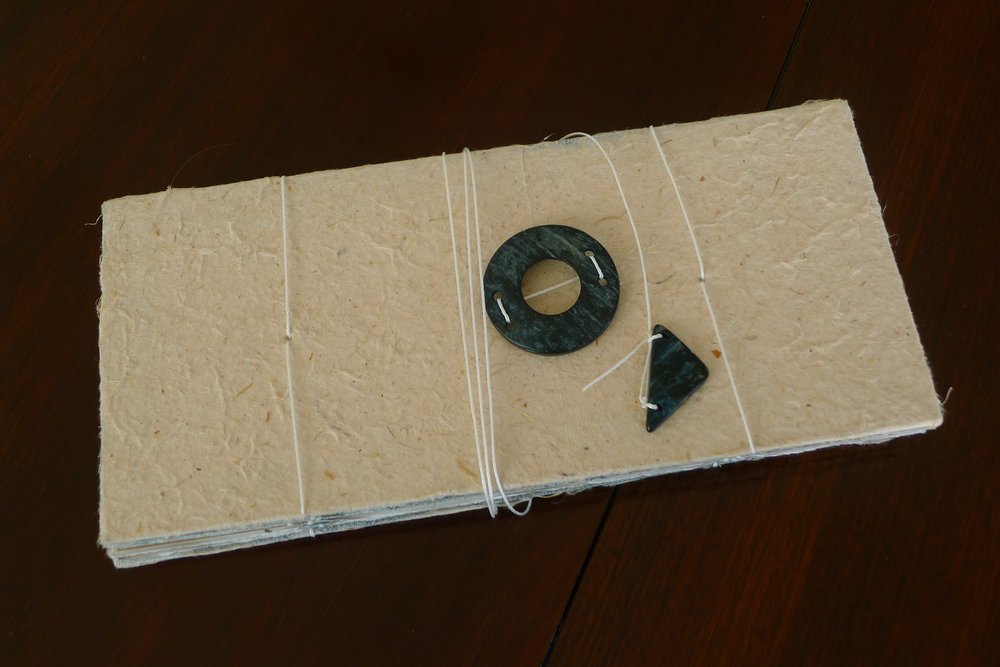 The container consists of the densest and darkest paper and, at one time, had a box-like shape held closed by string at its four corners. There is a barely perceptible hole in the upper left corner of the container’s cover.