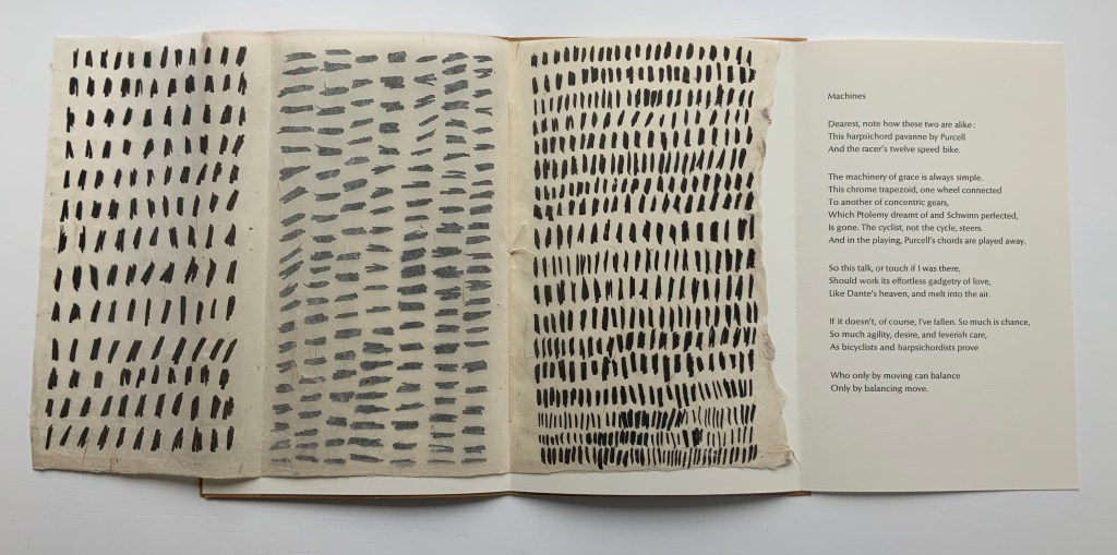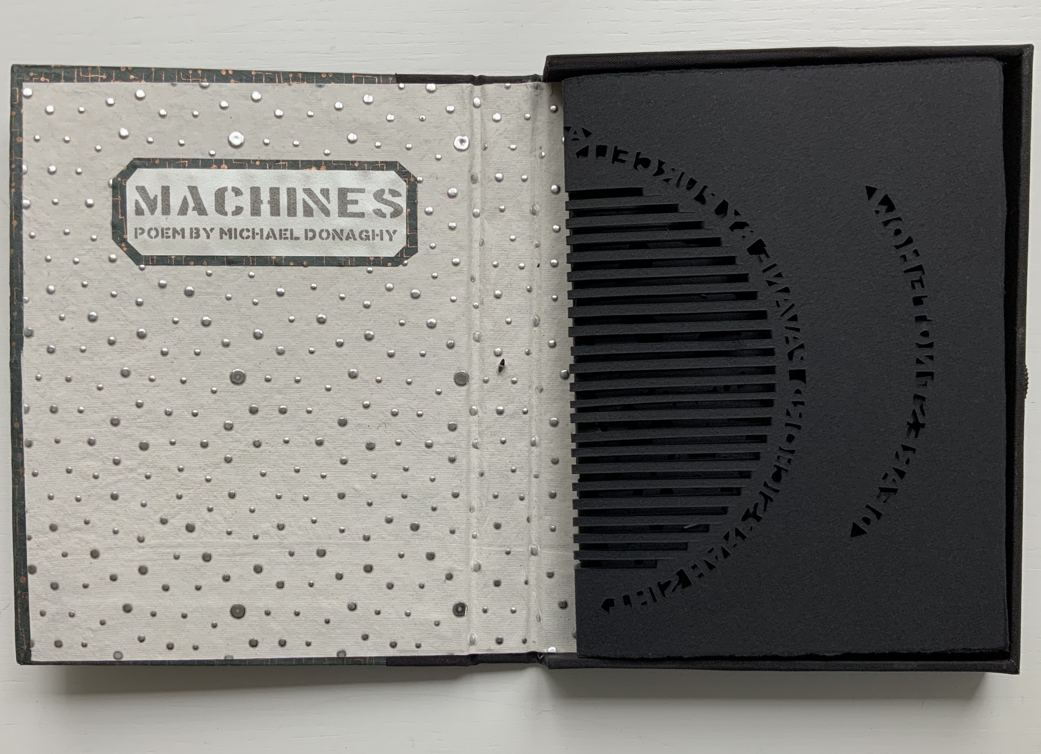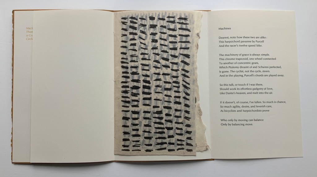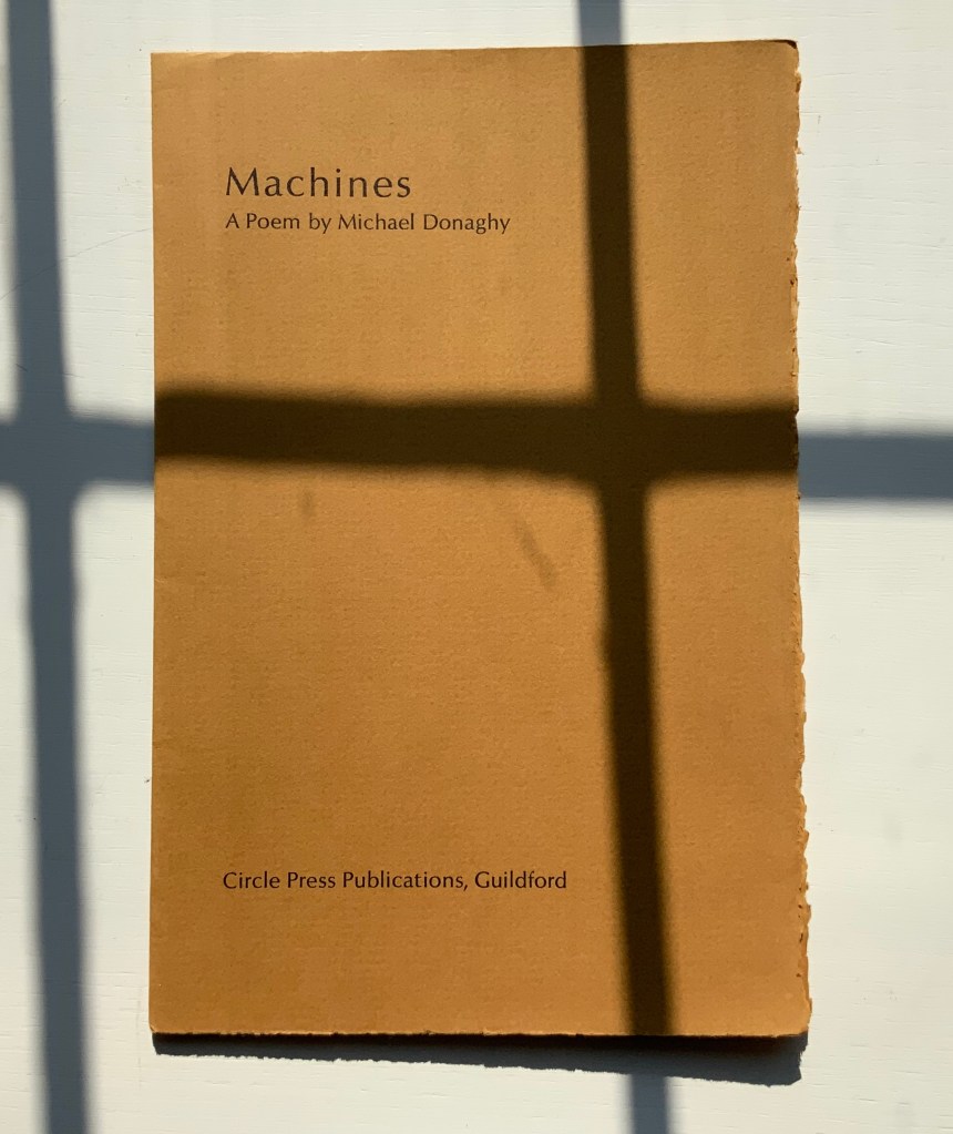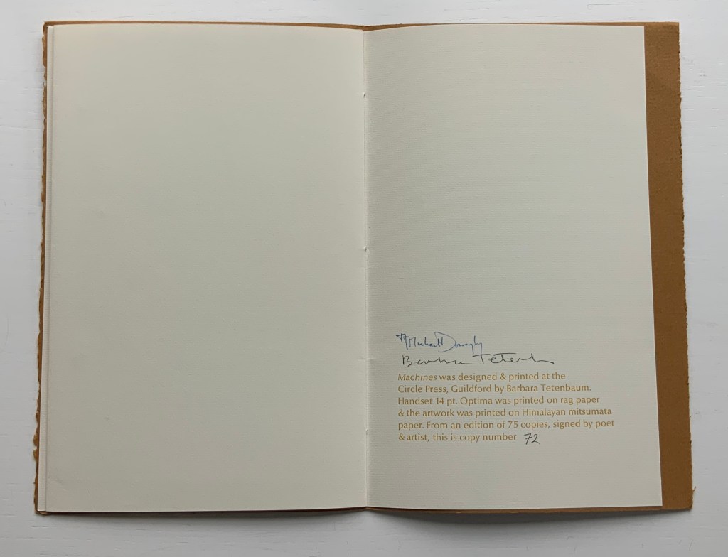 The broadside and chapbook forms seem to be both a rite of passage and a pastime of pleasure for book artists. For Tetenbaum, it has been both of these and a rite of remembrance of friendship. During Tetenbaum’s time at Circle Press, founded and run by UK artist Ron King, she reconnected with Chicago friends poet Michael Donaghy and his wife Maddy Paxman, who had moved earlier to London. Understandably taken with his poetry, she chose his “Machines” when King offered her the chance to set and print anything she liked while King and his wife were away on vacation.