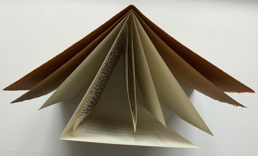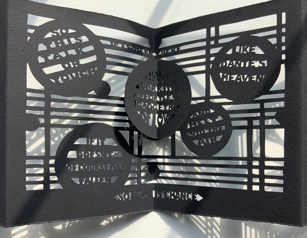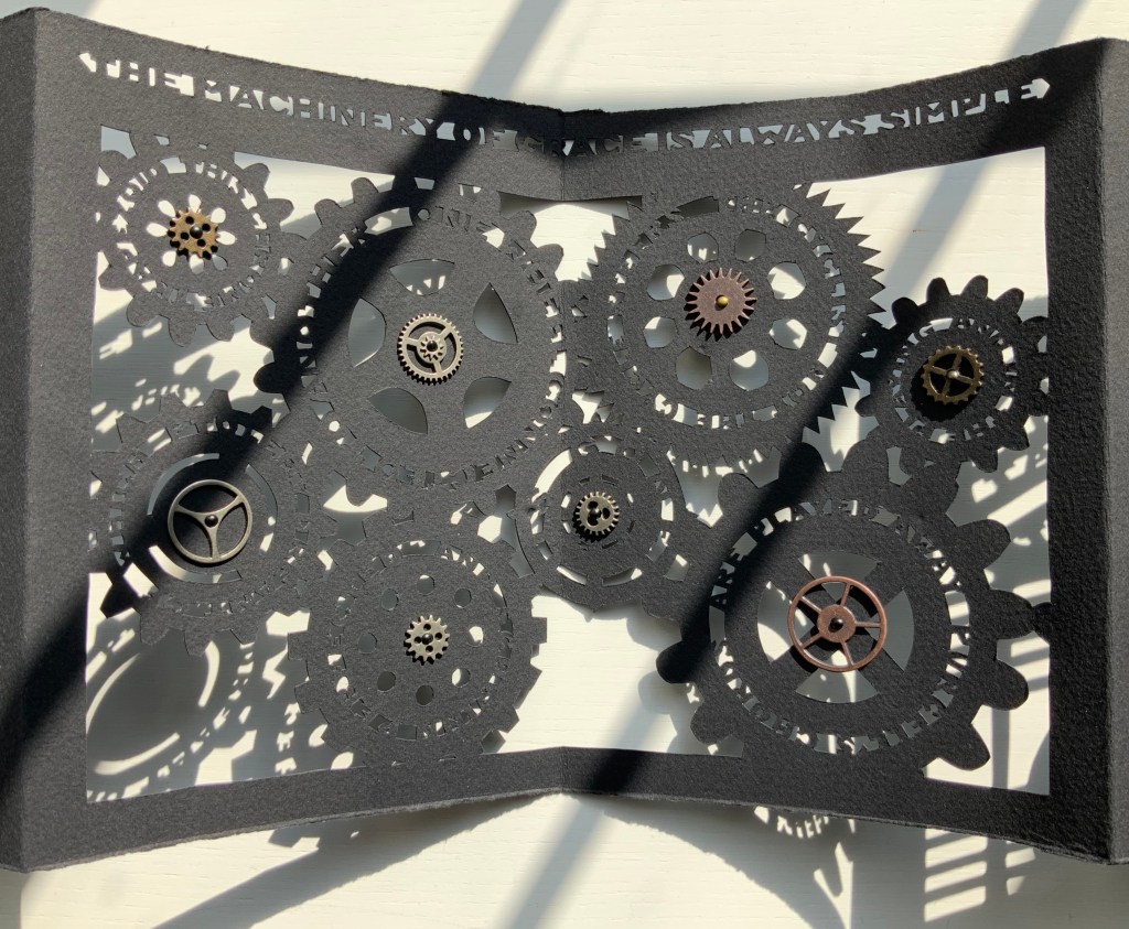 Sacred Space(2003) is an intimate monument of book art. Made intimate by the content and texture of its book, made more intimate by the viewer’s having to construct the chapel. Made monumental by the echo of typographic history, made more monumental in Galileo Galilei’s echo from its floor: Mathematics is the alphabet with which God has created the universe.