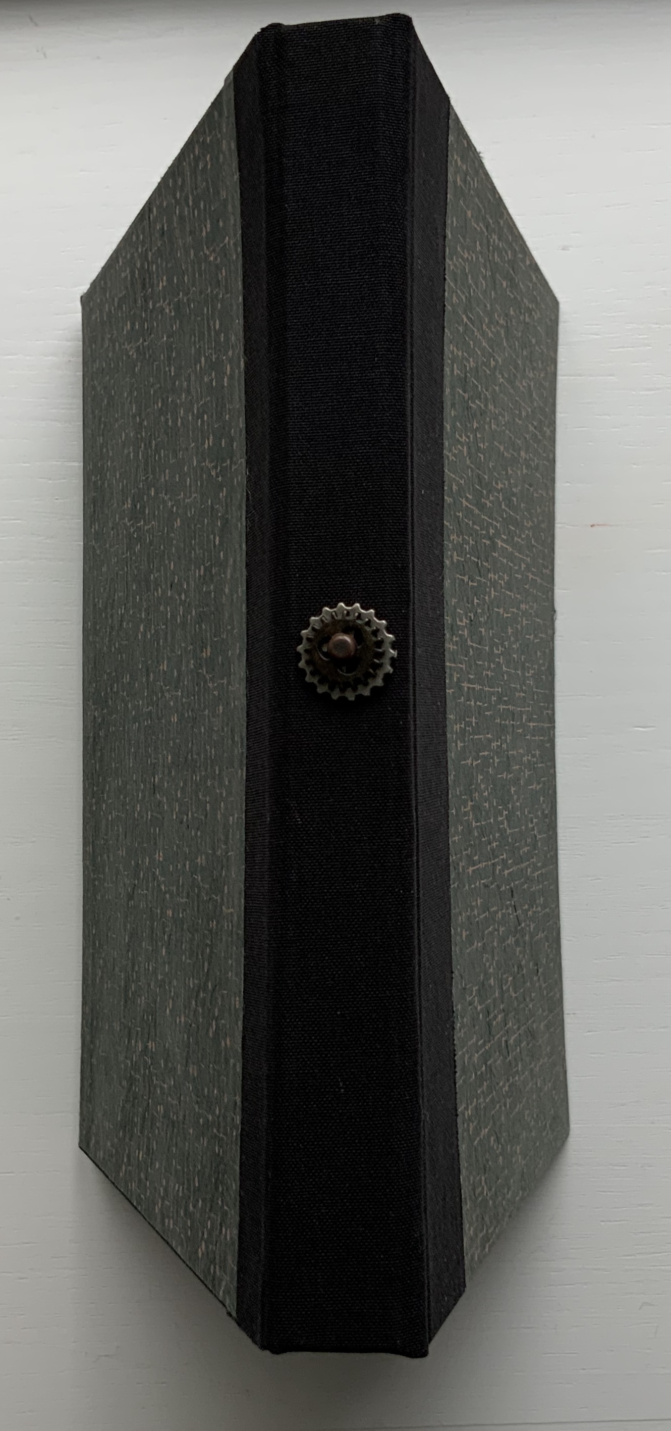View of the “internal spine”, an inward fold of the cover creating a tab to which signatures on either side are sewn.