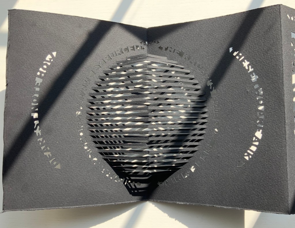 When you hold this small white brick of paper and turn its thick pages, a small pinhole appears on the page. Then two larger square holes emerge, one of which falls over the pinhole. Page after page, the two square holes repeat, creating two small dark wells in the field of white, until on the last page they take their place in the cut-out schematic footprint of the city blocks and buildings surrounding the Twin Towers of New York City. What you hold in your hands at the end is an object of art and book of memorial prayer.