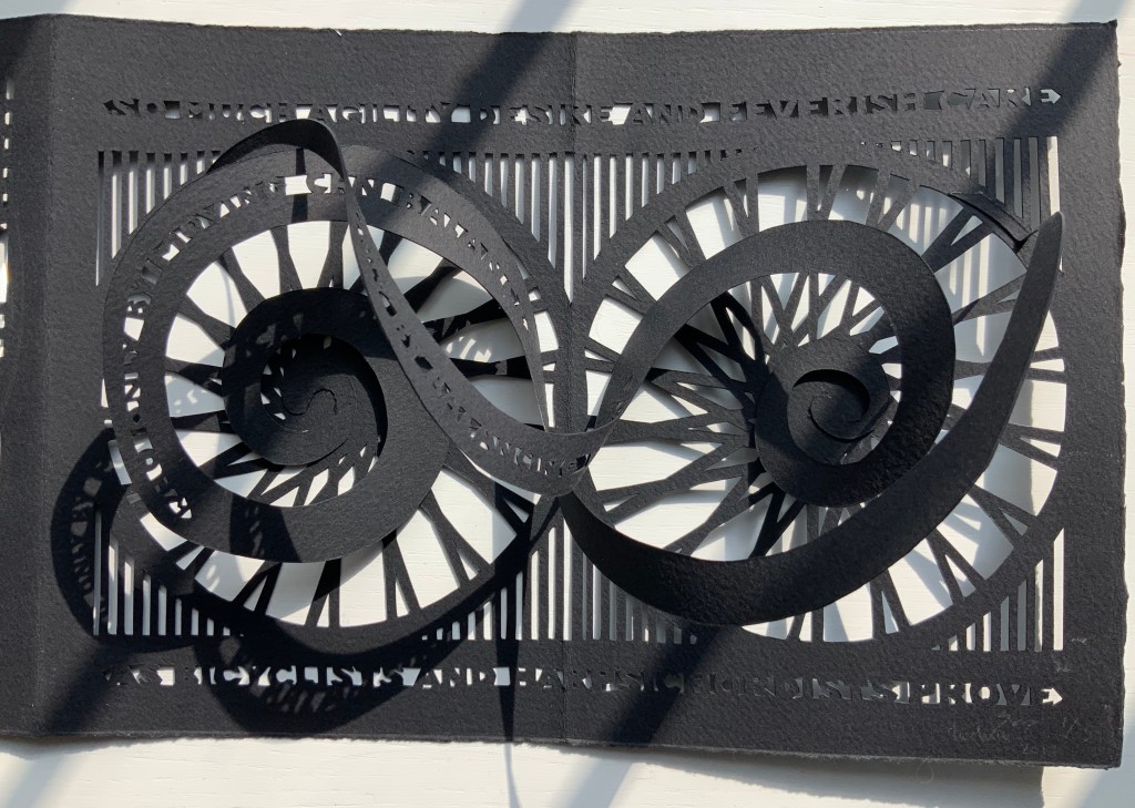 BoB: You have described how you listened for days to Willa Cather’s work being read aloud when preparing for Mining My Ántonia. And Ute Schneider in her essay “Turning the Page” writes of the “sound world” of your work Black Ice and Rain. And you mentioned that when you bought Collaborative Form you were “working a lot between music and visual books.” How important is sound to your work? What do you hear as the work progresses? Or when it is finished, what do you hear and hope your audience hears when experiencing the work?