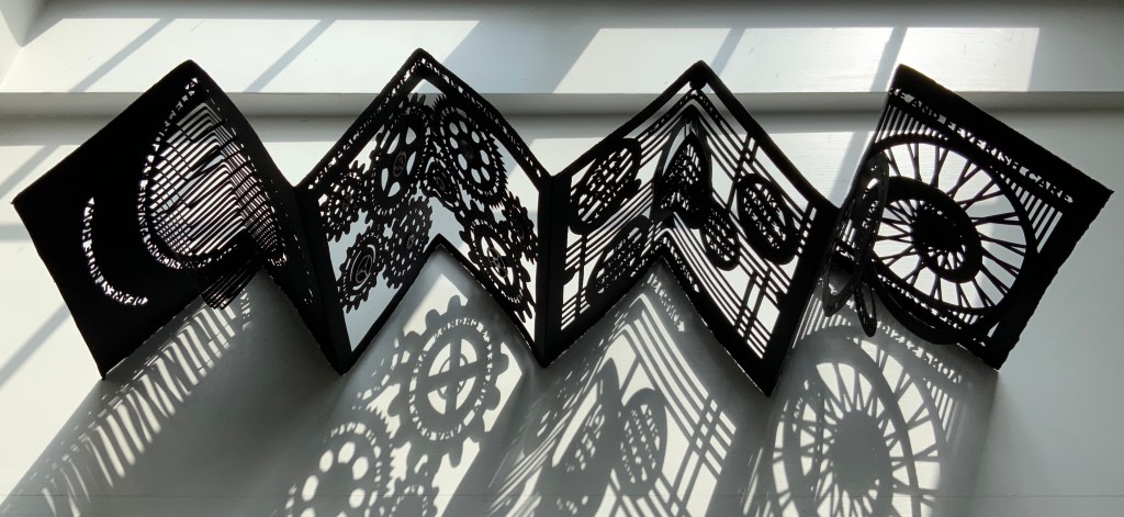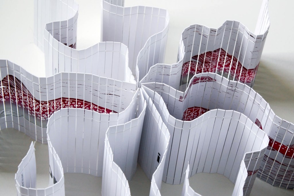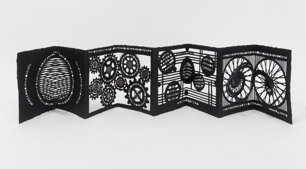 Twice a semester, the Environmental Design Library at the University of California, Berkeley hosts “Hands On: An Evening with Artists’ Books”. In 2017, one evening’s theme was “Building on the Built”, illustrated by 25 works of book art. Organised by 23 Sandy Gallery in the same year, “BUILT“ was an international juried exhibition featuring 66 artist books by 51 artists examining the relationship between contemporary book art practices and architecture, engineering, landscape and construction.