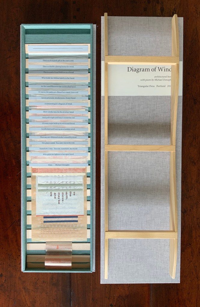 The poem that inspired this work uses images of the natural world — sand, smoke, wind — to build its metaphor of love’s paradox (its holding fast with an open hand). Humanity is in the foreground, nature in the background. Tetenbaum’s Diagram of Wind reverses that. Nature with its air movements and waterspouts move into the foreground. Then humanity with its controlling and measuring flume comes into the middle ground. And finally it ends with humanity’s ship on the horizon and nature’s dissipating waterspout in the foreground. Even though by virtue of its page one position the poem is in the foreground, it has become as much “material” for the artwork as the paper, ink, wood, cloth, earthy colors and physical structure are. The artist has transformed the poem’s sestina shape, its use of nature and its paradox into “material” for Diagram of Wind. In this instance of inverse ekphrasis, Tetenbaum has created a work that stands independently of, and in dependence on, its literary inspiration.