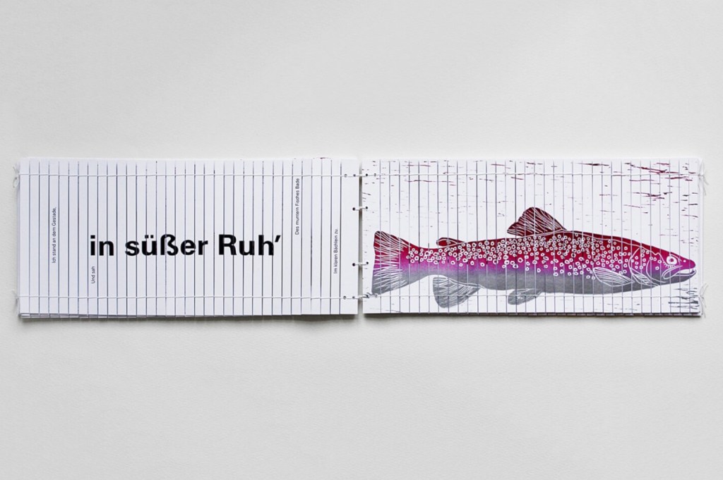 The contrast between the sturdiness of the paper and the flimsiness of the string closure echoes the cut-out rivers or tracks, loosely attached by brown thread and embracing the central fold-out leaf enclosing the densest body of images. All of these material aspects suggest looking for the paradoxical in this “sequential picture plane / book-like object”.