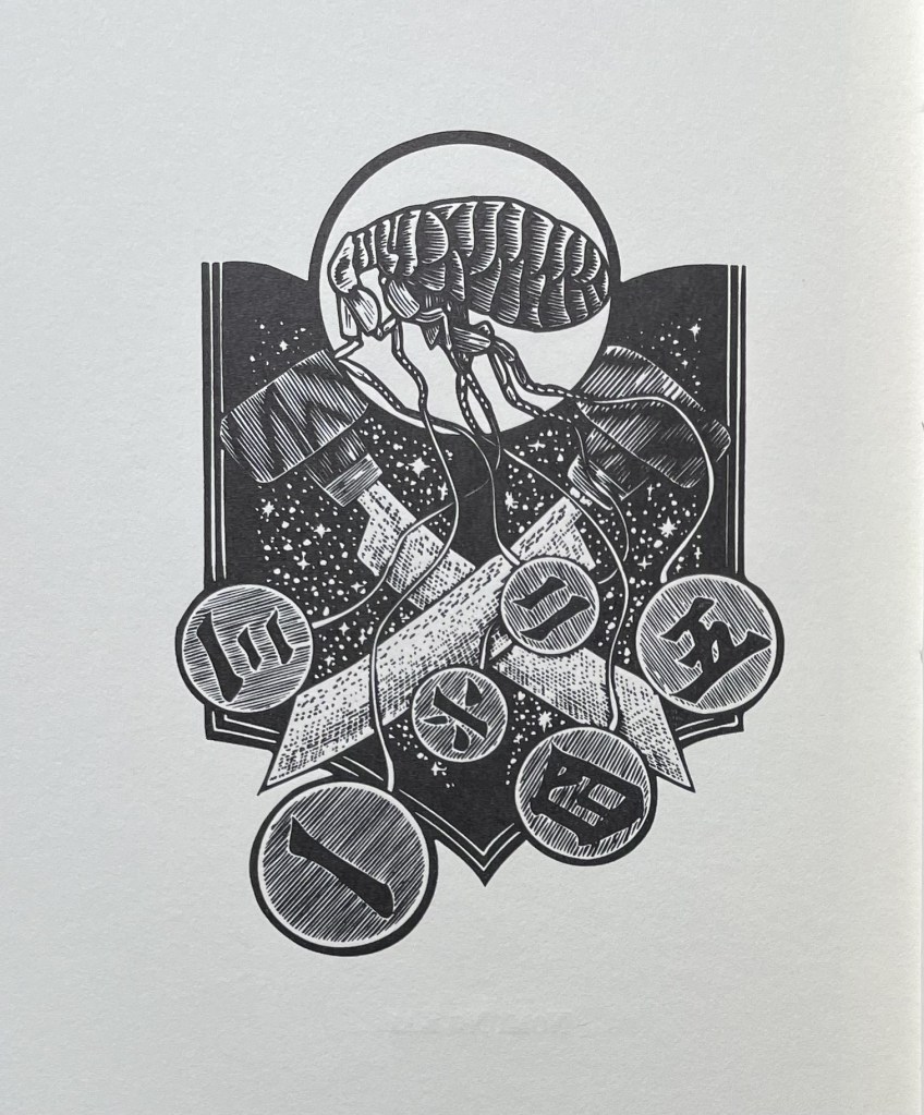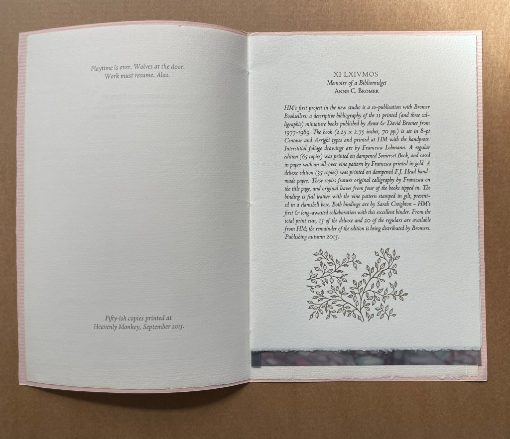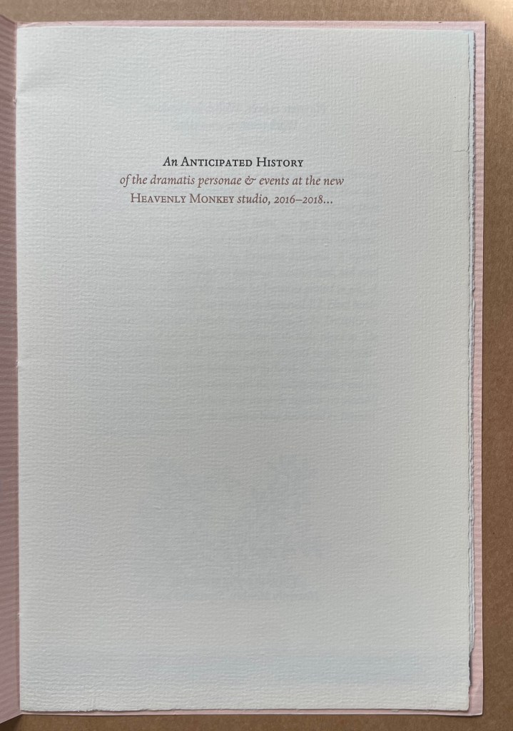 He presents a letterpress work in the modern version of the Bembo typeface cut by Griffo for the Aldine printing of Pietro Bembo’s tract De Aetna (1495), whence the typeface gained its name. In another step closer to Griffo, not only does Heavenly Monkey use simplified versions of initial letters attributed to Griffo, he offers up a note and display page that include those letters not used in the text (see below).
