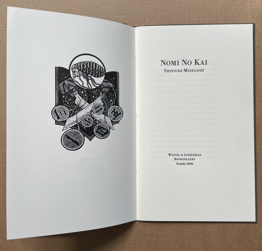 An homage to six Japanese wood engravers — the Nomi no Kai: Takao Hiwazaki, Sho Kidokoro, Hitoshi Karasawa, Susumu Yamamoto, Masahiro Kurtis & Keisei Kobayashi. Set in Bodoni and printed letterpress from polymer plates by David Clifford at Black Stone Press. Designed and assembled at Heavenly Monkey studio.