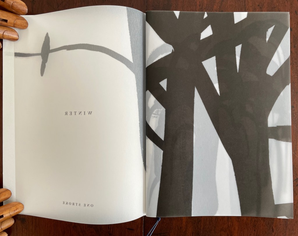 After several more pages and perhaps too tired to keep looking up, our eyes turn back to the tree trunks and branches sunk in snow, until at the end, we can finally look back up, turn around and see the clear fork of a trunk behind which the wood has disappeared again in winter fog.