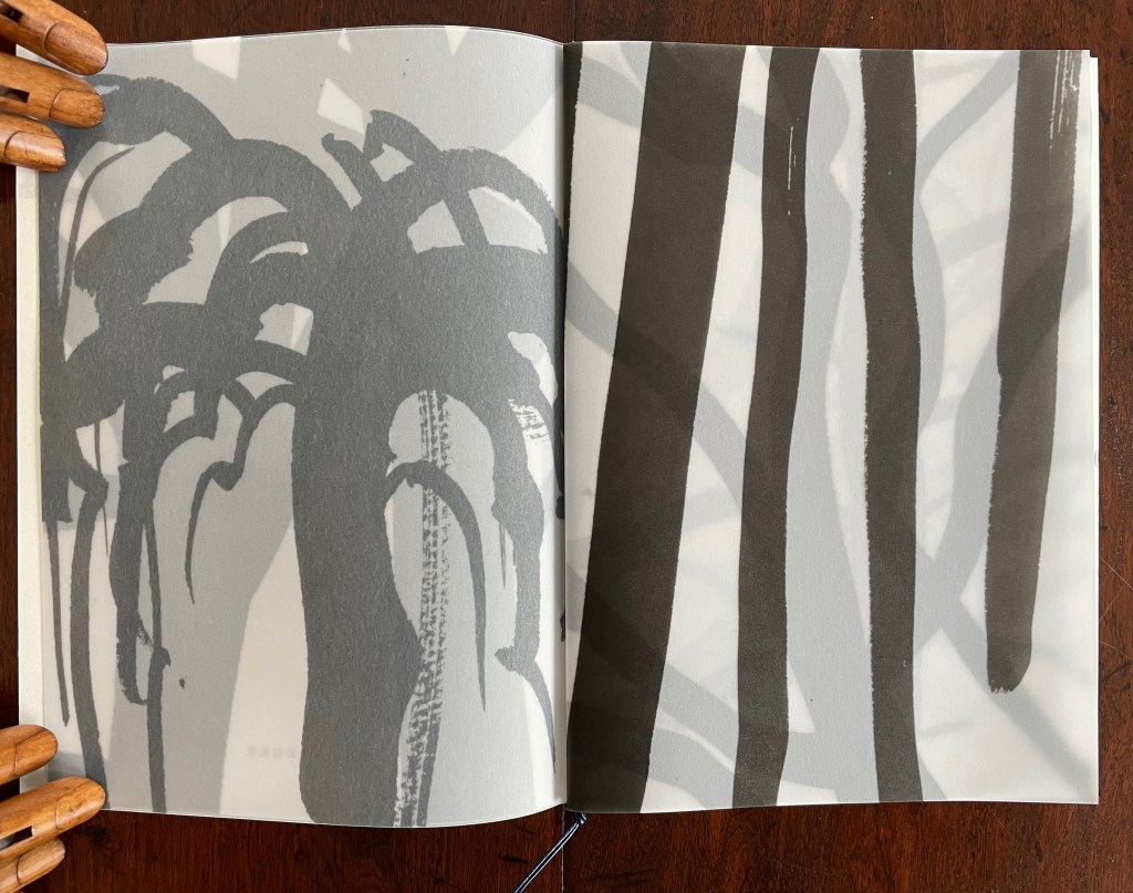Several more pages of thicket and fog come before we reach the center of the book. There the imposition imposes its mechanics. The two facing pages both bear black ink, and the viewer may wonder whether these are birchtree trunks or black trunks with footsteps and branches or clumps of tree fall in the snow-covered ground between them.