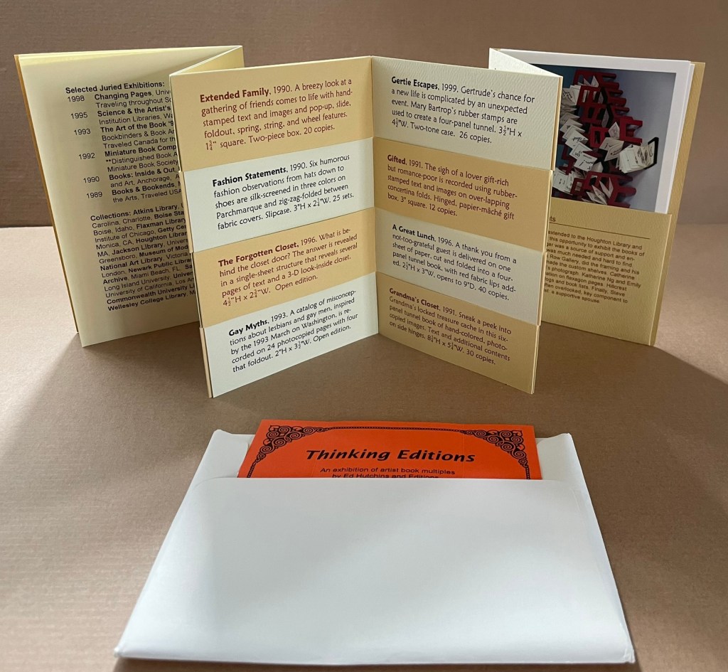 Thinking Editions (1999) Accordion fold booklet with 16-page gathering saddle-stitched with single staple to first fold, four panels of accordion slit to receive four cards to create 8 interleaved pages, final panel has pocket holding 3 color postcards. H155 x W110. 28 pages. Acquired from Ed Hutchins, 20 May 2014.