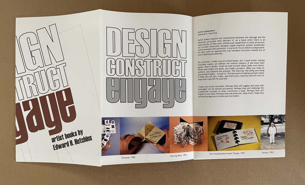 Design, Construct, Engage (2002) Booklet-poster-catalogue in meander cut and fold. Closed: H220 x W140 mm. Acquired from Ed Hutchins, 26 January 2022.