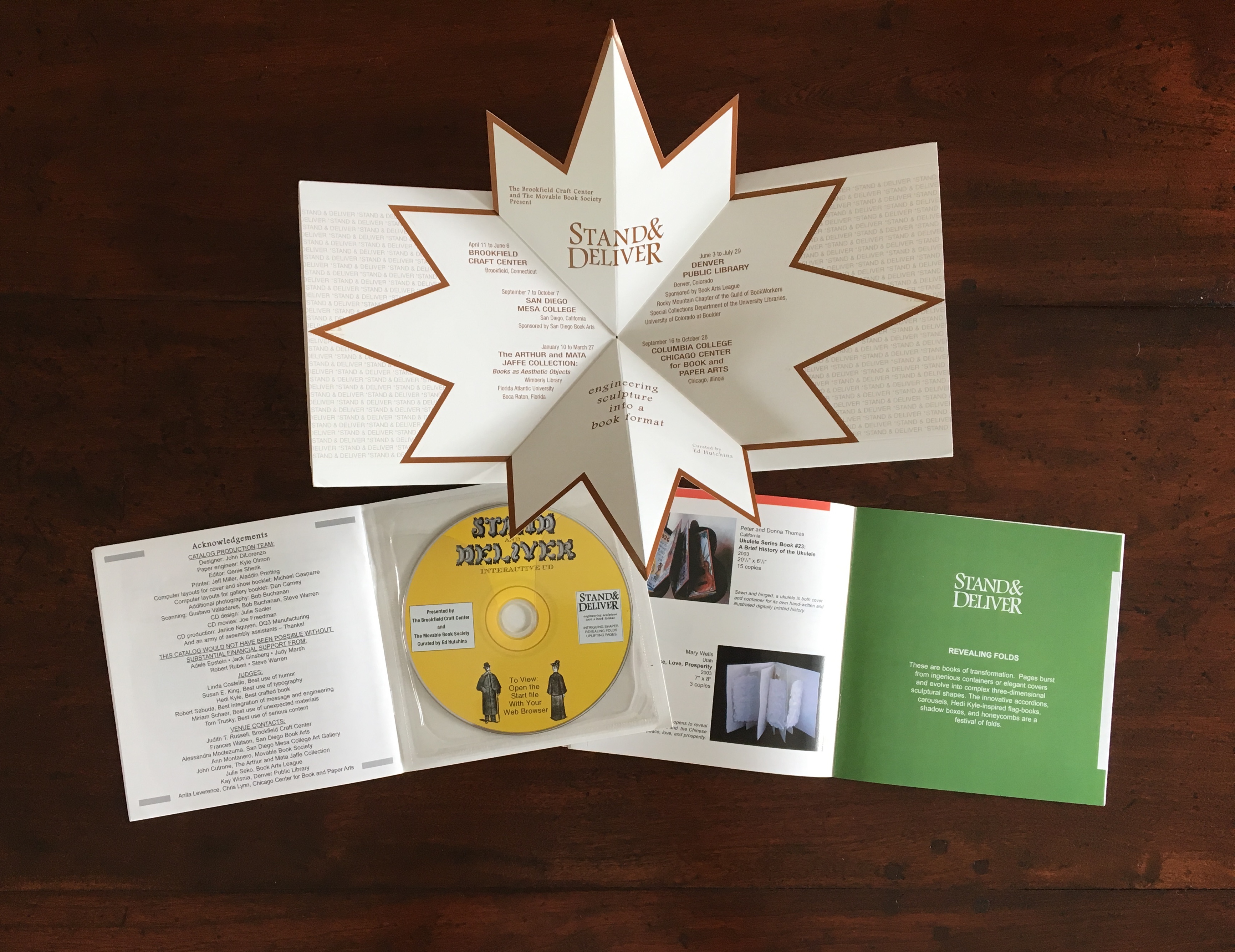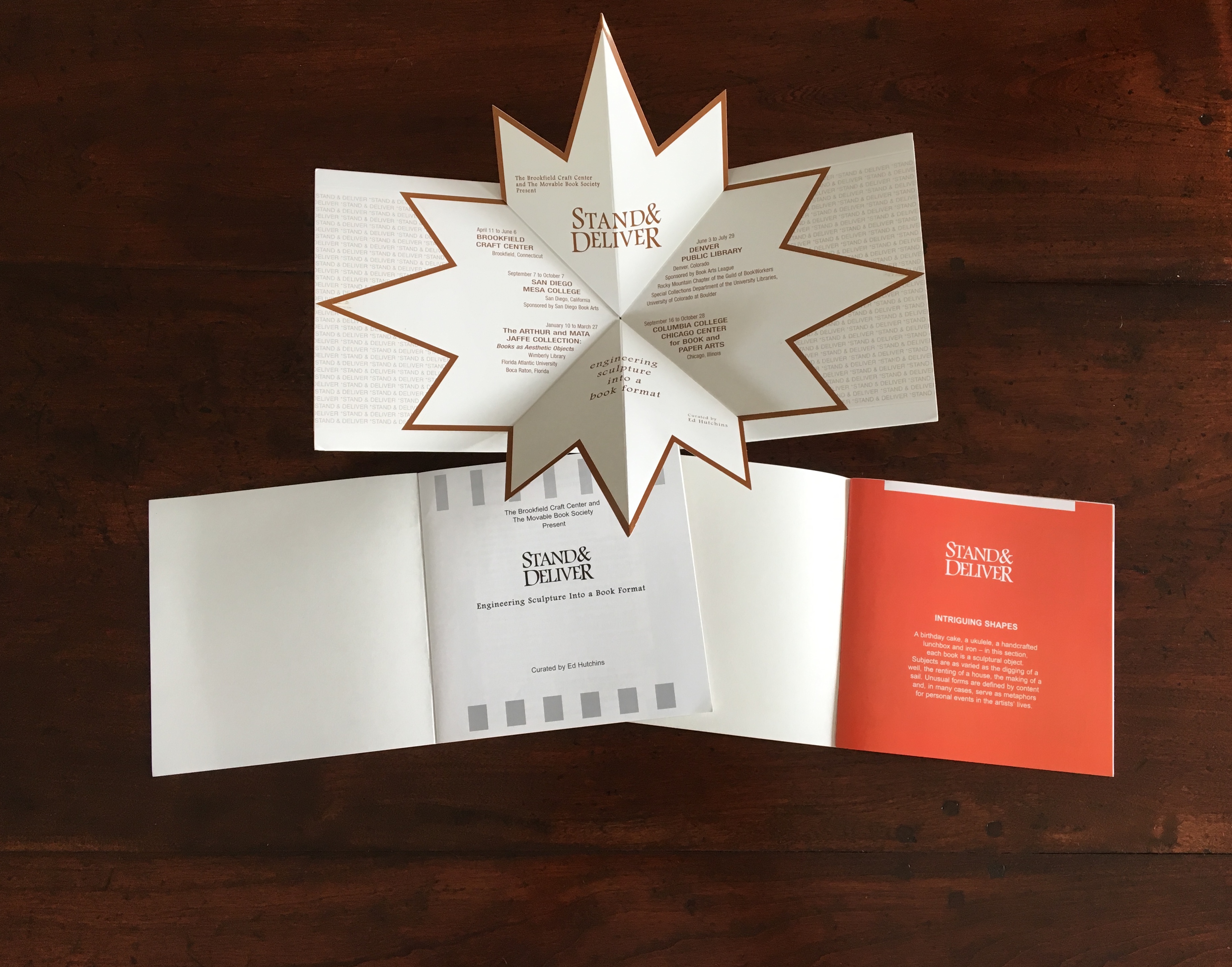 Engineered by Kyle Olmon and designed by John DiLorenzo, the catalog demonstrates great inventiveness in the pop-up structure and mechanism that nudges the two booklets from the left and right sleeves as the catalog is opened. Note also the use of colors to demarcate its sections that follow the themes Hutchins used to organize this exhibition: Intriguing Shapes, Revealing Folds, Uplifting Pages. And note the distinctive and subtle shifting placement of colors in the right-hand booklet: at the top on the orange page, a white bar that shifts to the right on the green page as an orange bar marks the end of the previous section on the facing verso page. For an exhibition that traveled to five different locations, a more appropriately and intricately mobile catalog could hardly have been devised.