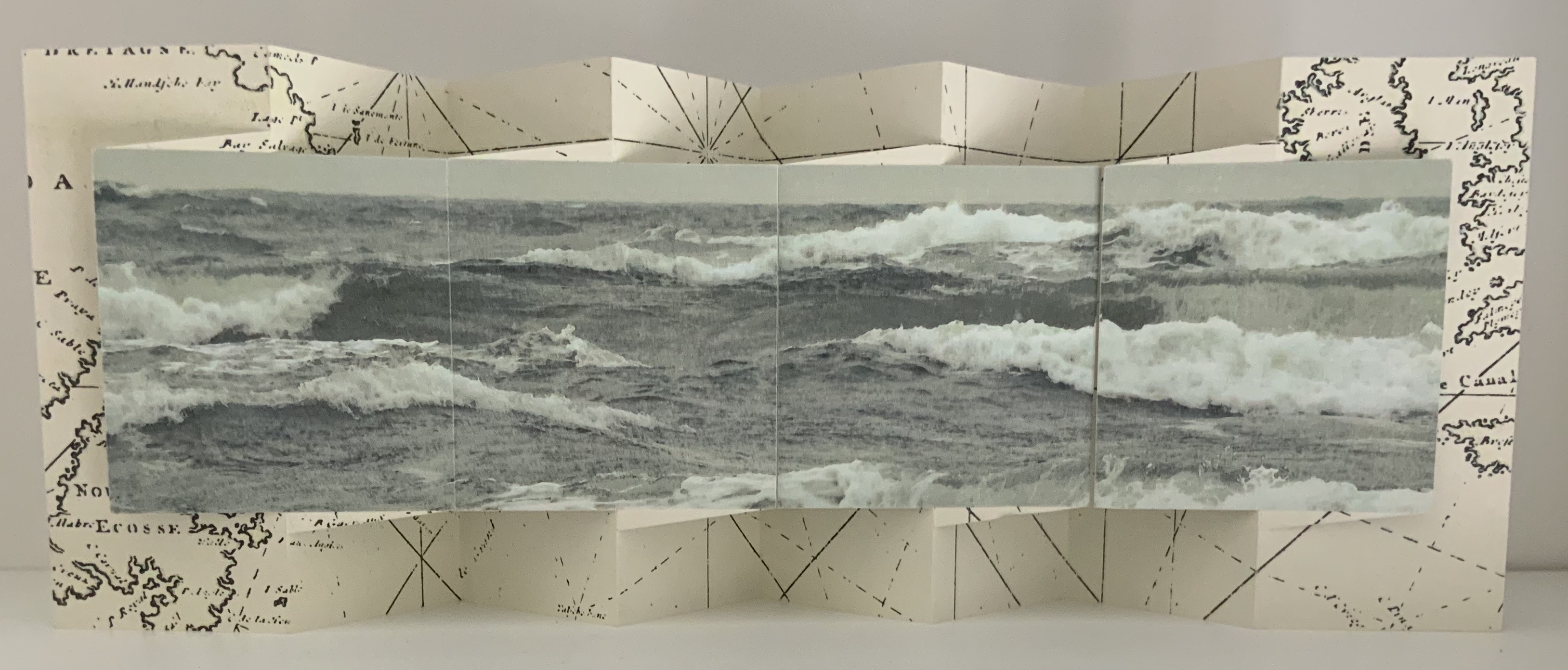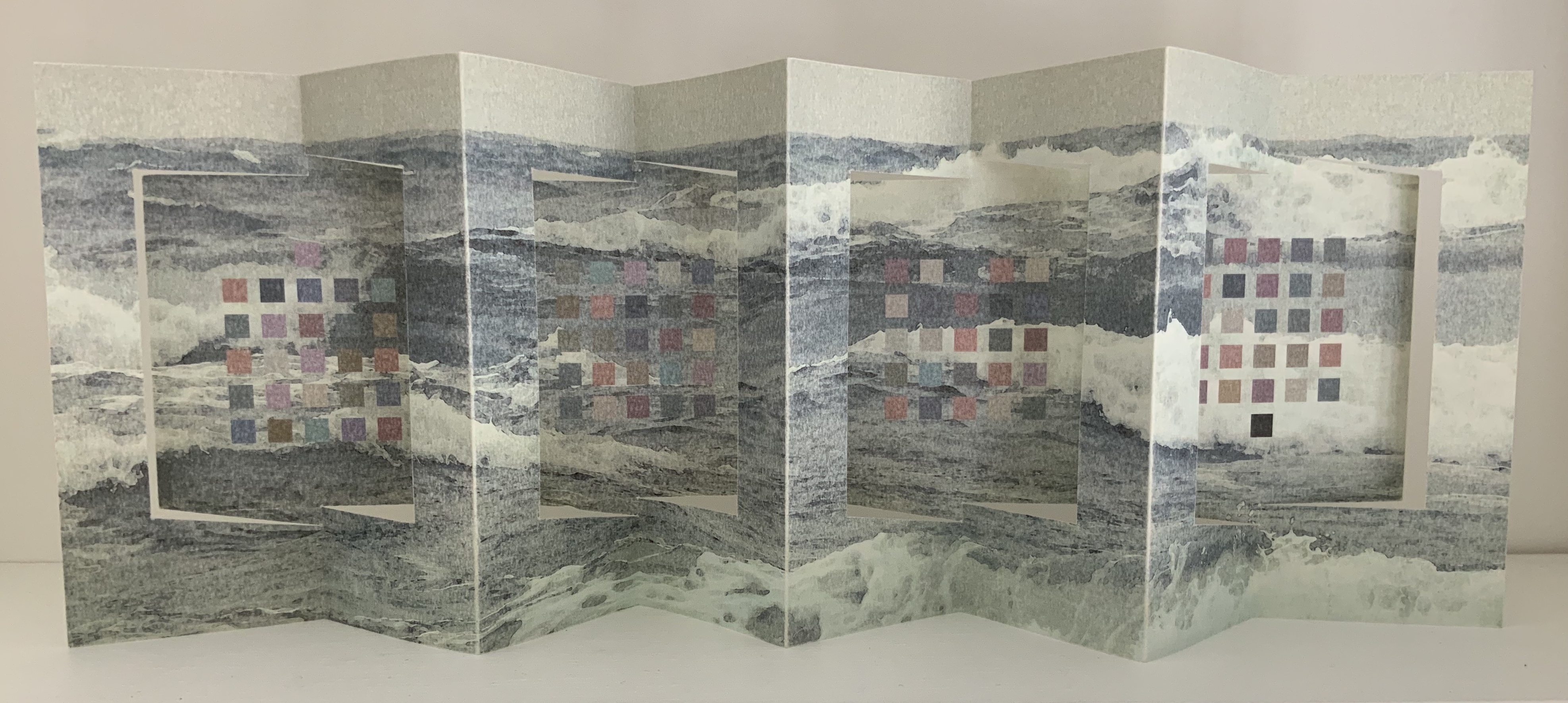 Westron Wynde (2016) Cathryn Miller Double-sided accordion with swing panel structure, 4 double-page openings, based on Hedi Kyle’s panel or panorama fold. In wrapper with slip and slot closure. Initialed and numbered by the artist. Edition of 6, of which this is #3.