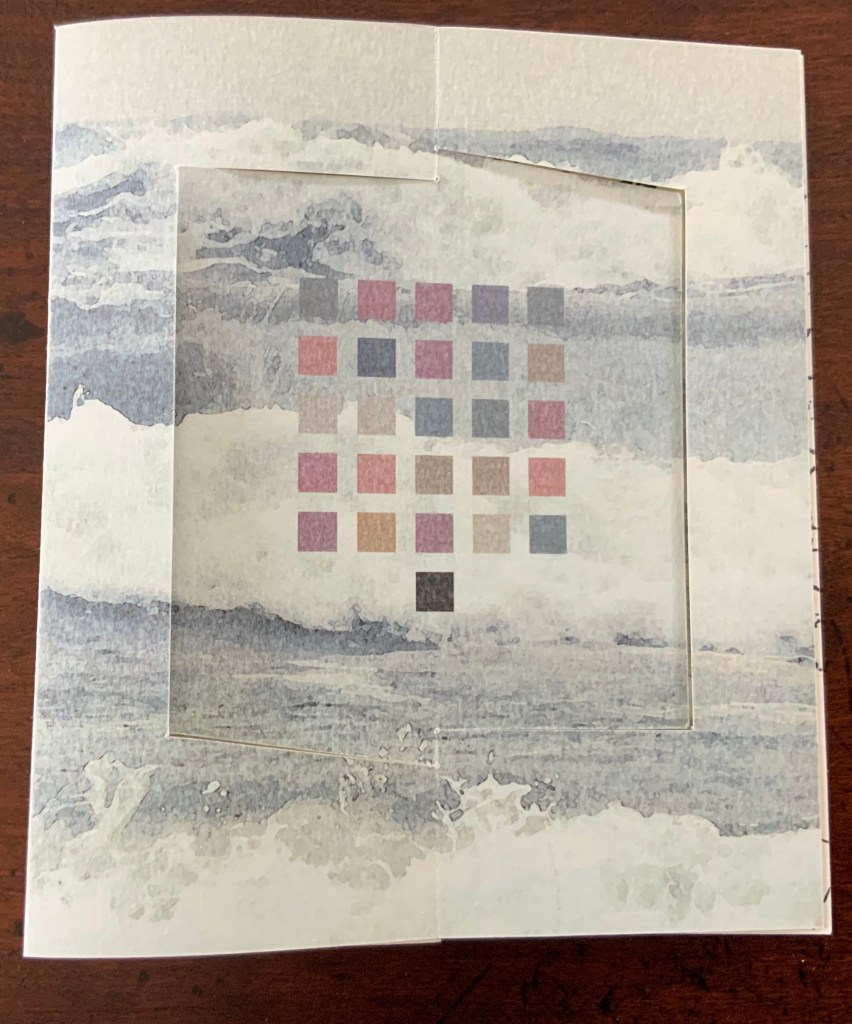 Cathryn Miller, colophon: “Part of an ongoing series of works based on exploration of colour-graphemic synesthesia. This book presents the poem ‘Westron Wynde‘ in a purely visual form. Letters become colours, and are used as graphic elements. The book manifests the essence, if not the sense, of the poem.”