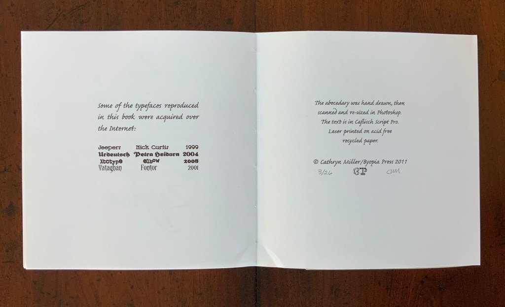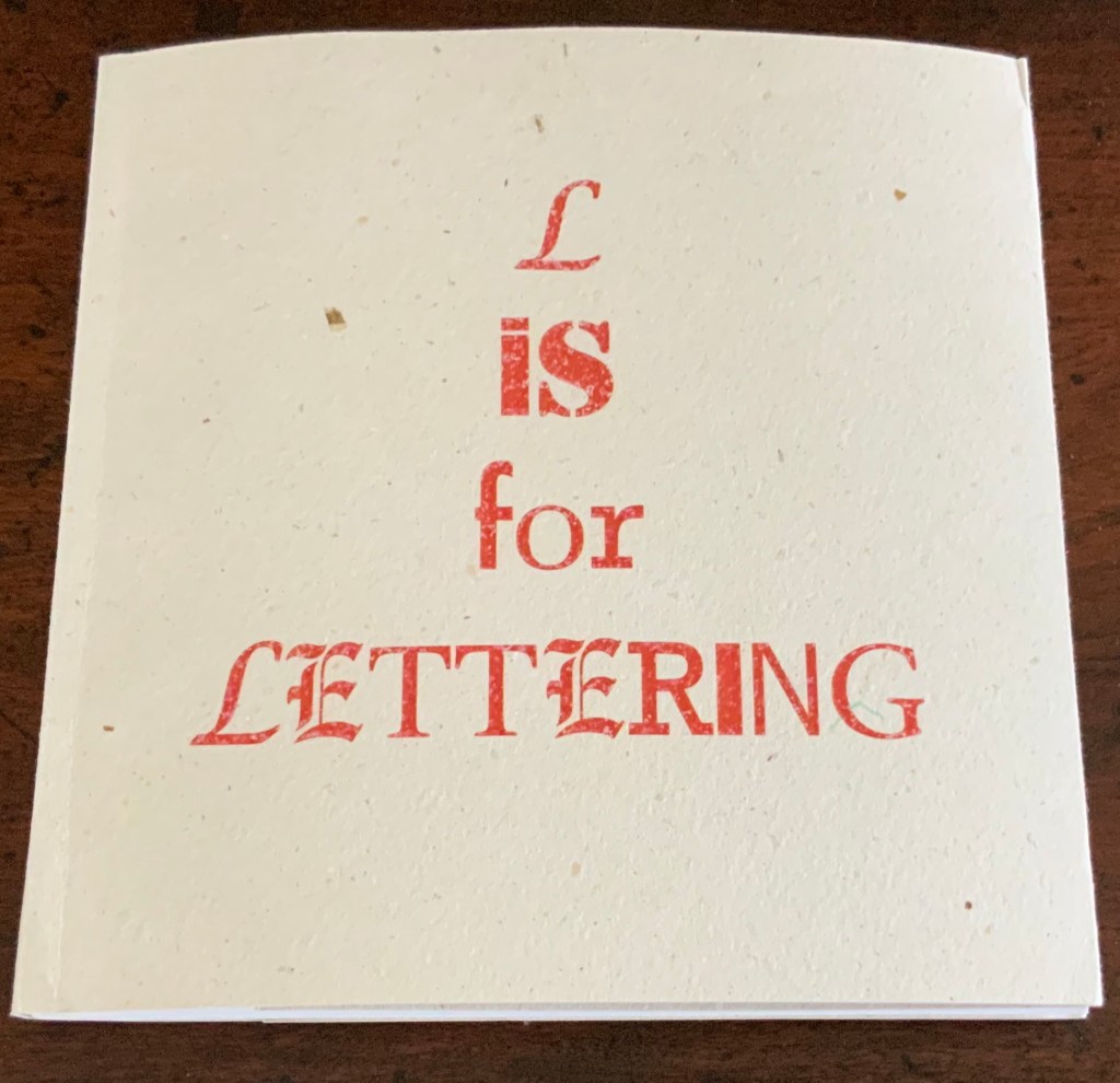 L is for Lettering (2011) Cathryn Miller This hilarious and touching abecedary parades as a marked work handed in for a course, a portrait of the artist within a contemplation of the past and future of typography and letterpress. This colophon embodies the finishing touch.