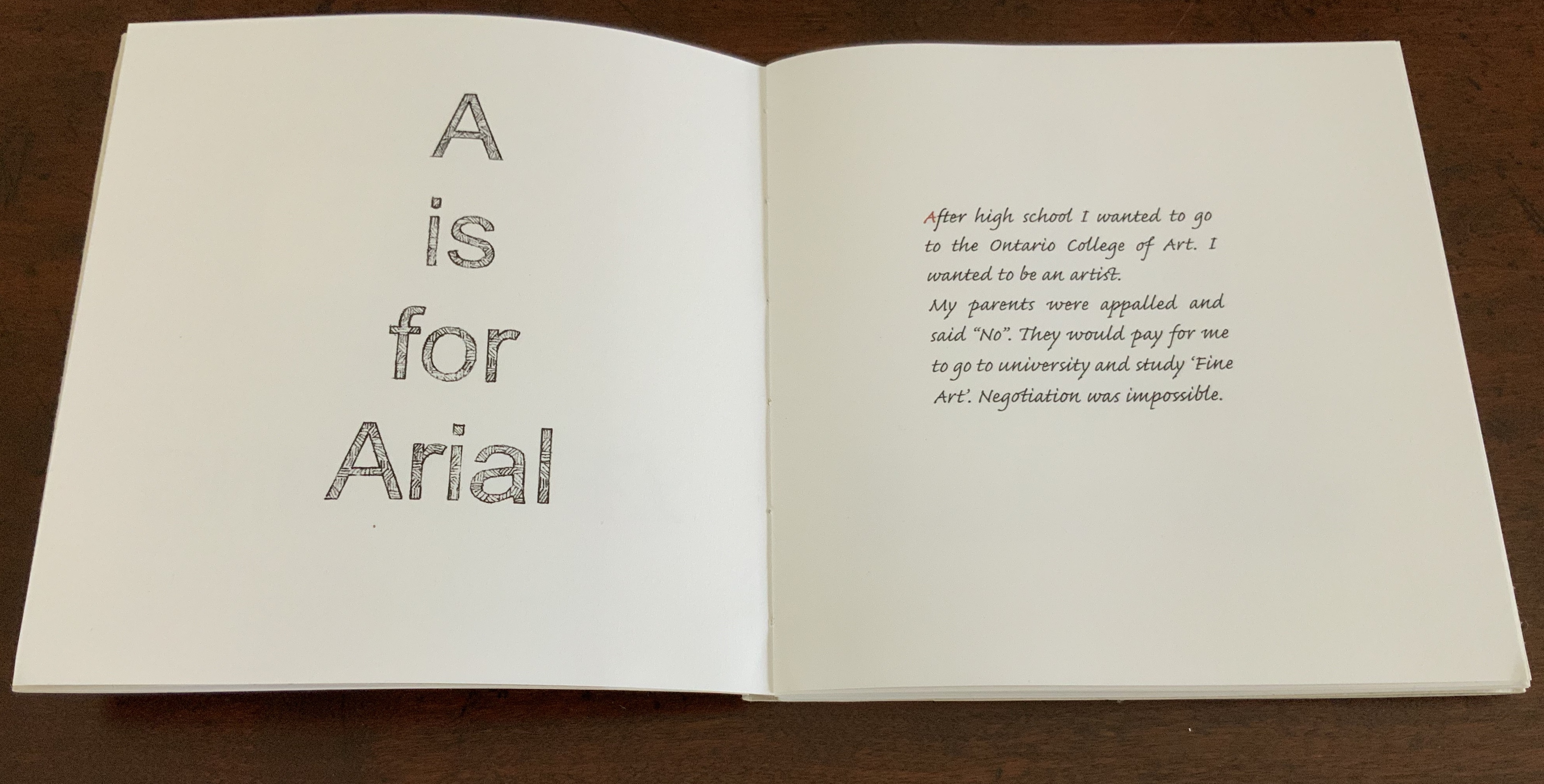 An alphabet book based on the artist’s personal struggle to become a practicing artist. Cathryn Miller: “The trials and tribulations of the art education process as recalled from a satisfactory distance after the author learns that everything is useful after all.”