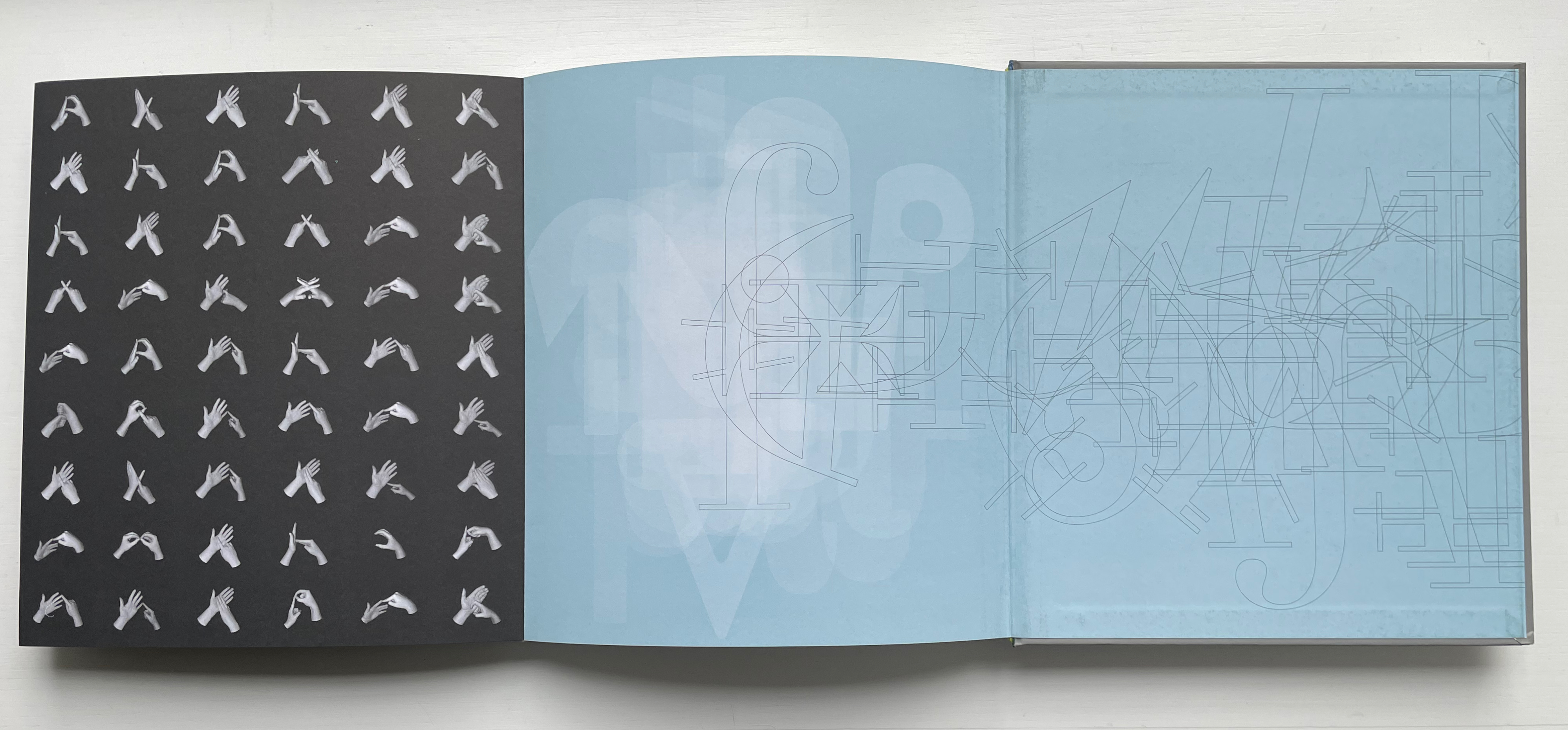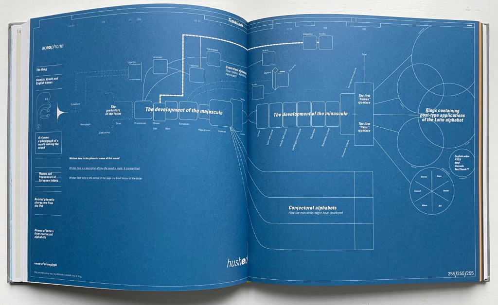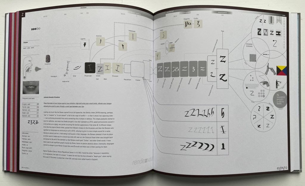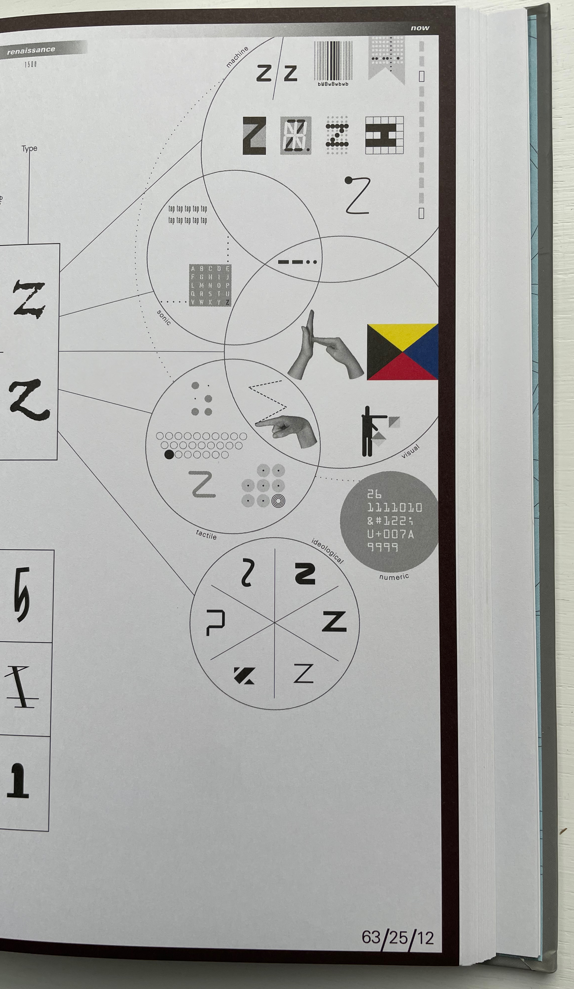 A: It uses a blueprint to create a broad and deep infographic of each letter’s historical development, features and representation in a variety of post-type systems (sonogram, sign language, maritime flags, semaphore, punch card, barcodes, dot matrix, segment display, OCR, ASCII, Unicode, HTML, Braille, prison tap code, etc.).
