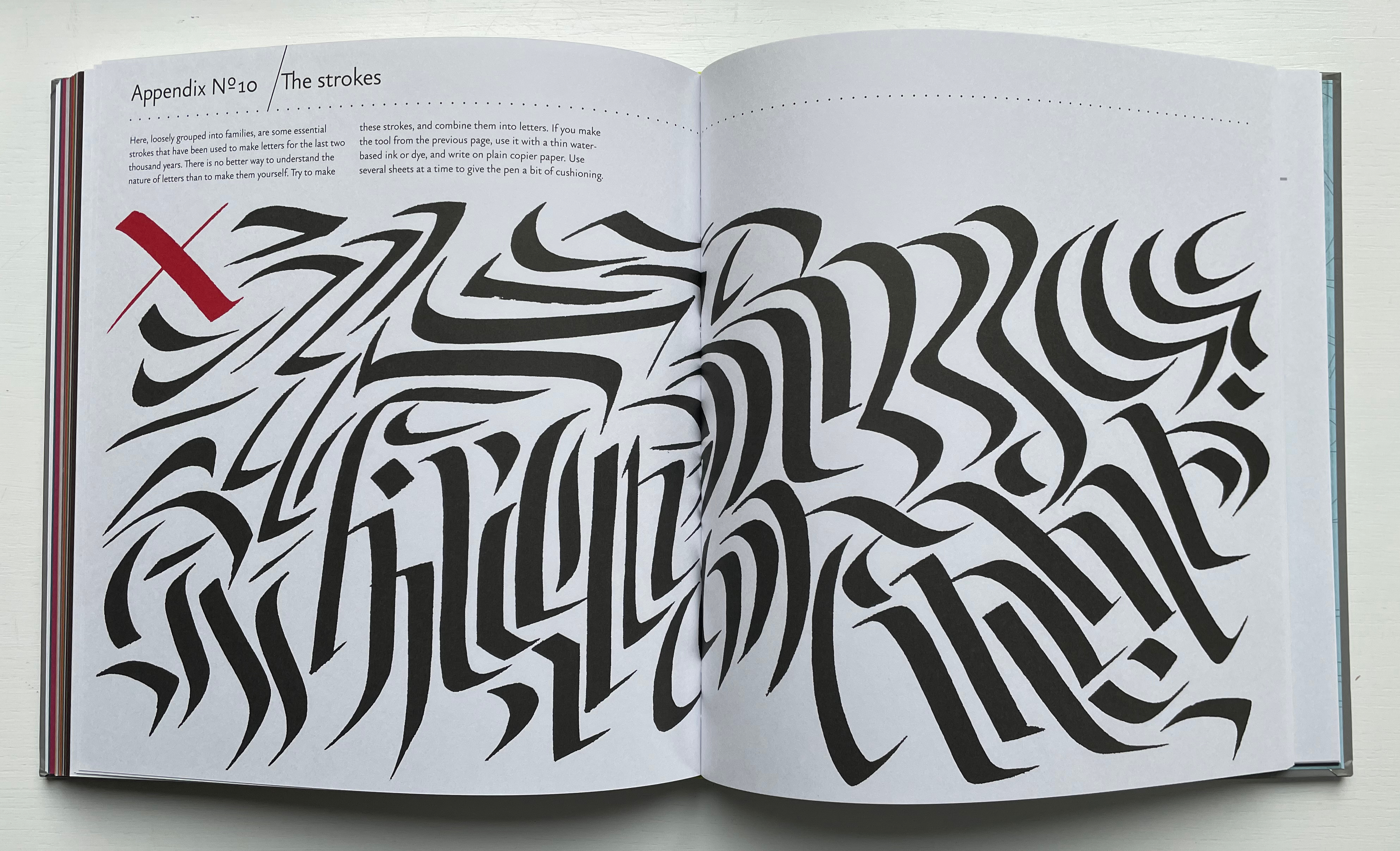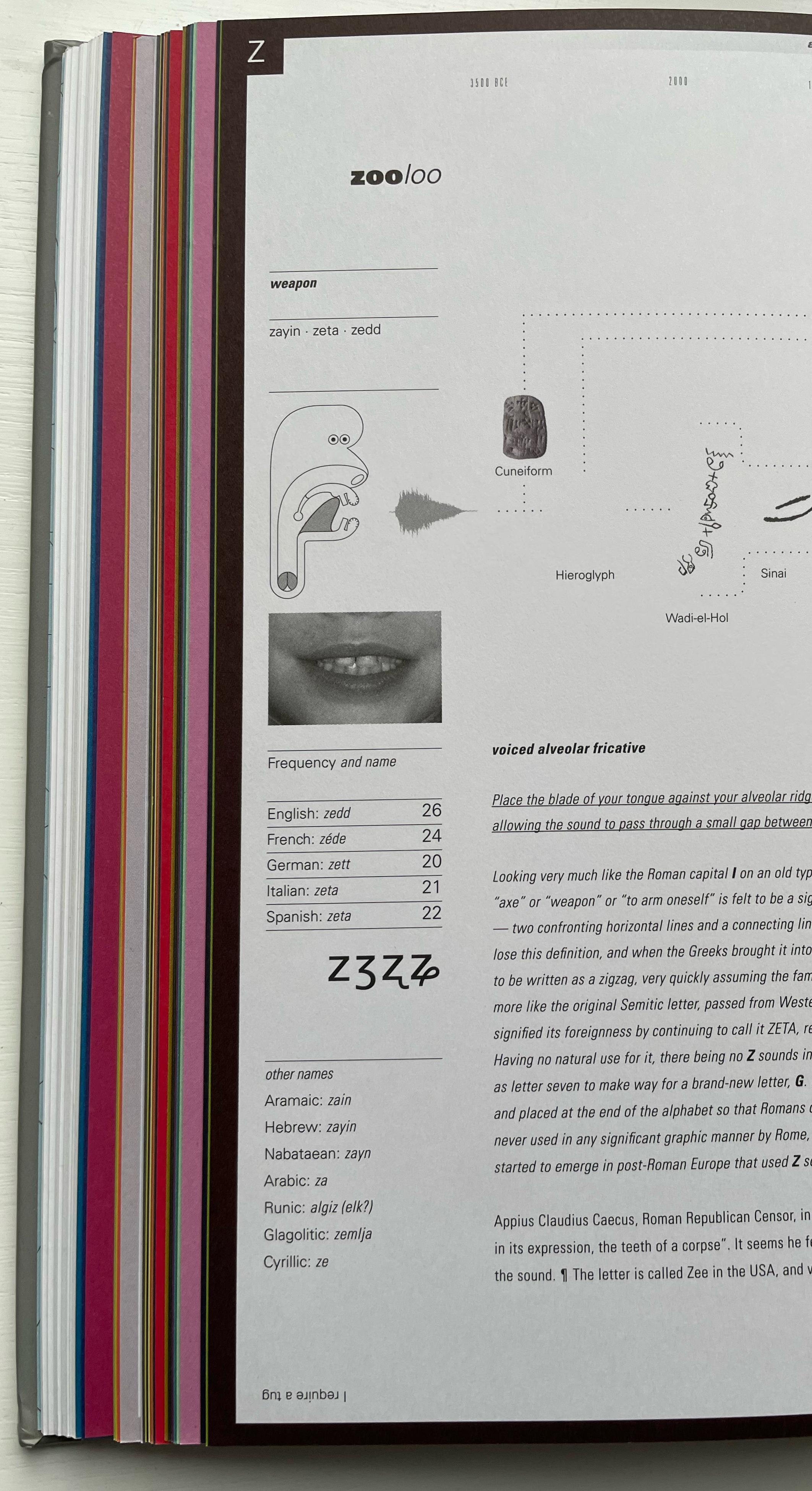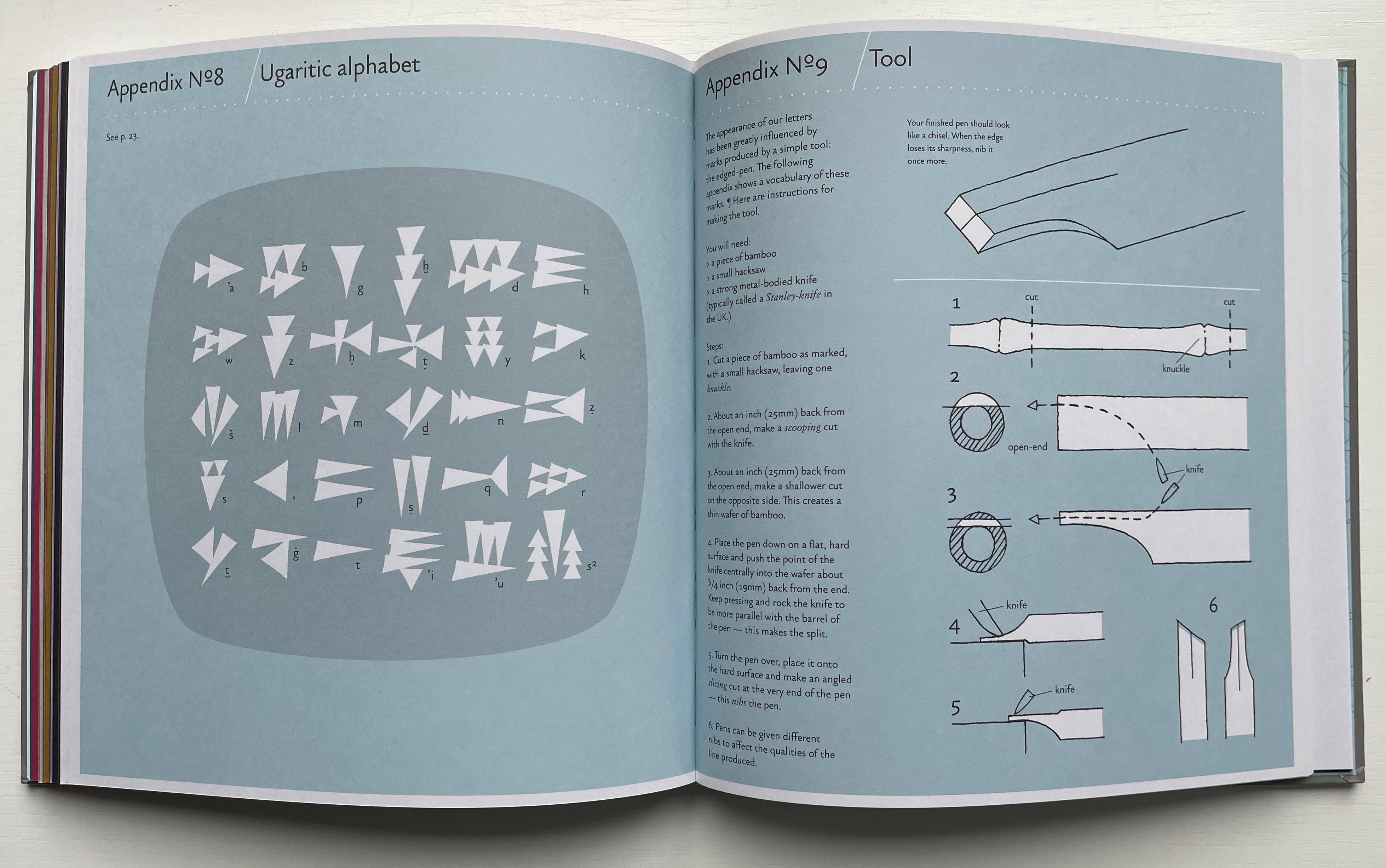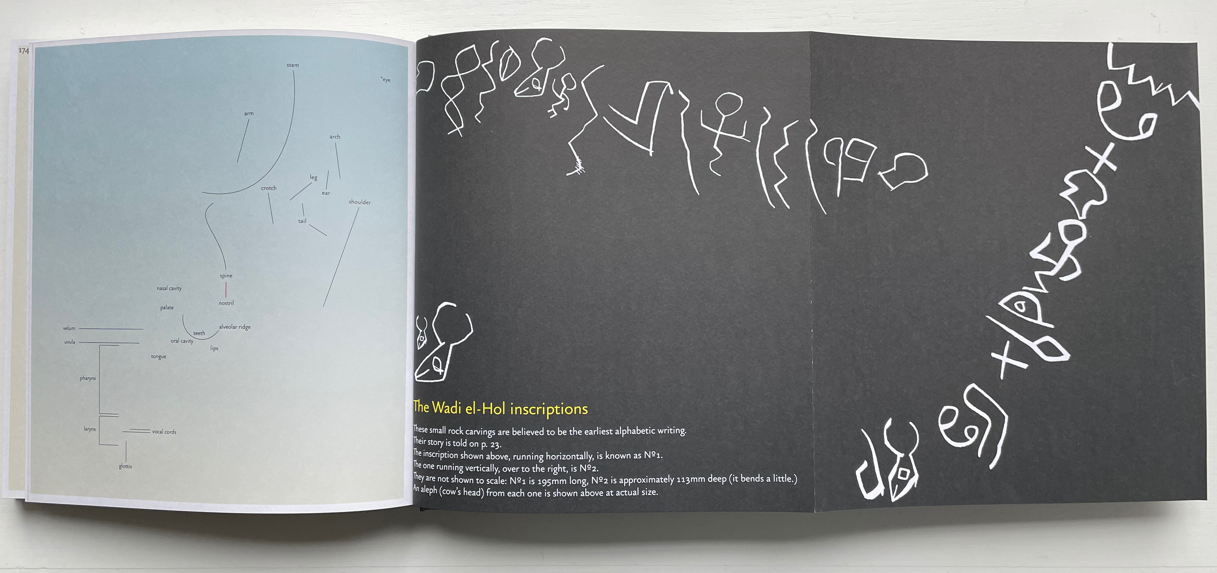 The text in the first third of the book presents discursively what the twenty-six infographics present in particular for each letter and also whet the reader’s appetite for the additional detail in the thirty-seven appendices, which delve deeper into such topics as the phonemehead (the author’s cartoon for illustrating per letter the positions of our sound-making apparatus), ductus (the order and direction of strokes for making a letter), Trajan’s column, the Ugaritic alphabet and more (including an explanation of cowhouse).