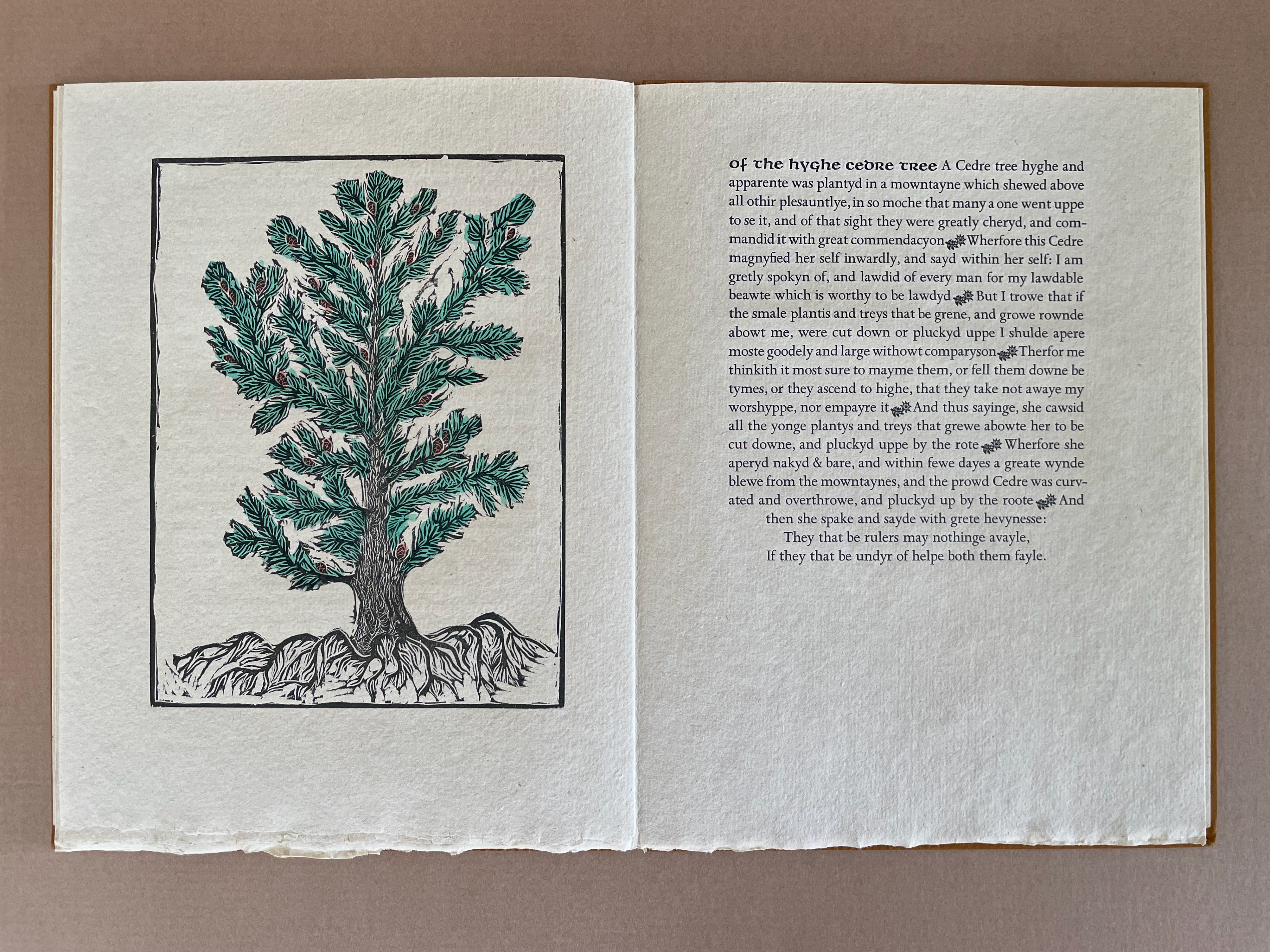 Below, the five-part pulp-painted centerpiece and the silver paper ribbons woven into the double-page spread stand out against the more subtly pulp-painted background. The pop-up echoes the images on the Barcham Green Boxley paper used throughout for the text and commentary (see above).