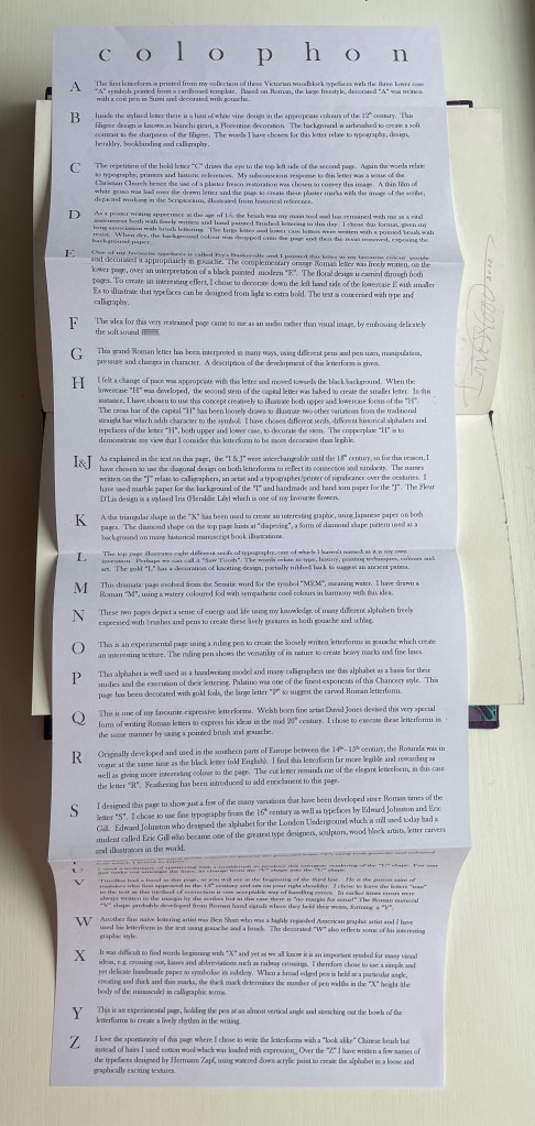 And while the colophon may be necessary to know that the typefaces written in color below were created by Hermann Zapf, any viewer can enjoy Wood’s incorporating the entire alphabet in the Sumi ink design culminating in the letter Z as a fitting self-referential conclusion to Alphabetica.