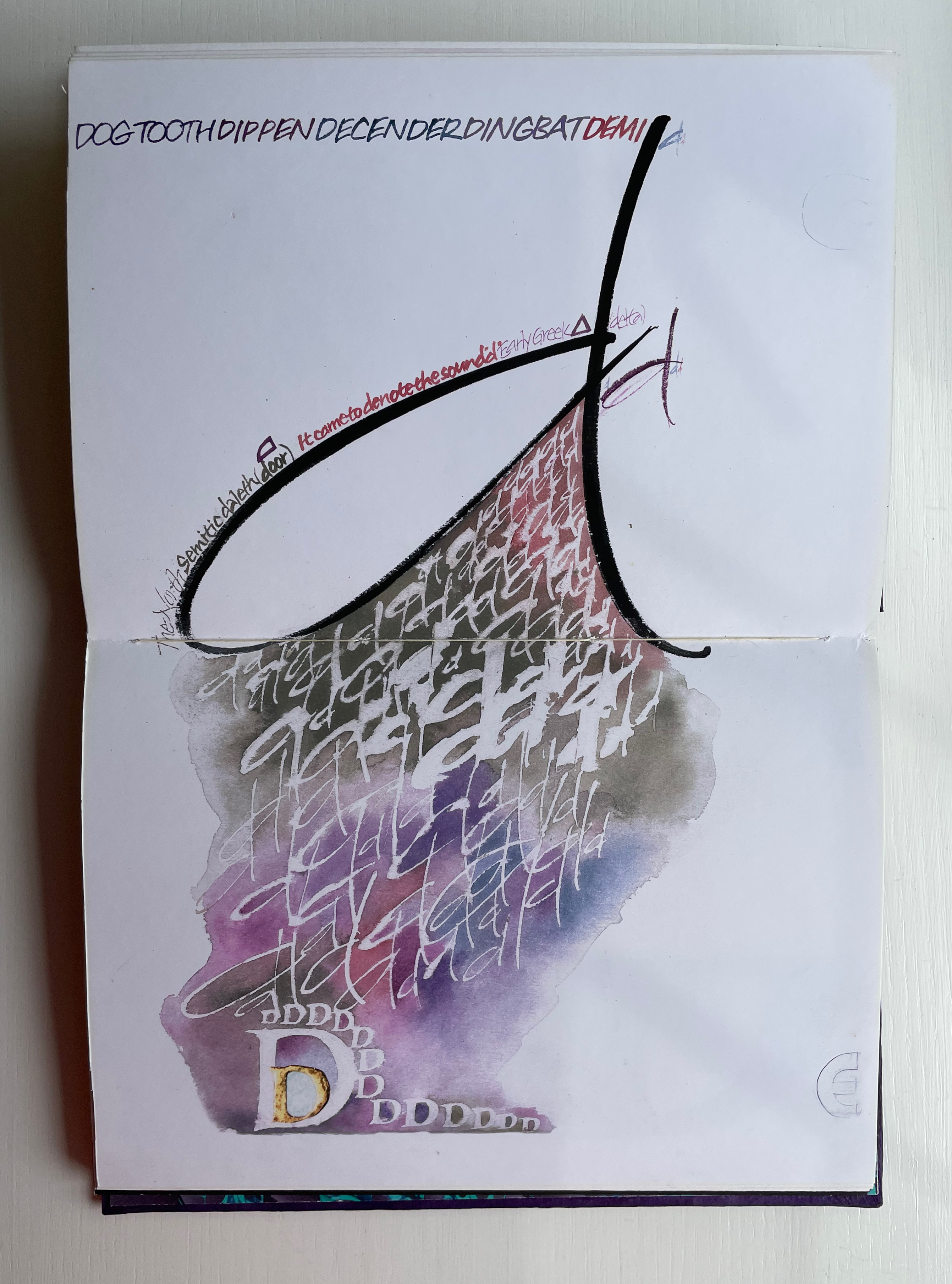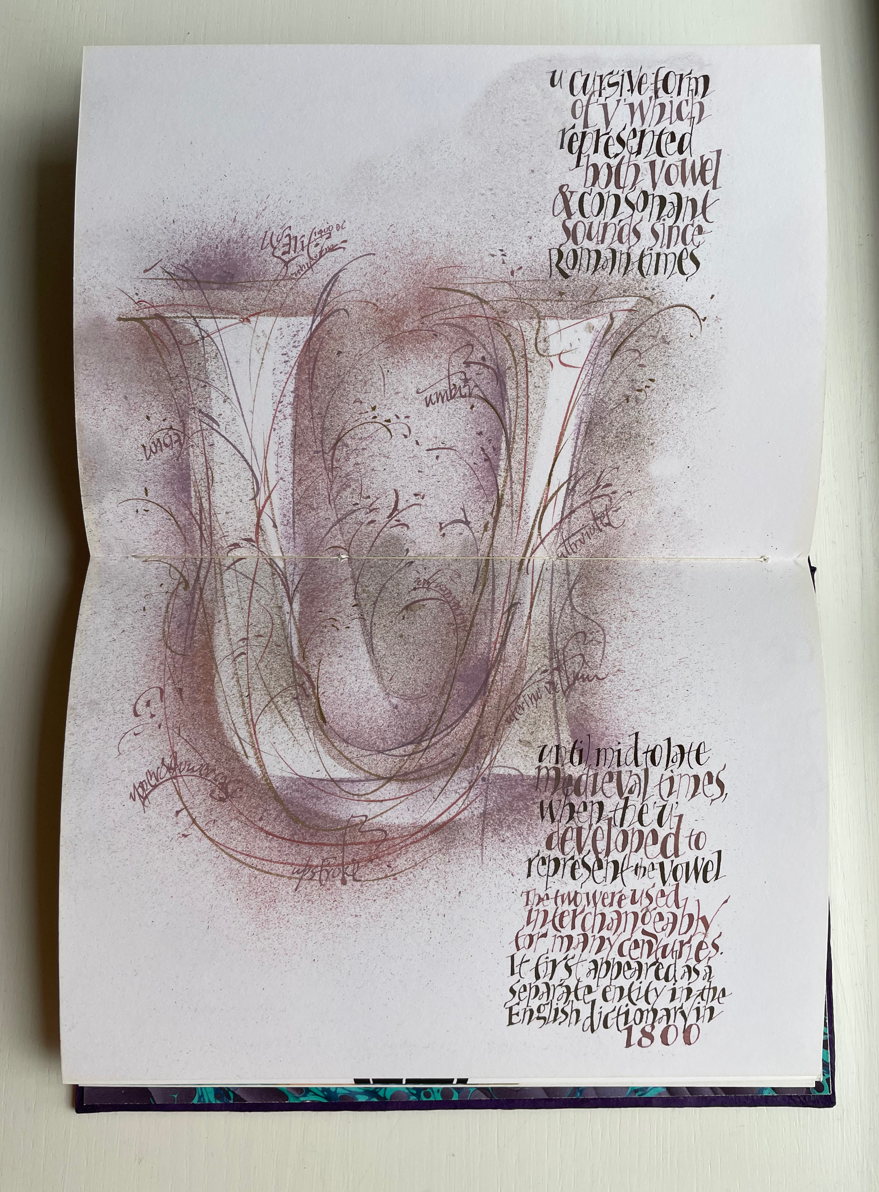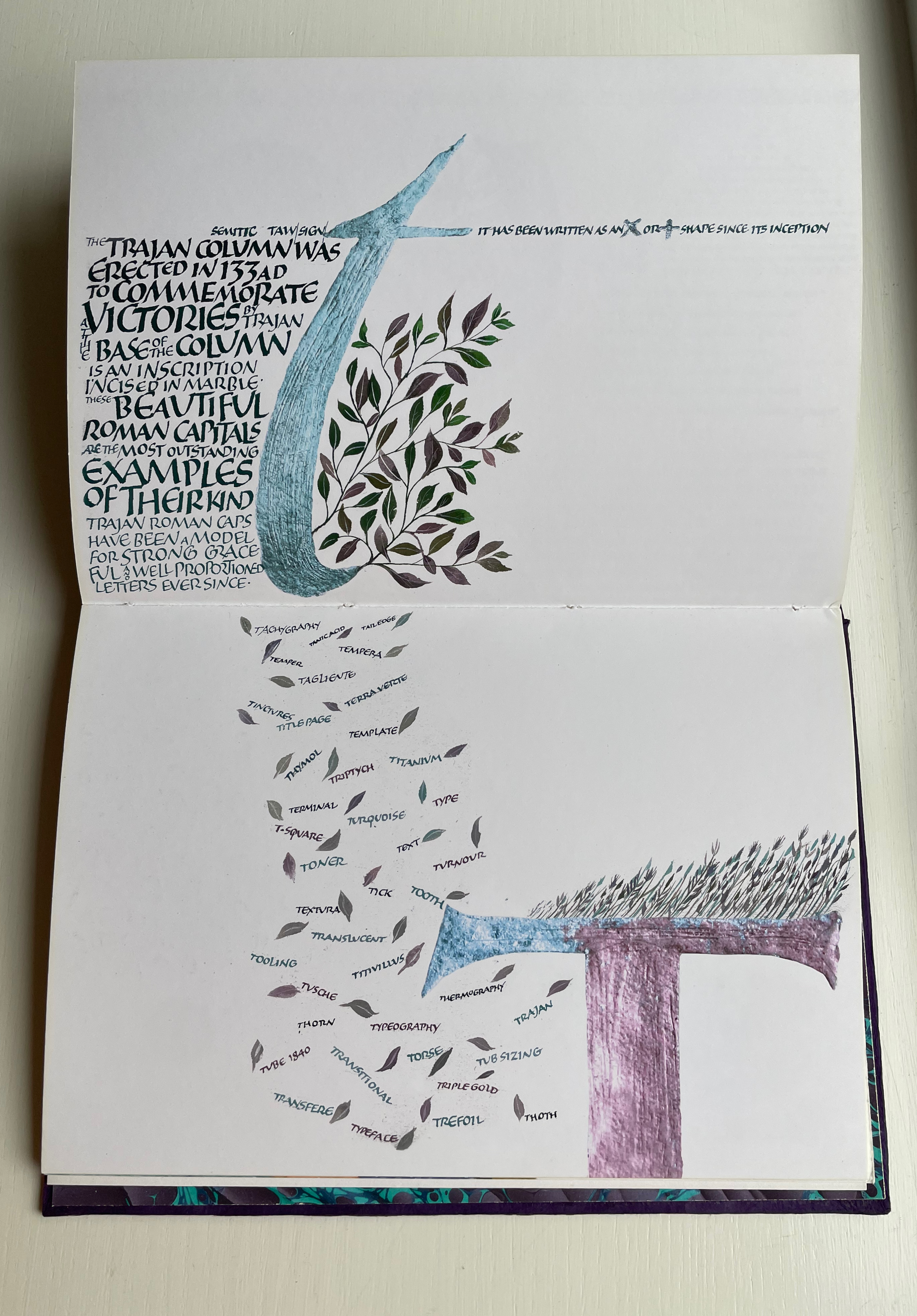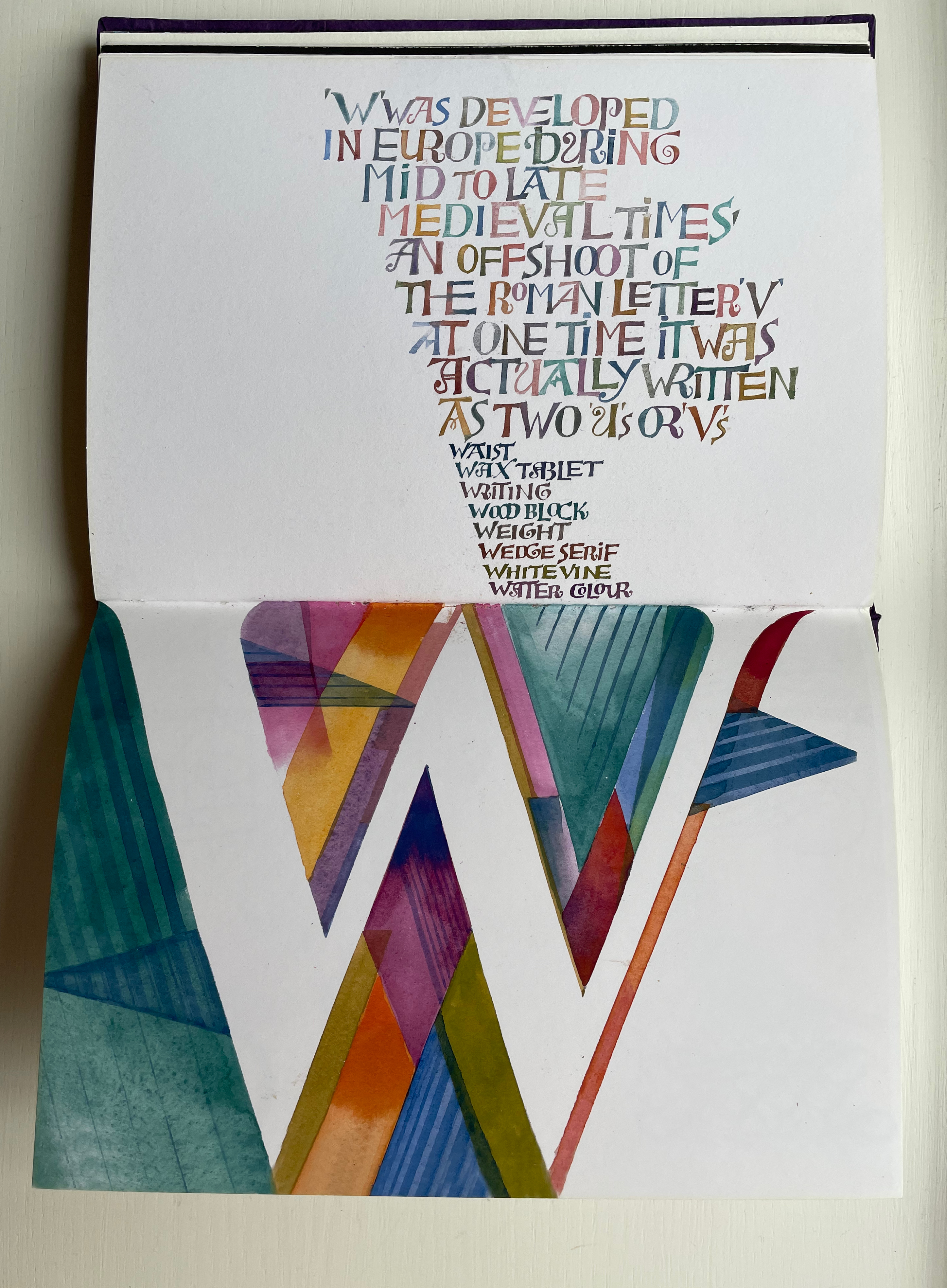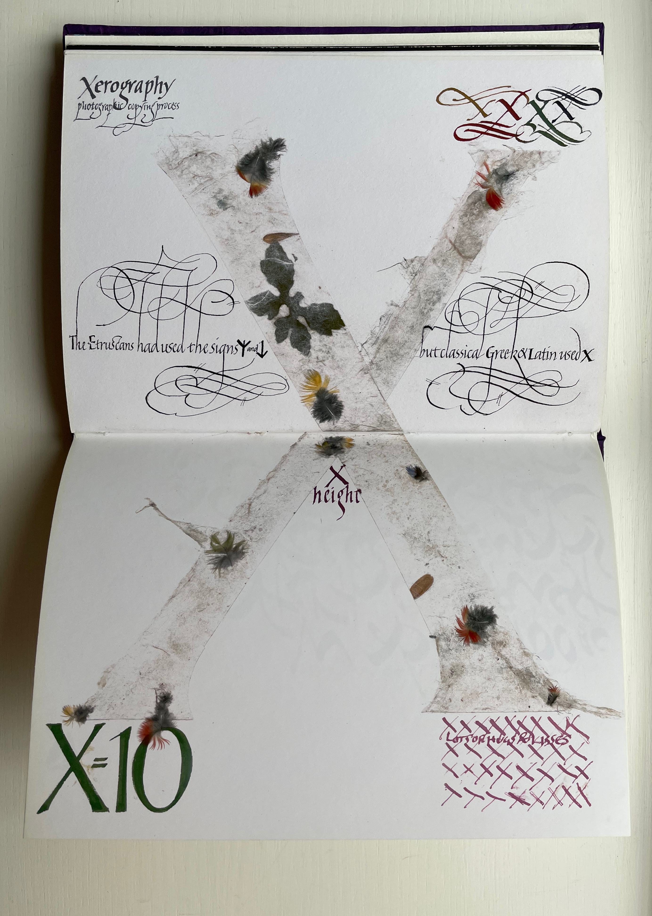 Fortunately, the accordion-fold colophon loosely inserted in the book offers pointers to some (not all) allusions. For example, the beginning of the third line for the letter V pays homage to Titivillus, the 13th-century patron demon of scribes’ mistakes. The illustrated W is an homage to Ben Shahn’s letter design. The highly contrasting thicks and thins in the letter X allude, in calligraphic terms, to the thick mark’s determining the number of pen widths making up the x height (the body of the miniscule).
