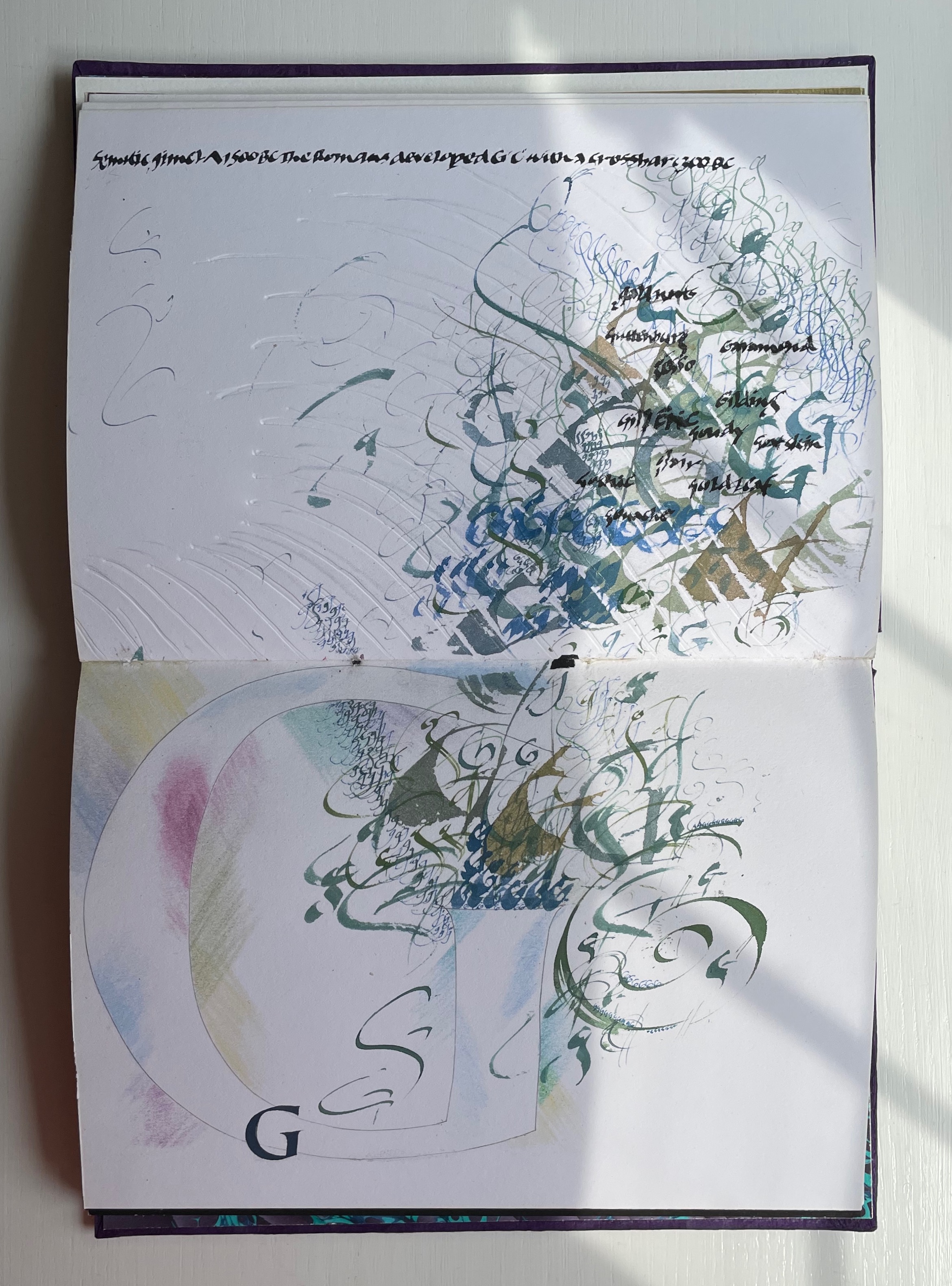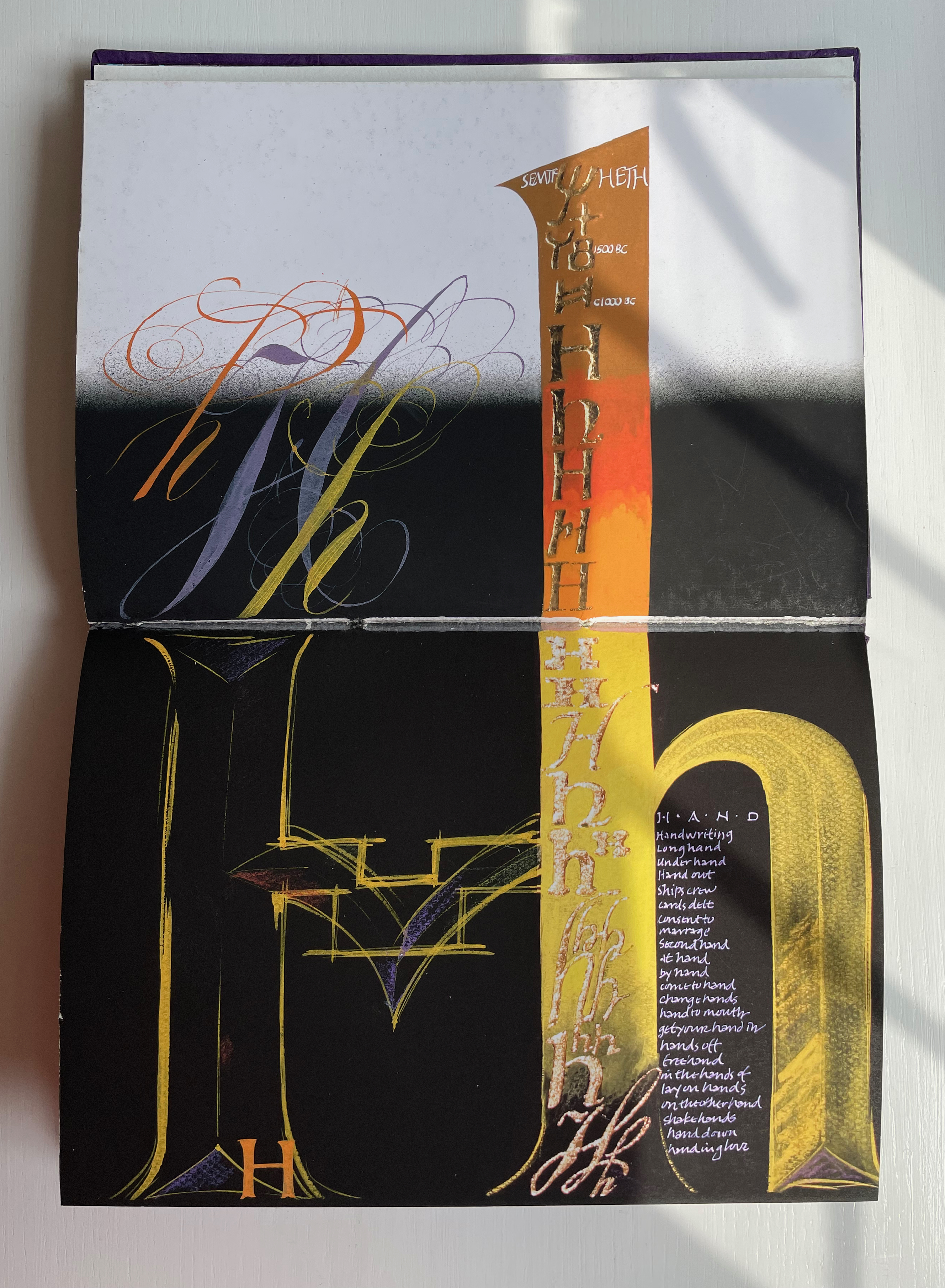 From Alphabetica‘s description as an exploration of the alphabet’s “diverse development from historic shapes to the infinite variations we see today in typefaces and calligraphic forms of the Western alphabet”, the reader might expect an academic work. The deeply embossed and debossed royal purple cover presenting the title in landscape format suggests otherwise as do the marbled endpapers and embossed gold foil title page. The cover is built up with a very strong paper made in Nepal, painted with acrylic then sprayed with semi-matte varnish. Inside, the reader finds a portfolio of twenty-five distinct “canvases” in which Wood demonstrates both historical sensitivity and artistic inspiration.