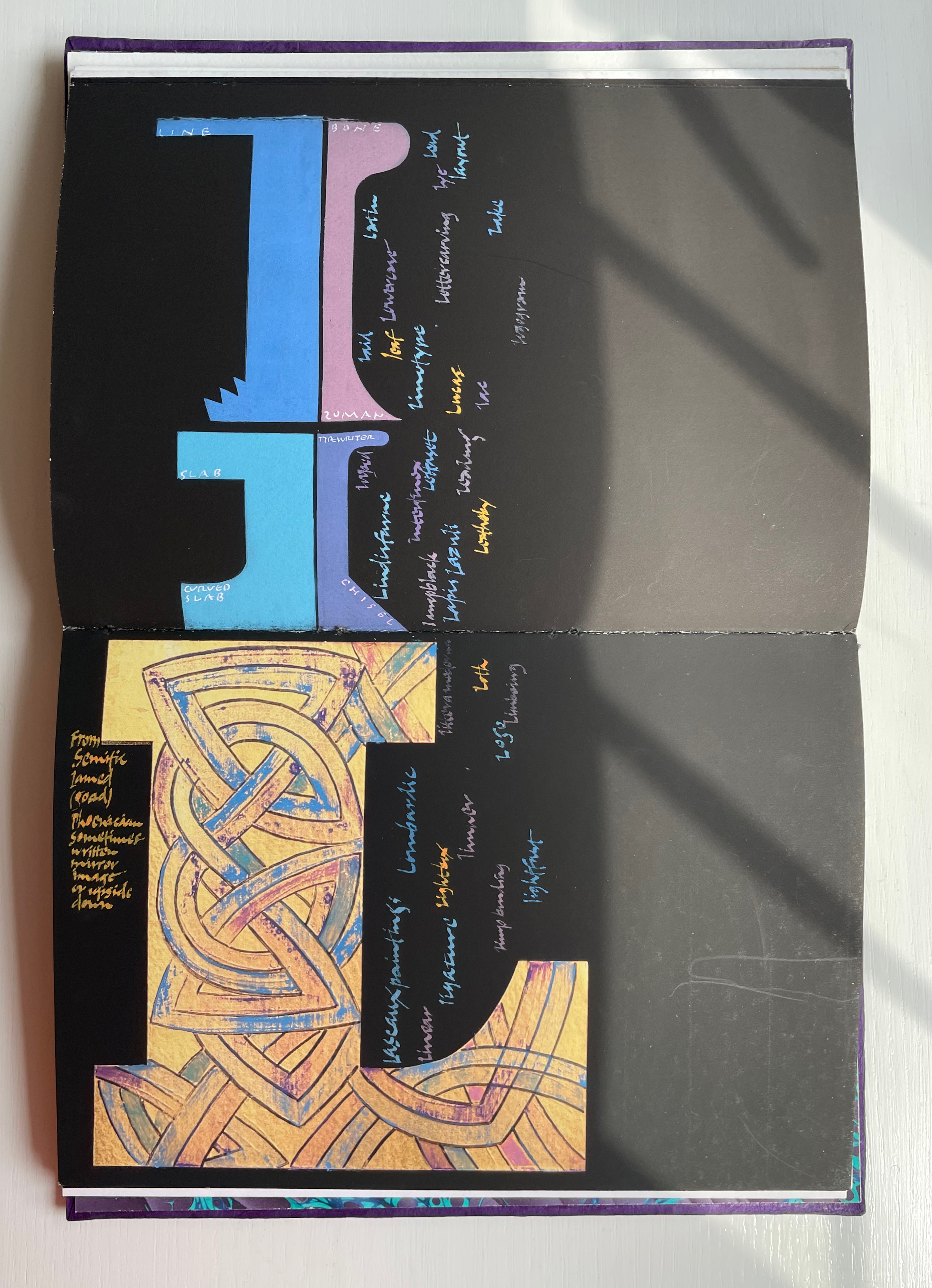 Visual puns abound. Celtic knots in a capital L (for the Lindisfarne gospels). An S formed of stones. Leaves falling from a lowercase t (for tree or tea, of course). A U growing underground.