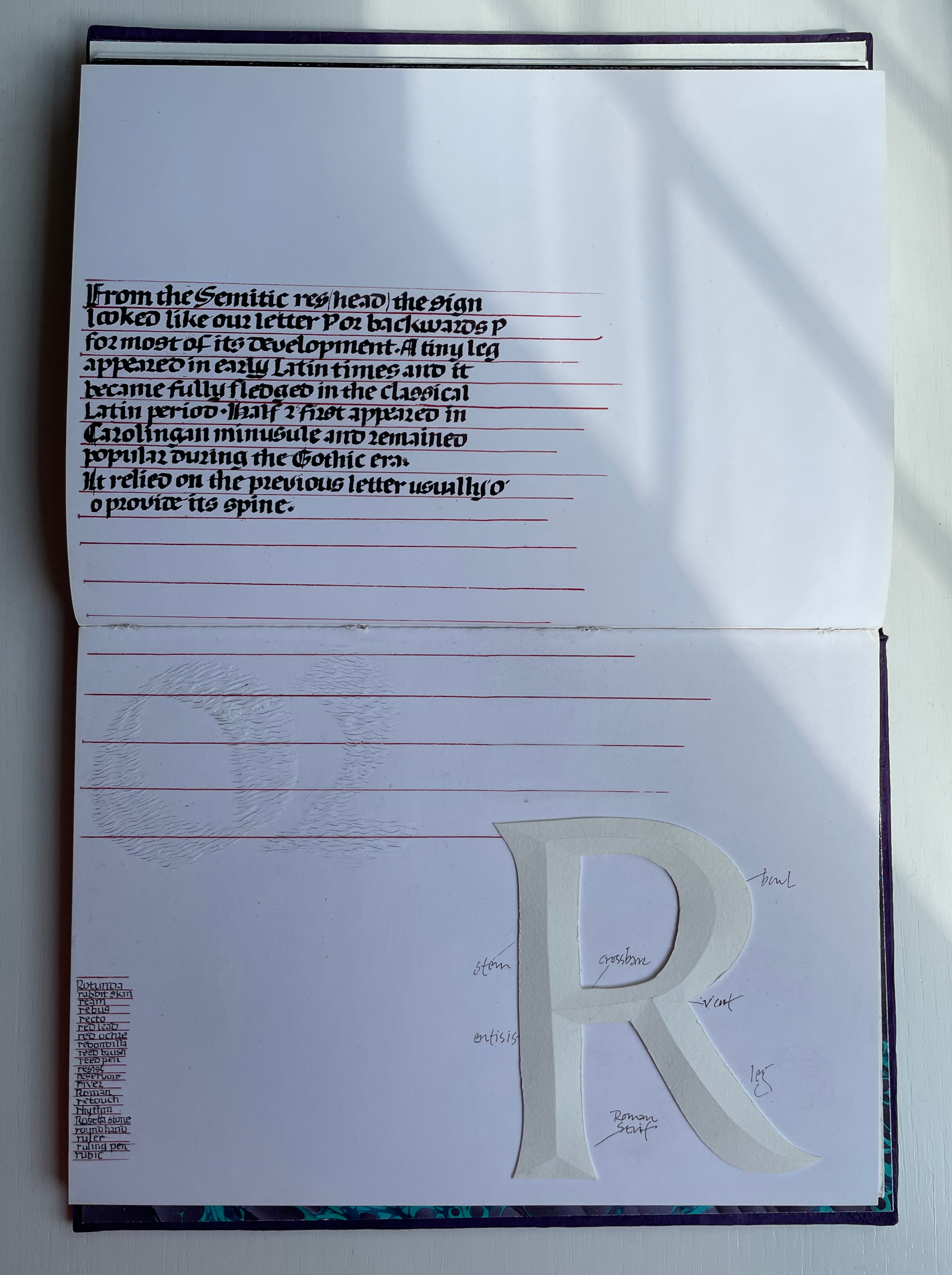 For example, the long tail of the Q does not show up until the bottom of the spread. And the reader may need to pick out the the word “or” in the text to spot the lowercase r in the textured, oversized written word “or” directly below the text.