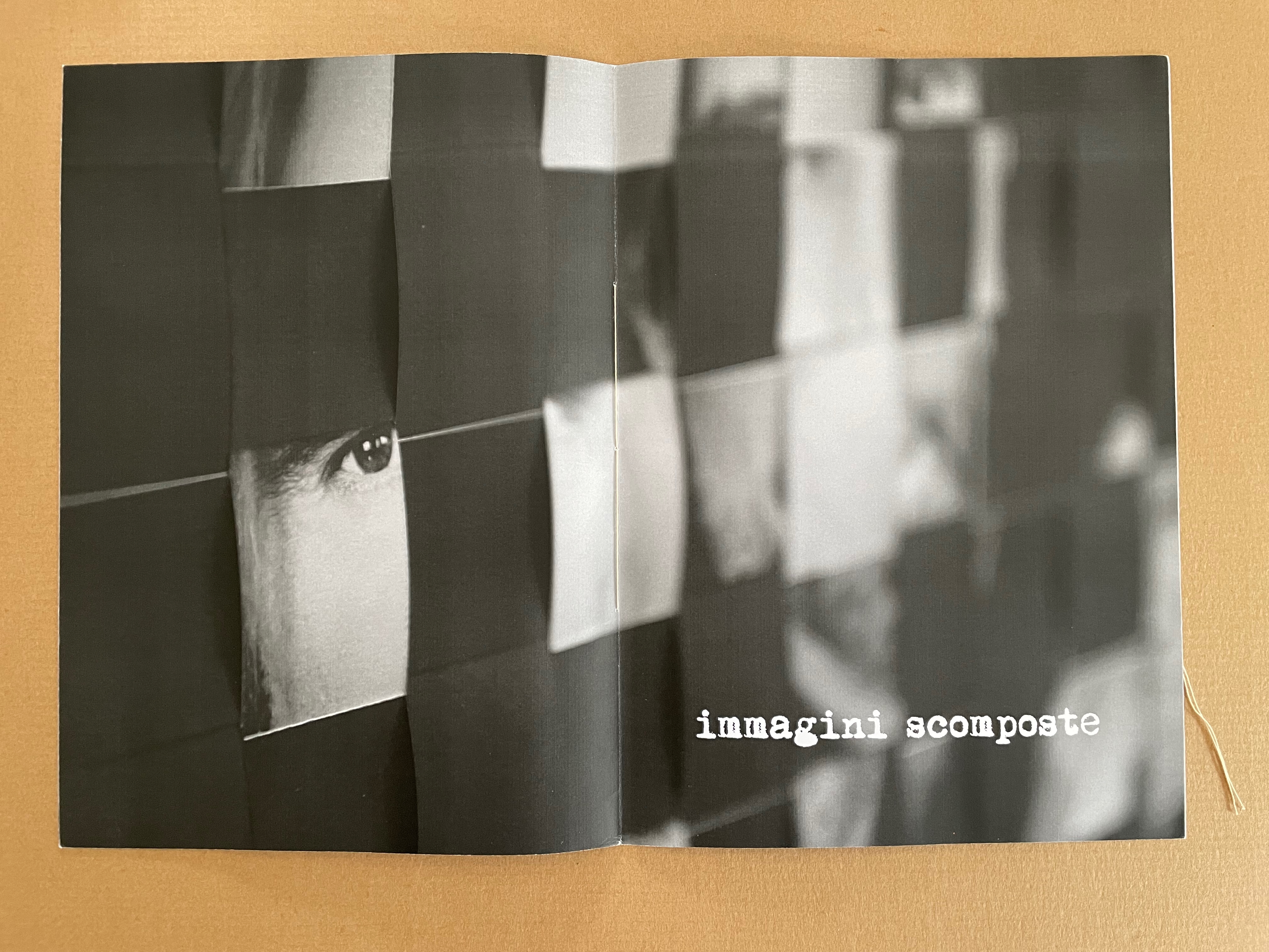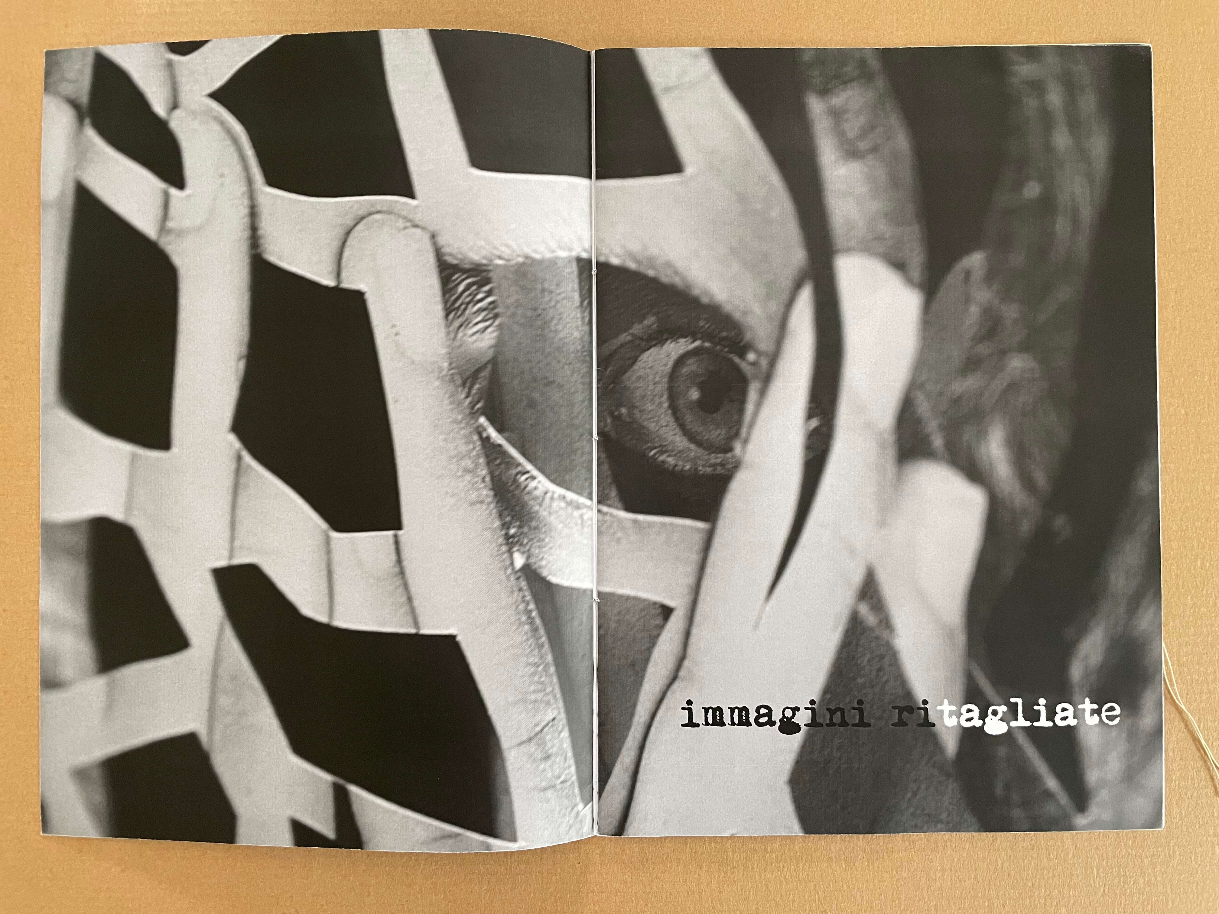 The overlaid phrases immagini ritagliate, immagini scomposte, and immagini cucite can be translated as “cut out images”, “distorted images”, and “stitched images”, respectively. On the cover of the unreadable book displayed, the words FINZIONE / “fiction” and REALTÁ / “reality” are spelled in reverse. As in libro catalogo, there is self-reflexivity at play here. Cumer plays with the word ritagliate by printing ri in black and tagliate in white, creating two verbs — ritagliate (“cut out”) and tagliate (“cut”), which apply to the word itself, the technique in the poster displayed, and the fragment of it blown up on the double-page spread. By blurring the image on the recto page of the second double-page spread, she makes the spread play out the meaning of scomposte — “distorted”. And in the third spread, she playfully stitches over the word cucite — “stitched” — which comments not only on the word but also on the stitched unreadable book on the verso page.