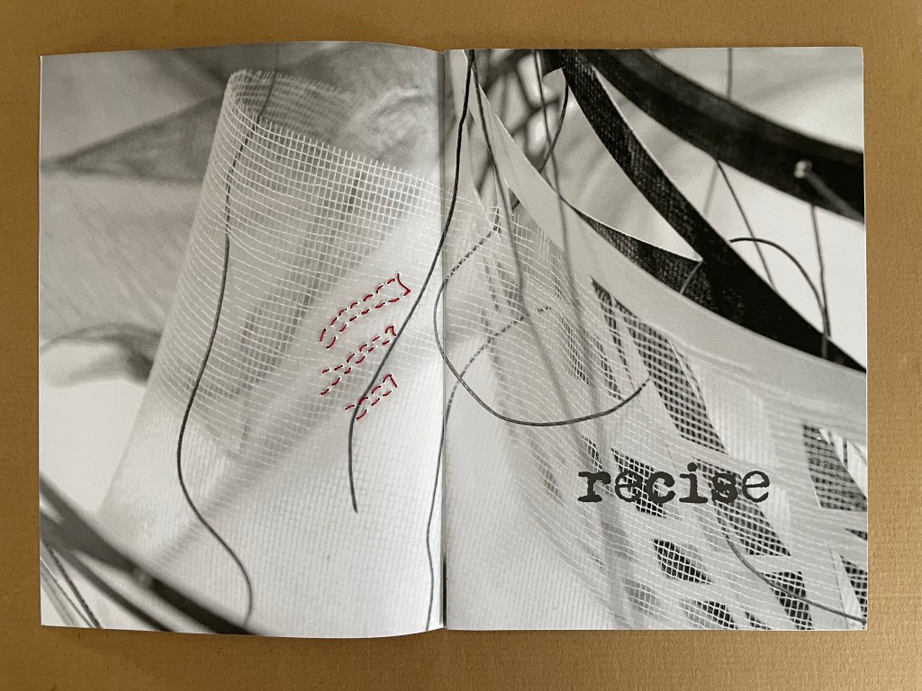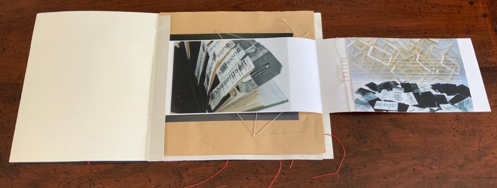 When the image of città / “city” folds out to the right, photographs of two more works appear: desiderio di … arte / “desire for … art” (2012) and illusione – delusione / “illusion – delusion” (2012). The image of desiderio highlights Cumer’s use of the flag book structure, although there is structurally much more to that work’s composition. The parallel threads that extended over the photo of cittá on the other side of the fold-out now pierce the photograph of illusione – delusione.