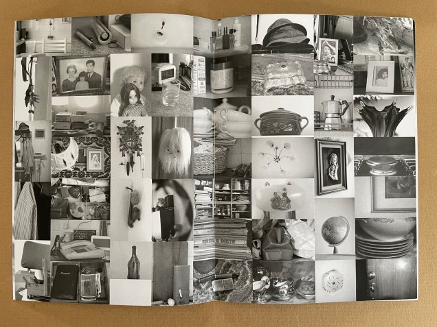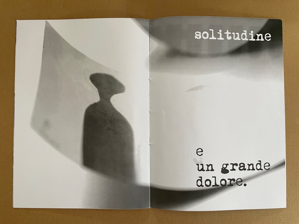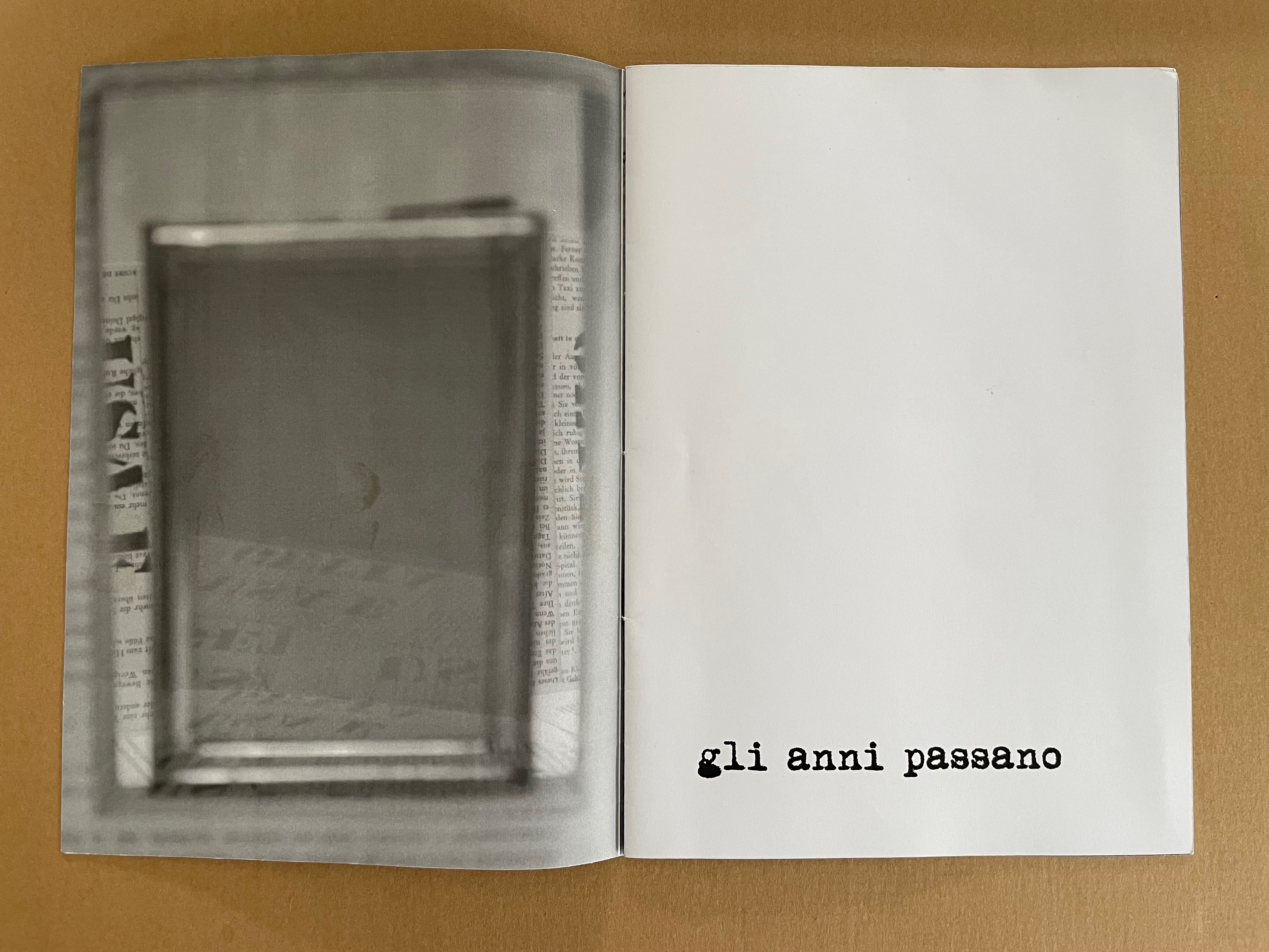 As the richly textured and gold-leafed cover turns, notice how Cumer presents the image of the catalogue’s first work: Parole non dette, frasi in sospeso / “Unspoken words, unfinished sentences” (2018). Split and pasted on two sides of the first folio, the glossy photograph of Parole non dette reunites with precise registration in the center of the folded folio.