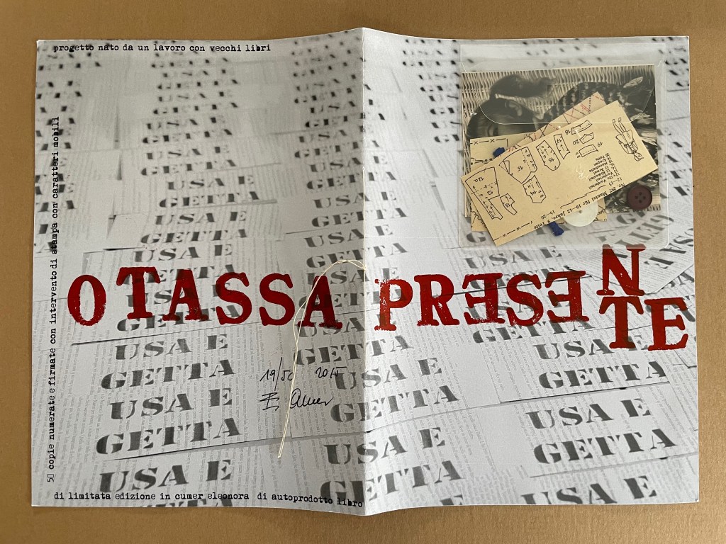 Whether read as otassa presente or presente otassa, the translation of this sewn booklet’s title comes out the same: a present tax. The phrase in the background — usa e getta — stamped over ghosted images of cutout book pages means “disposable” and is used as the title of a 2014 work. The ghosted book pages come from the Italian edition of Mario Puzo’s last novel Fools Die, a Hollywood/Wall Street potboiler. The front cover’s sealed plastic envelope containing cut-up sewing patterns, buttons, thread and an old photograph of a little girl wearing a knit shawl and sitting in a white wicker chair makes the intriguing juxtapositions only more so. What do these collaged and assembled elements have to do with one another?