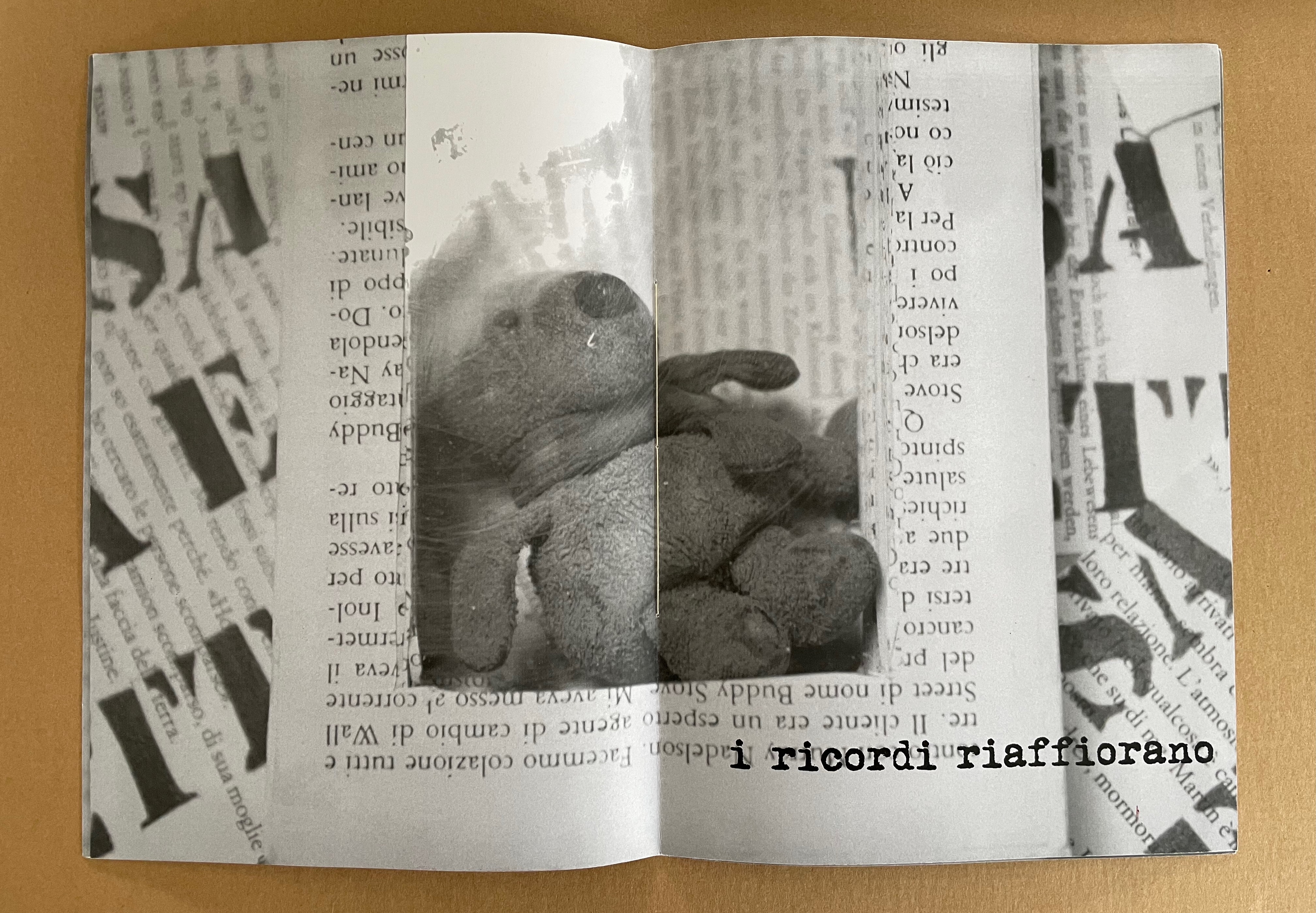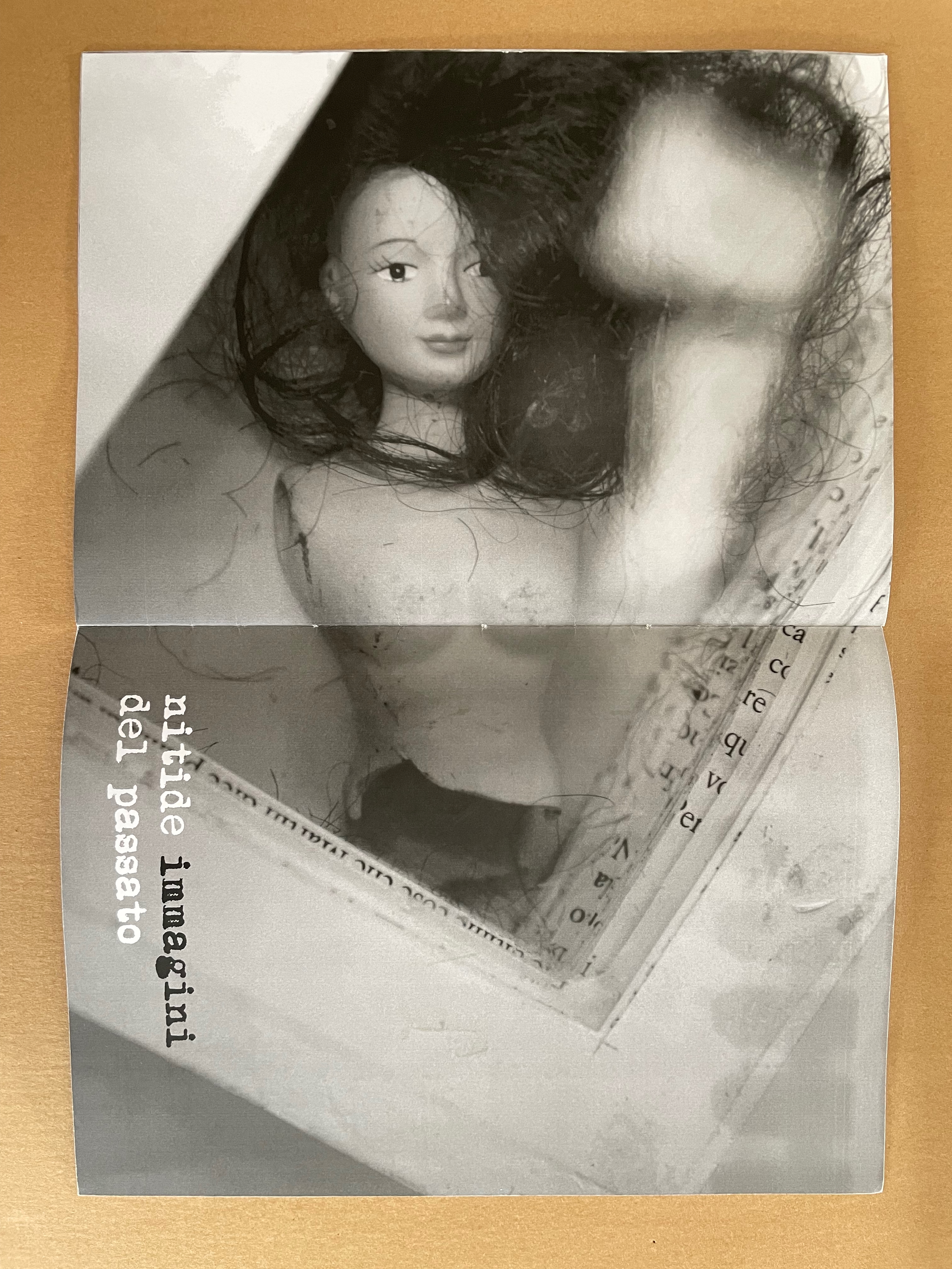 Some clarity dawns with phrases on the interior pages: gli anni passano (“years go by”), i ricordi riaffiorano (“memories come back”), and nitide immagini del passato (“clear images of the past). “Disposable” alludes not only to the novel whose pages wallpaper the cover and interior pages but also to Cumer’s work of the preceding year — USA E GETTA (2014), a series of unique altered books. The series is the source of the images inside PRESENTE/OTASSA. Each shows a hollowed-out book with an object held in place between clear plates — a picture frame (empty except for the reflection of the foreground — the rest of the work it comes from), a stuffed toy, and a broken dress-up doll. Things of the past that in general are disposable (like sewing patterns no longer needed or broken dolls) nevertheless come back as clear images: a tax on the present.