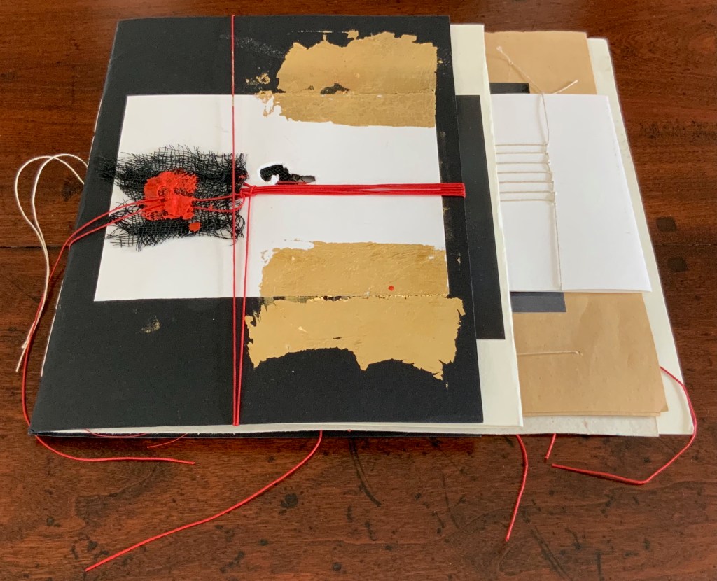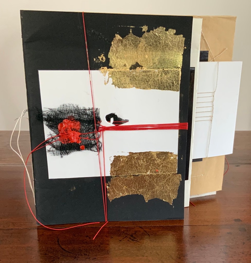 libro catalogo con interventi manuale / “book catalogue with manual interventions” (2019) Eleonora Cumer Sewn booklet, various papers including photographic, gold leaf, thread, mesh, string, wax. H200 x W220 (variable) mm. [16] pages. Unique. Acquired from the artist,. Photos: Books On Books Collection.