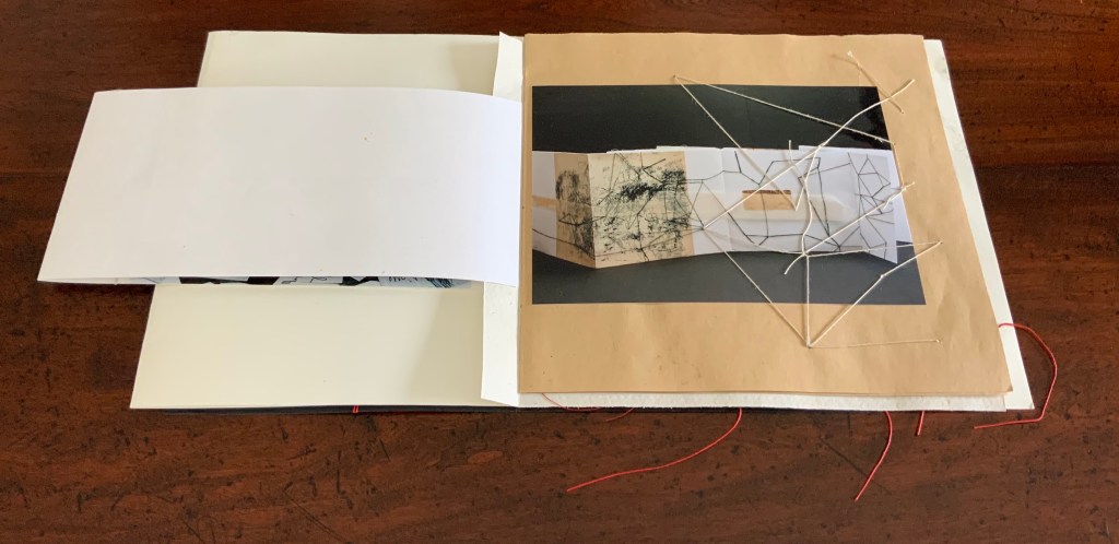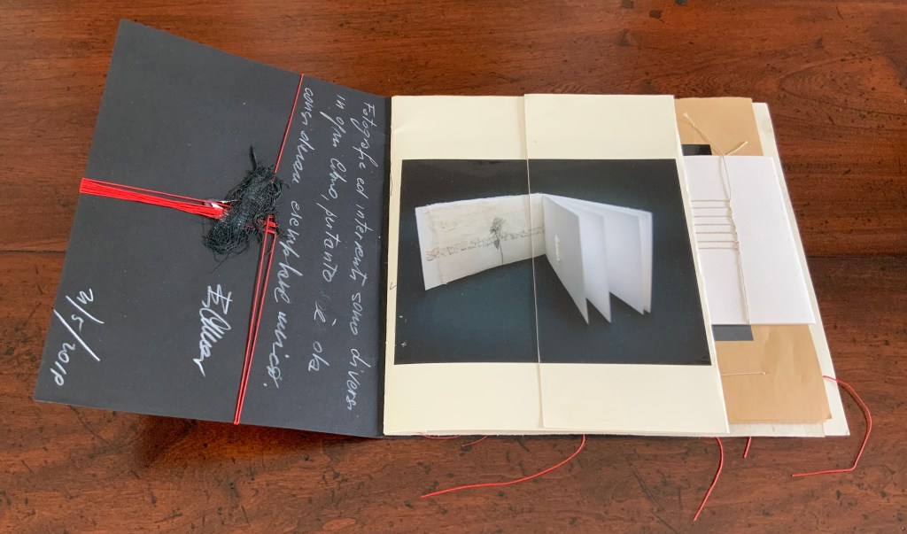 The next work to appear — il libro segreto /”the secret book” (2018) — carries on with the intervention and penetration by thread. The patterns formed by the thread reflect and extend those which can be seen in the photograph of il libro segreto. Leaping out of the photograph and penetrating the supporting brown paper folio, the thread introduces a new motif that will recur in just a few more pages.