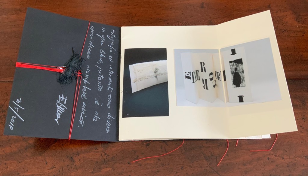 The theme of memory continues in radici/ in memoria dei miei genitori / “roots/ in memory of my parents” (2015) but perhaps more poignantly than in presente/otassa. Drawing on the previous works moltitudine e solitudine/ “multitude and solitude” (2013) and no time no space (2015), the booklet also evokes Cumer’s passion for textile and fabric art. The small image of a sewing box in the lower left hand corner of the central spread may speak to a parental source of that passion, but the words on the other spreads — recise and solitudine e un grande dolore (“severed or sever or cut” and “loneliness and a great sorrow”) — turn that central spread into a collage of loss almost more so than a collection of memories. It is one of the more somber works by Cumer in the Books On Books Collection.