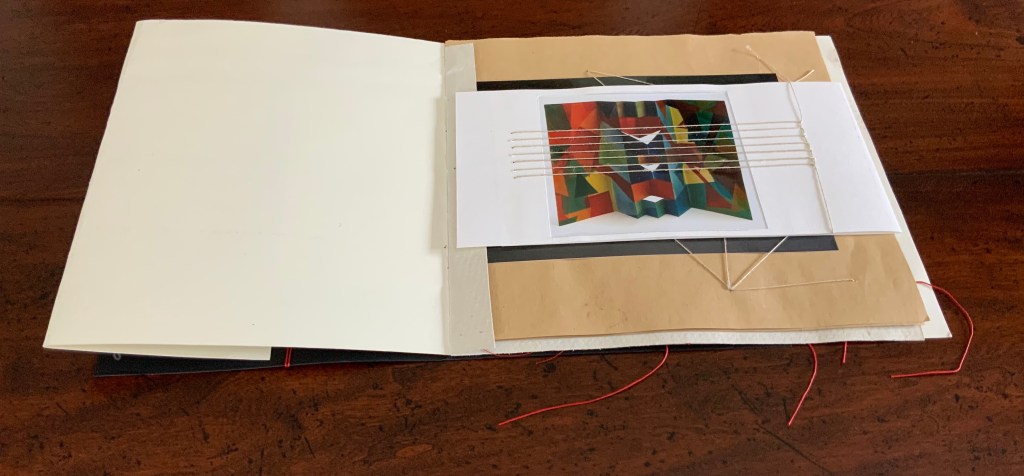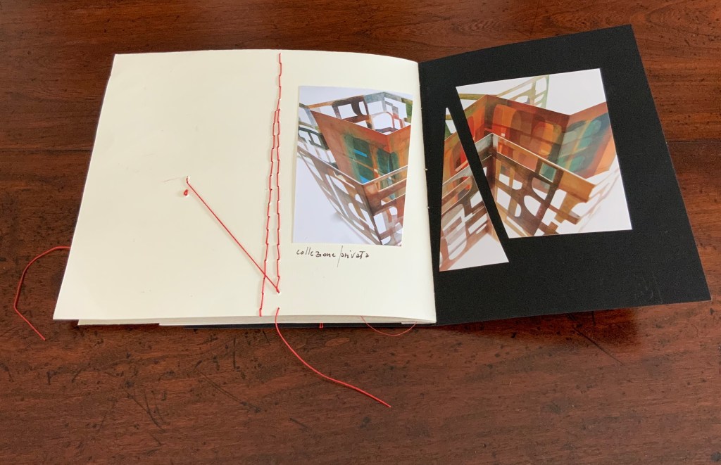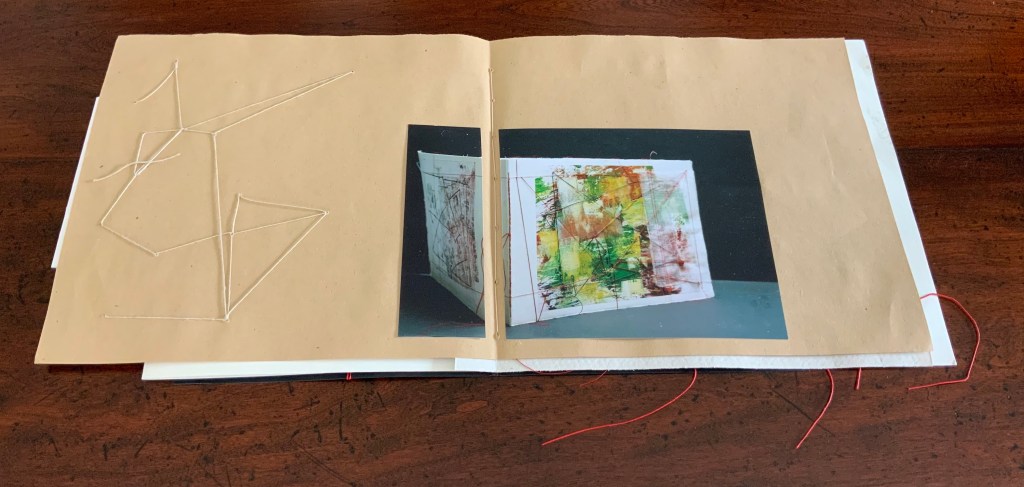 The final work in the catalogue — visioni urbani / “urban visions”(2015) — resides in the Books On Books Collection. More about it can be found here. Threads do not make an appearance in visioni urbani, but their triangular appearance here does reflect on urbanivisioni. If the space to the left of the red stitching can be counted as a page, this is a “three-page” spread echoing the three-way split of the photo of the work, which echoes the tripartite physical structure of the work itself.