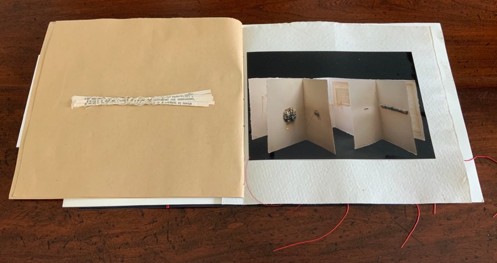 No intervention occurs in the photograph of cancellazioni e riscruttare / “cancellations and rewritings” (2018). No cuts, no folds, no threads, but on the facing verso page, Cumer brings to life one of the cancelled/rewritten objects that can be seen in the photograph. Just as in fili intrecciati, the thread-bound bundle of strips of cut text has leapt from two dimensions to three dimensions, highlighting again how Cumer uses the flat and multiple surfaces of book structure as well as the materials and techniques of bookmaking to re-teach us how juxtaposition works artistically on the flat surface of collage and the multiple surfaces of assemblage.