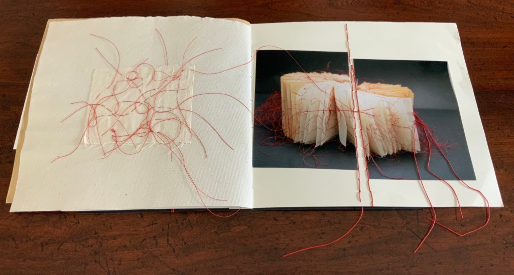 Here is where the variation on the two dimensional becoming three dimensional introduced by il segreto libro recurs. Defying the gutter’s separation of the tartalan sample from the whole work and the severing of the photo on the recto page, threads from the sample cross the gutter, fall across one half of the photograph, and link up with the severing stitch. The thicker thread of the severing stitch passes under the other half of the photograph to exit from it on the right and fall across the image of red threads similarly exiting the work itself. The ways in which this double-page spread speaks to the self-reflexive nature of book art and the paradoxical relationship of art to what it re-presents are remarkable.