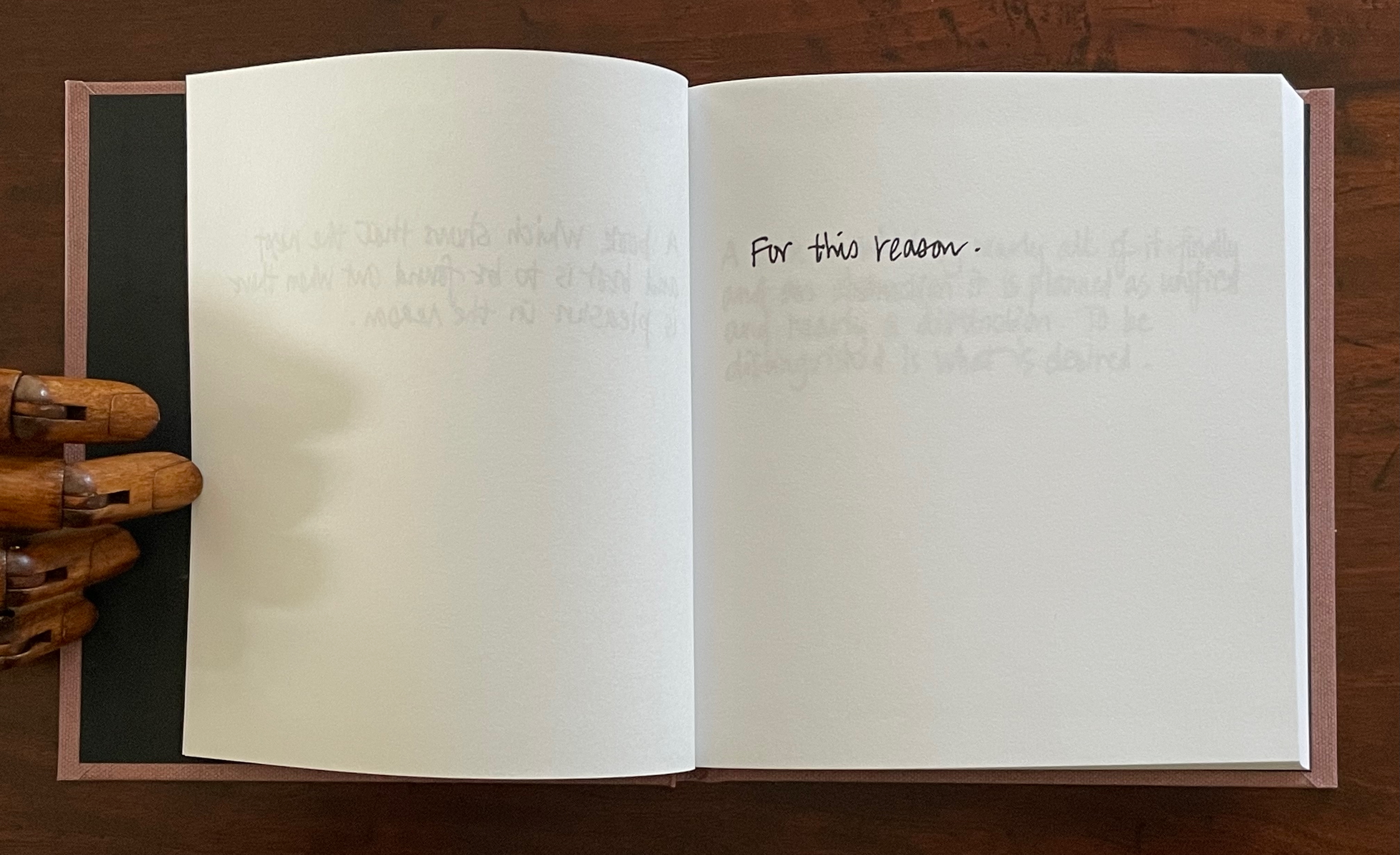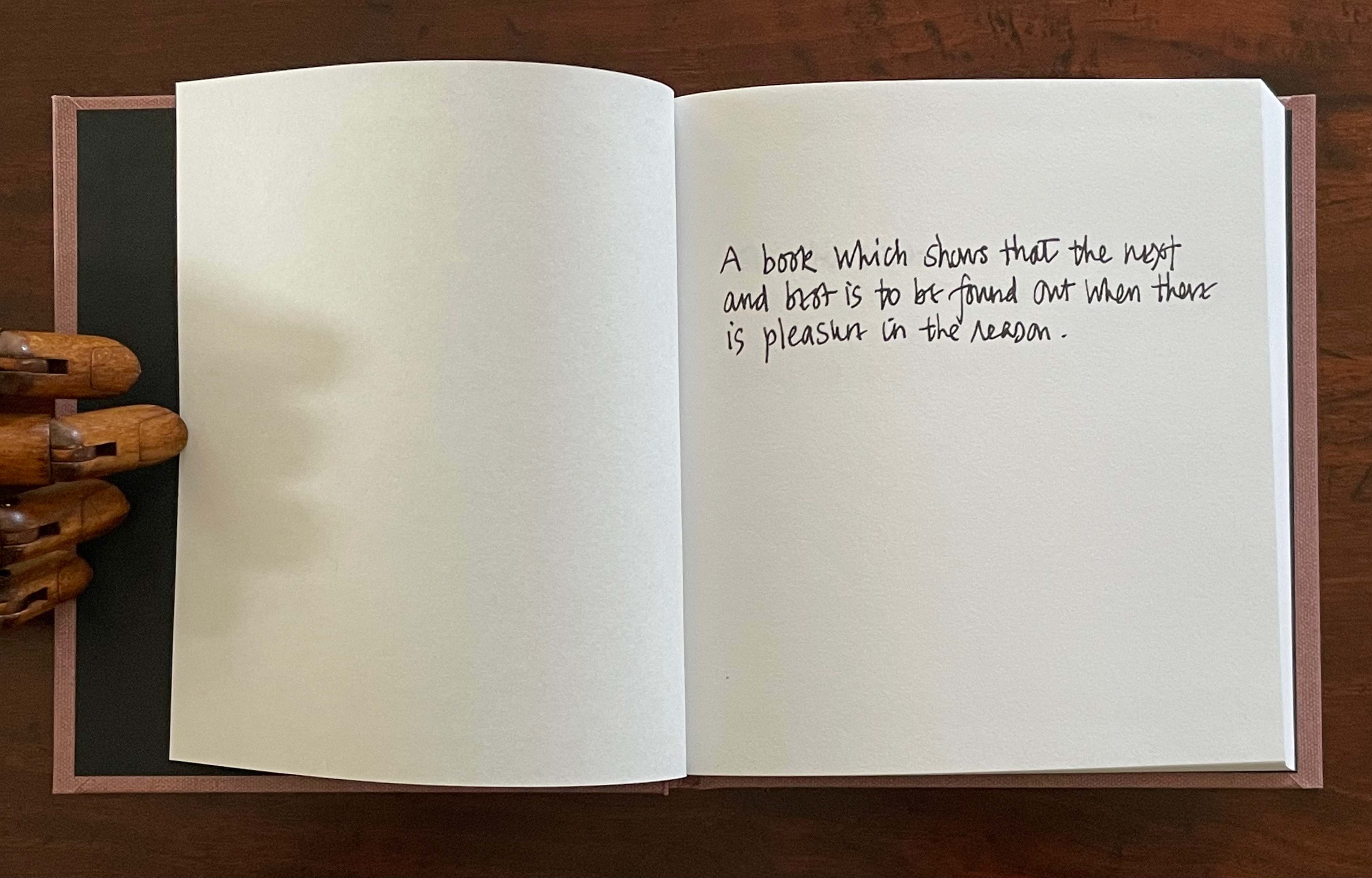 Appropriation has its reasons. Gertrude Stein’s description of literature with which Erica Van Horn begins her scribal appropriation of sixty-six of Stein’s exacting and elusive apothegms is particularly appropriate. In the brief afterword, Van Horn explains that she has always been proud of her handwriting and loves writing by hand. So, this book “shows that the next and best is to be found out when there is pleasure in the reason” as its next folio shows: Van Horn’s pleasure in the reason is her pleasure in the reason.