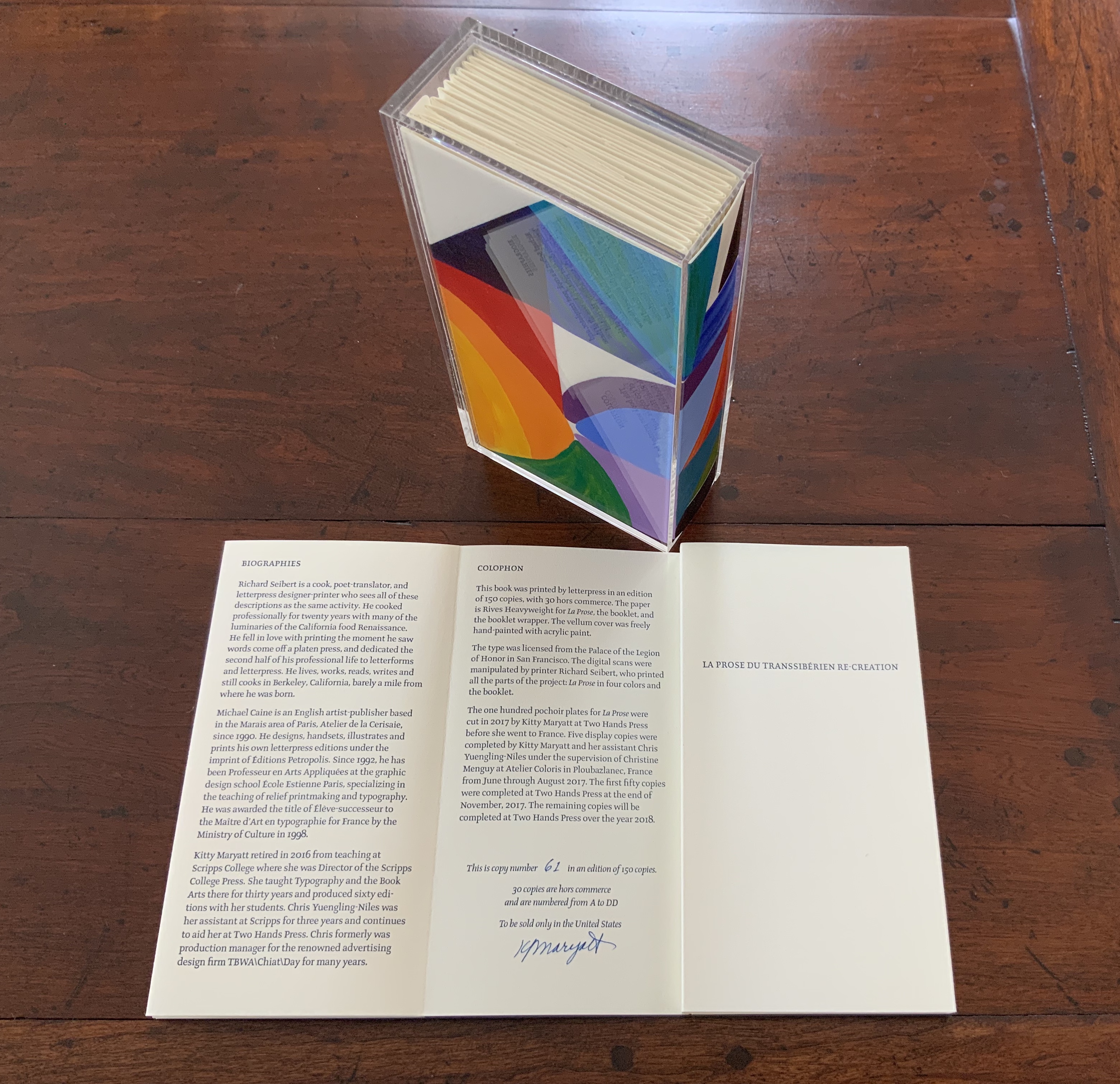 The colophon’s underlying value or purpose warrants book artists’ thinking about recording it offline and online, though this might be stretching the definition of the colophon. Our enjoyment of Kitty Maryatt’s 2018 reconstruction of La prose du Transsibérien et de la Petite Jehanne de France (1913) by Blaise Cendrars and Sonia Delaunay is certainly enhanced by the “colophonic” booklet she included with the work and the “About” page online.