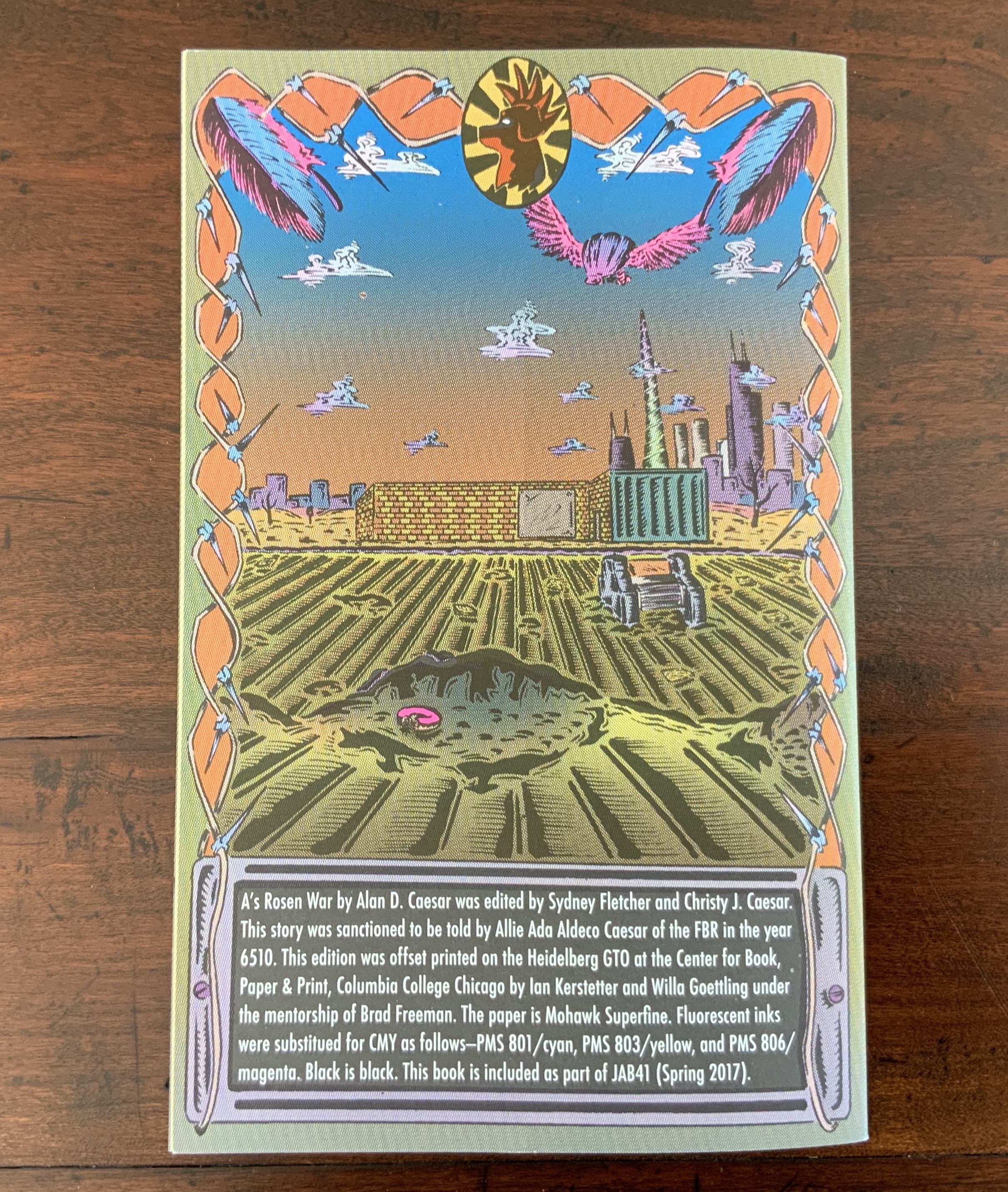 This colophon continues the premised date with which this work of science fiction book art begins.