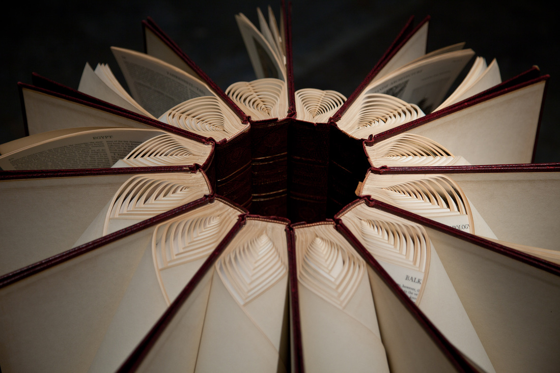 In her note in BookRiot, Nikki Steele takes Brian Dettmer’s  TED talk remark that books are created to relate to our human scale and builds on it elegantly, if all too briefly, by bringing together the installation works “Literature versus Traffic”, “Scanner”, “Book Cell”, “Singularity”, “Biographies” and “Contemporaries”. She’s not the first to provide a Pinterest– or Flickr-style burst of “ooh, look at this”, but unlike her predecessors, she makes the point worth pondering: this art that is not on a human scale evokes wonder and awe.